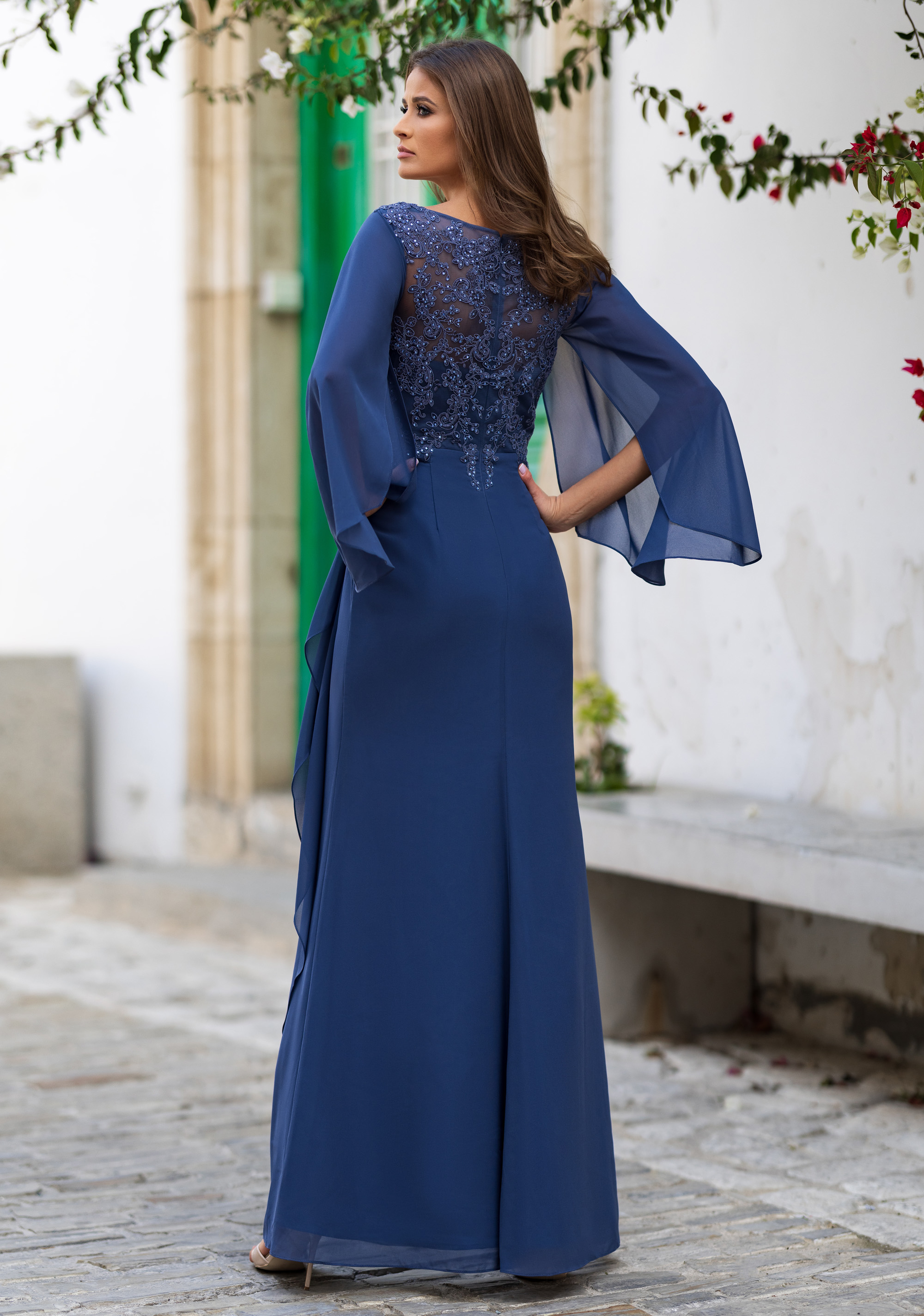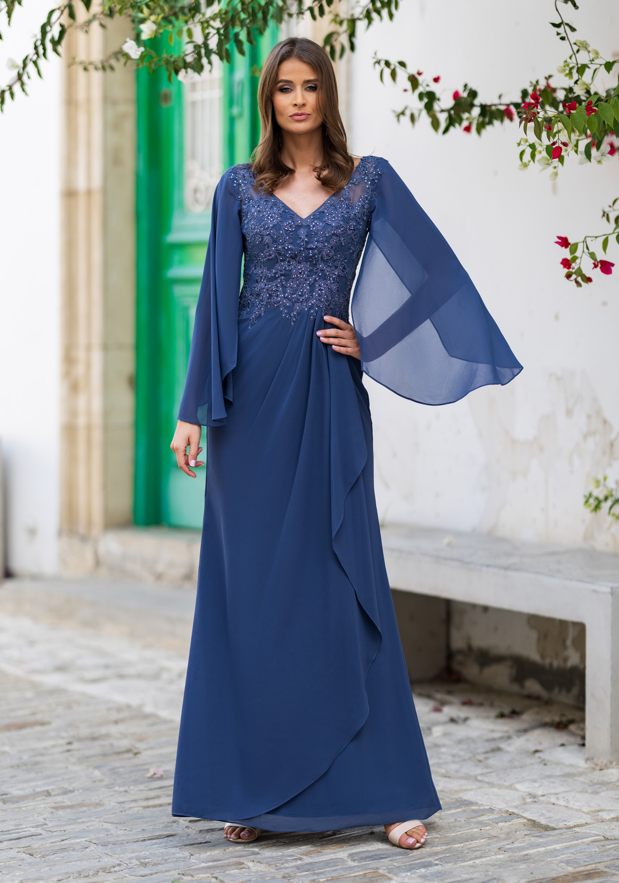 Abito cerimonia donna curvy lungo realizzato in tessuto di chiffon color blu polvere con corpetto pizzo ricamato e maniche ampie e fluide.