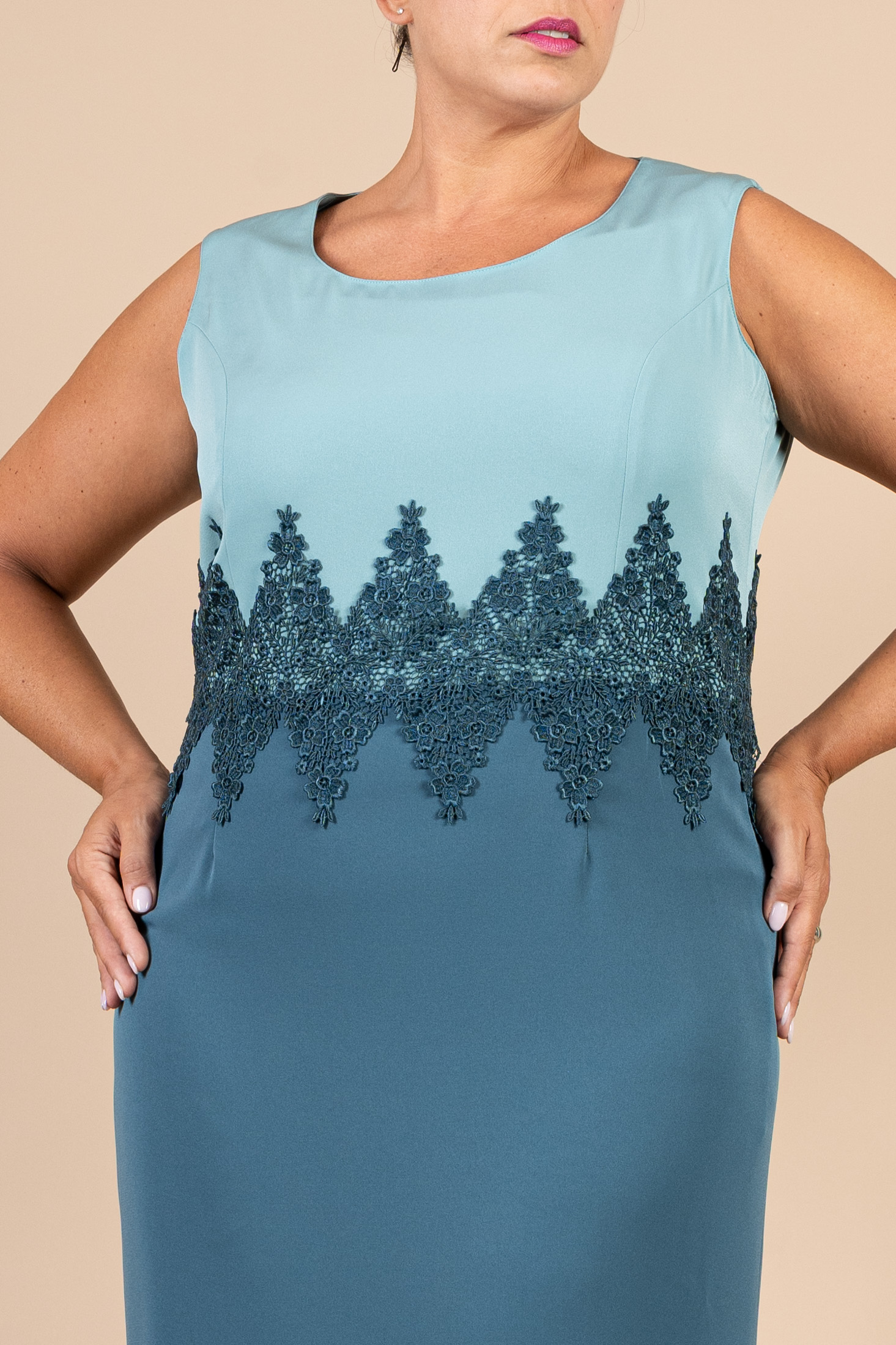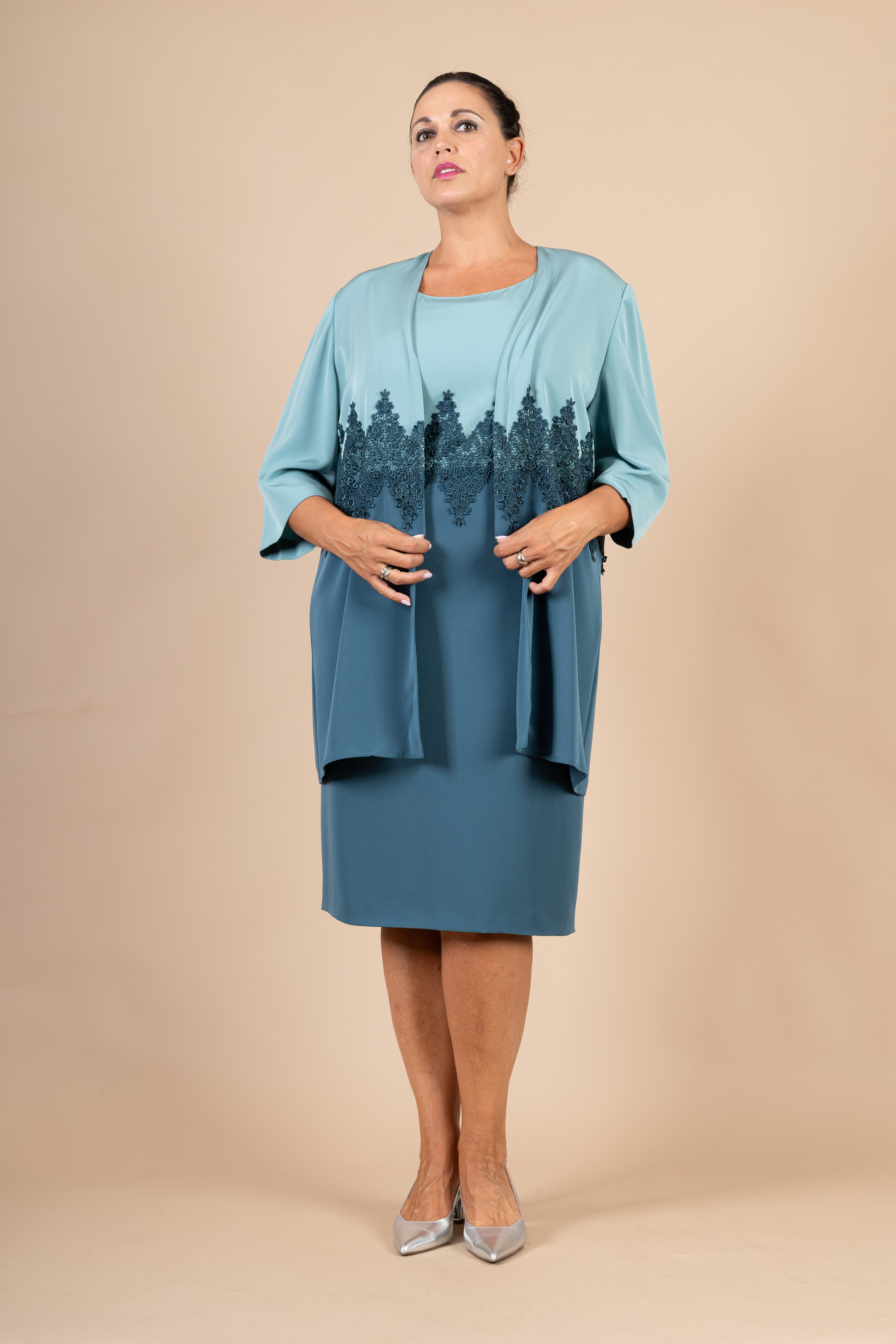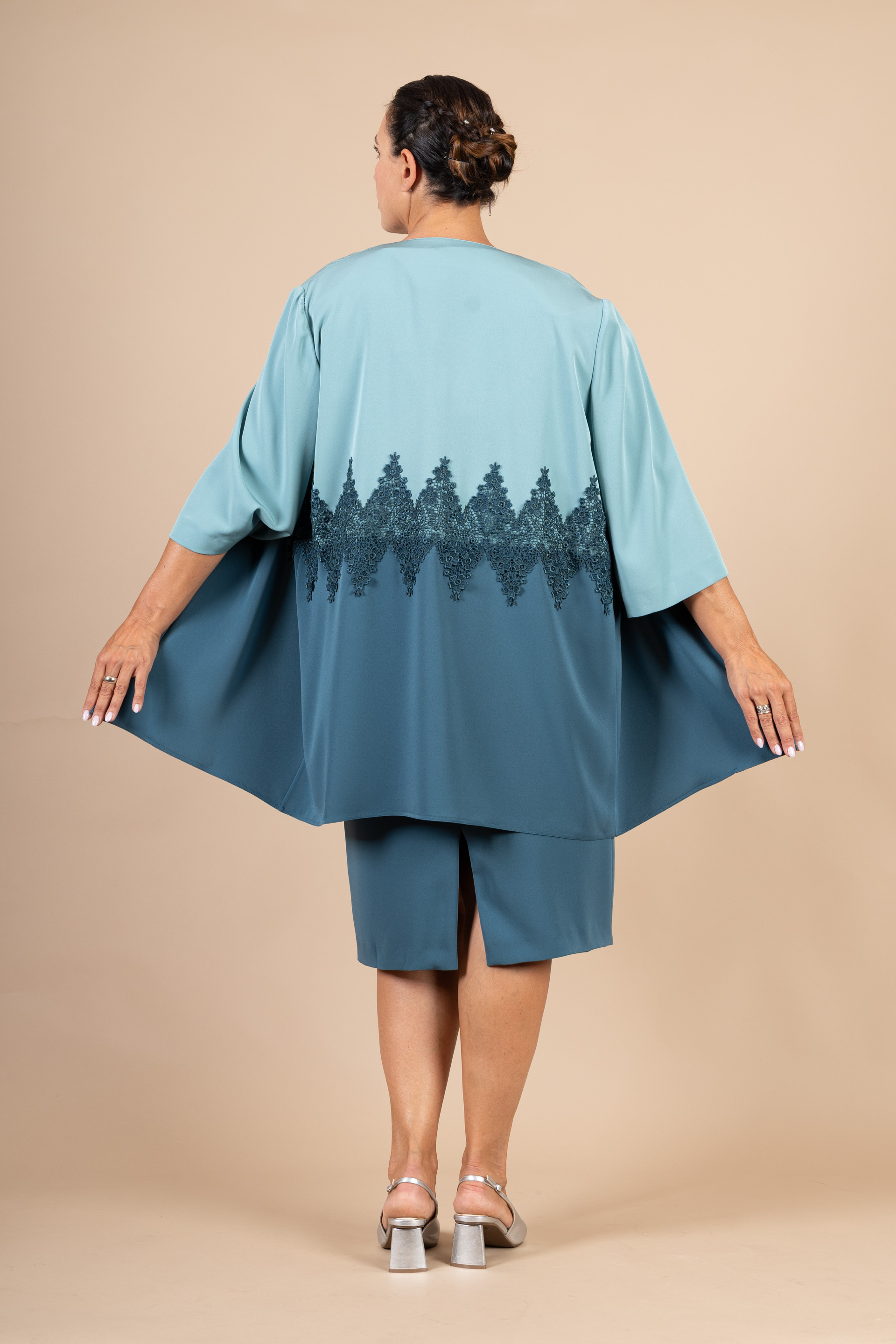 Completo cerimonia donna color verde chiaro e scuro realizzato in tessuto cady ed impreziosito da applicazioni di pizzo macramè, composto da tubino bicolore smanicato e soprabito.