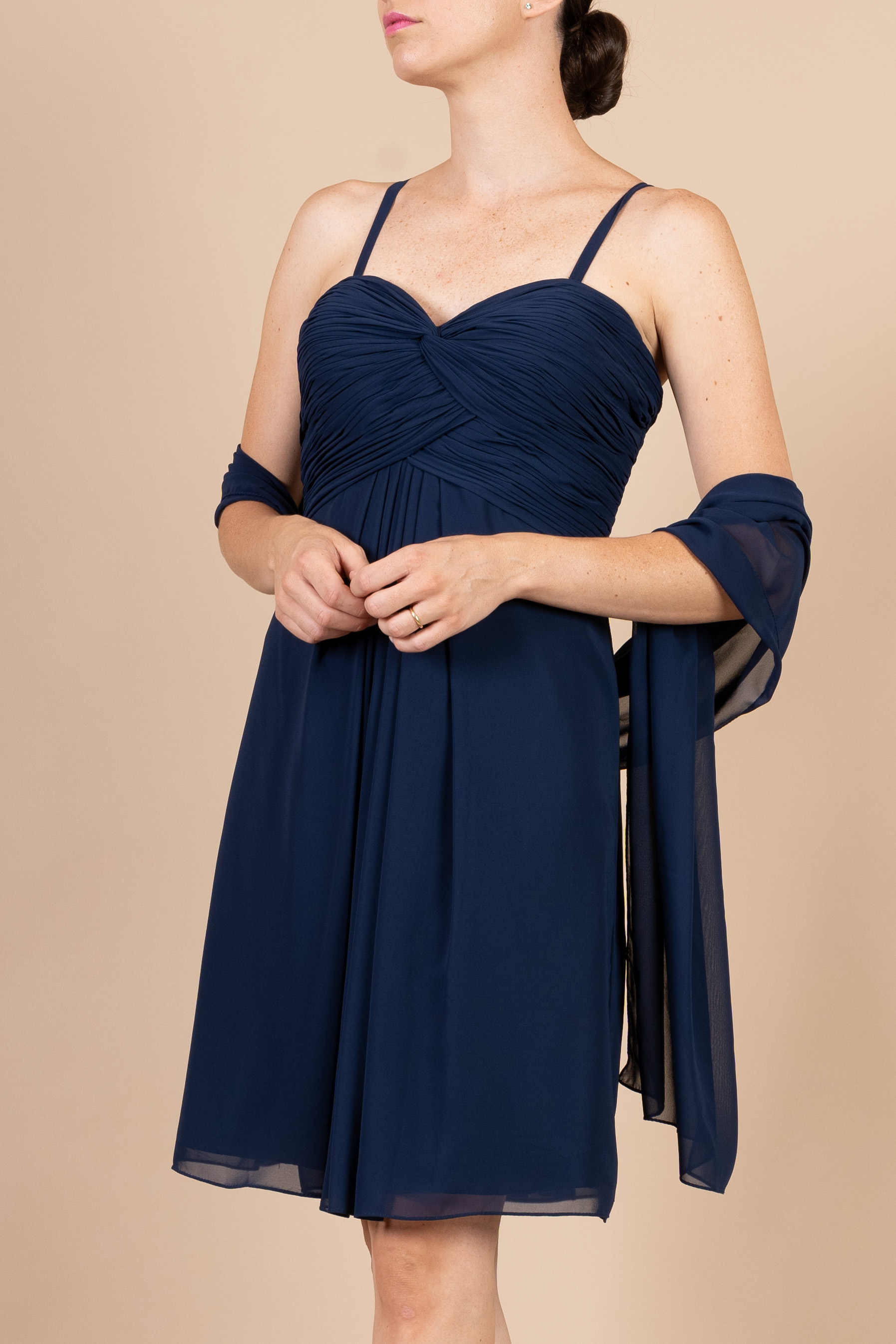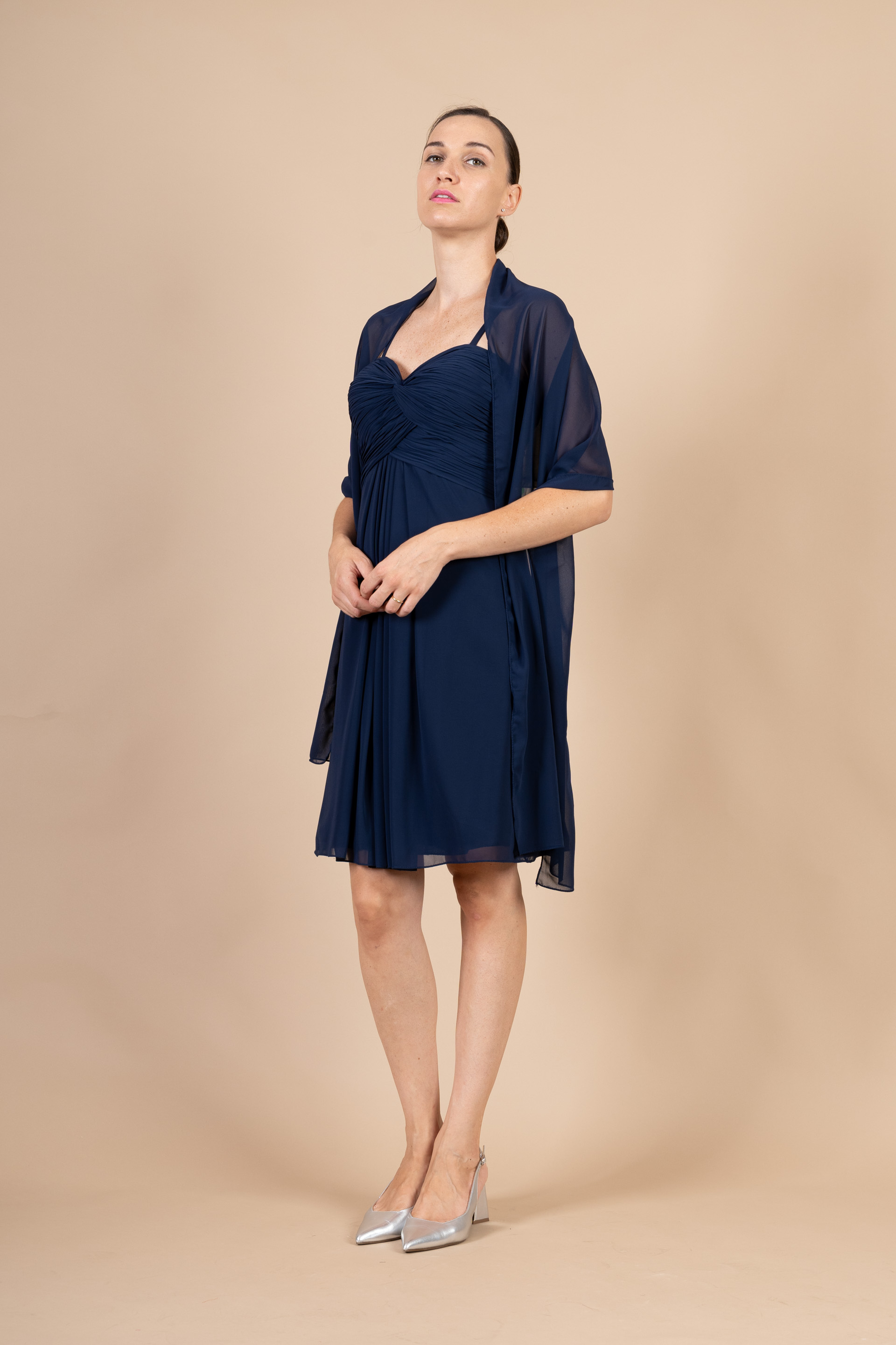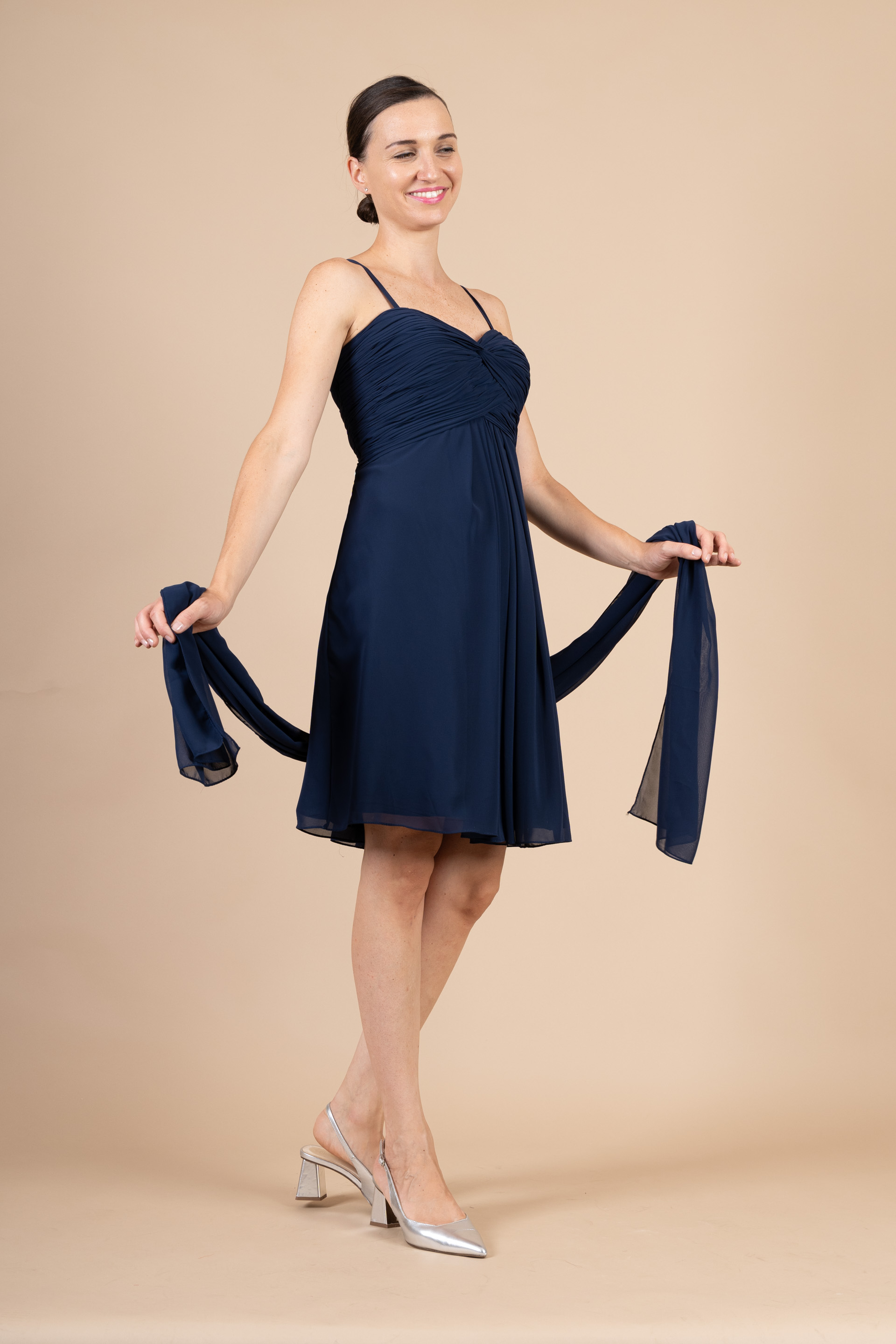Abito cerimonia ragazza corto con spallina realizzato in tessuto di chiffon in colore blu notte con spallina sottile impreziosito da drappeggio sul seno.