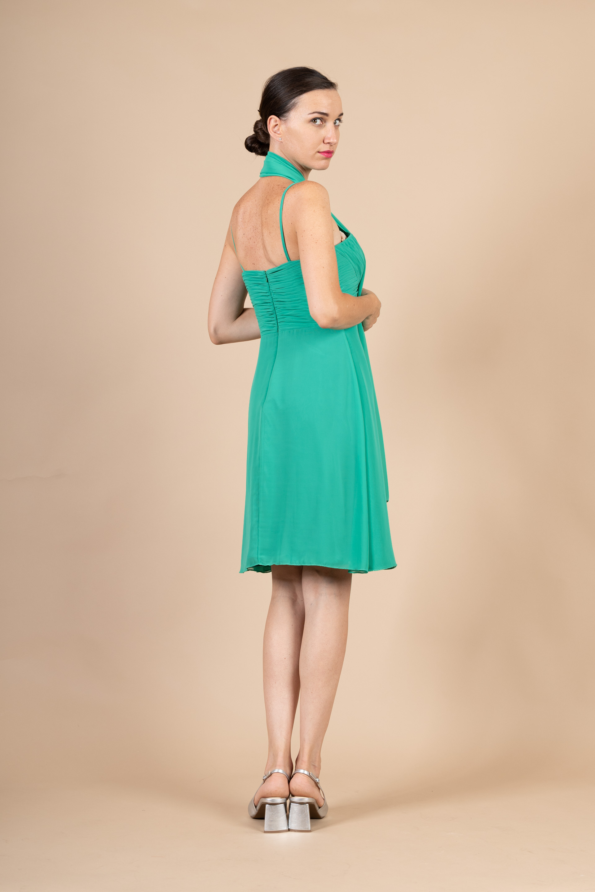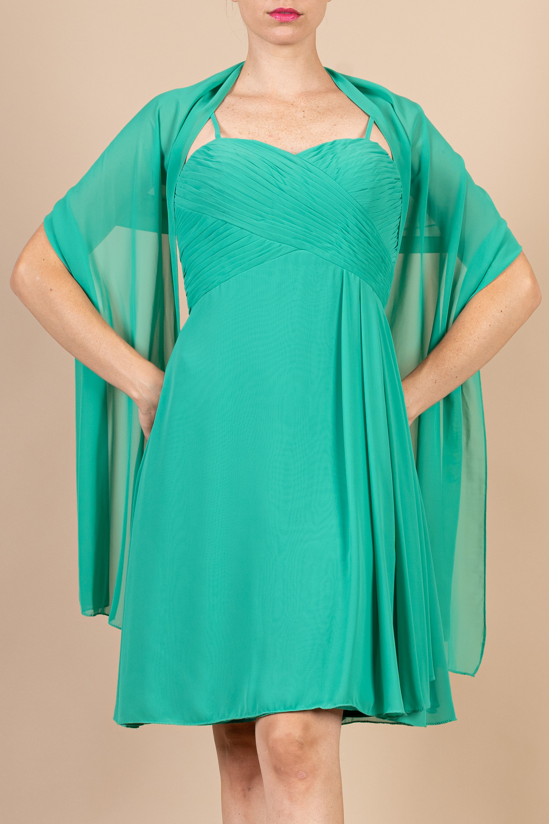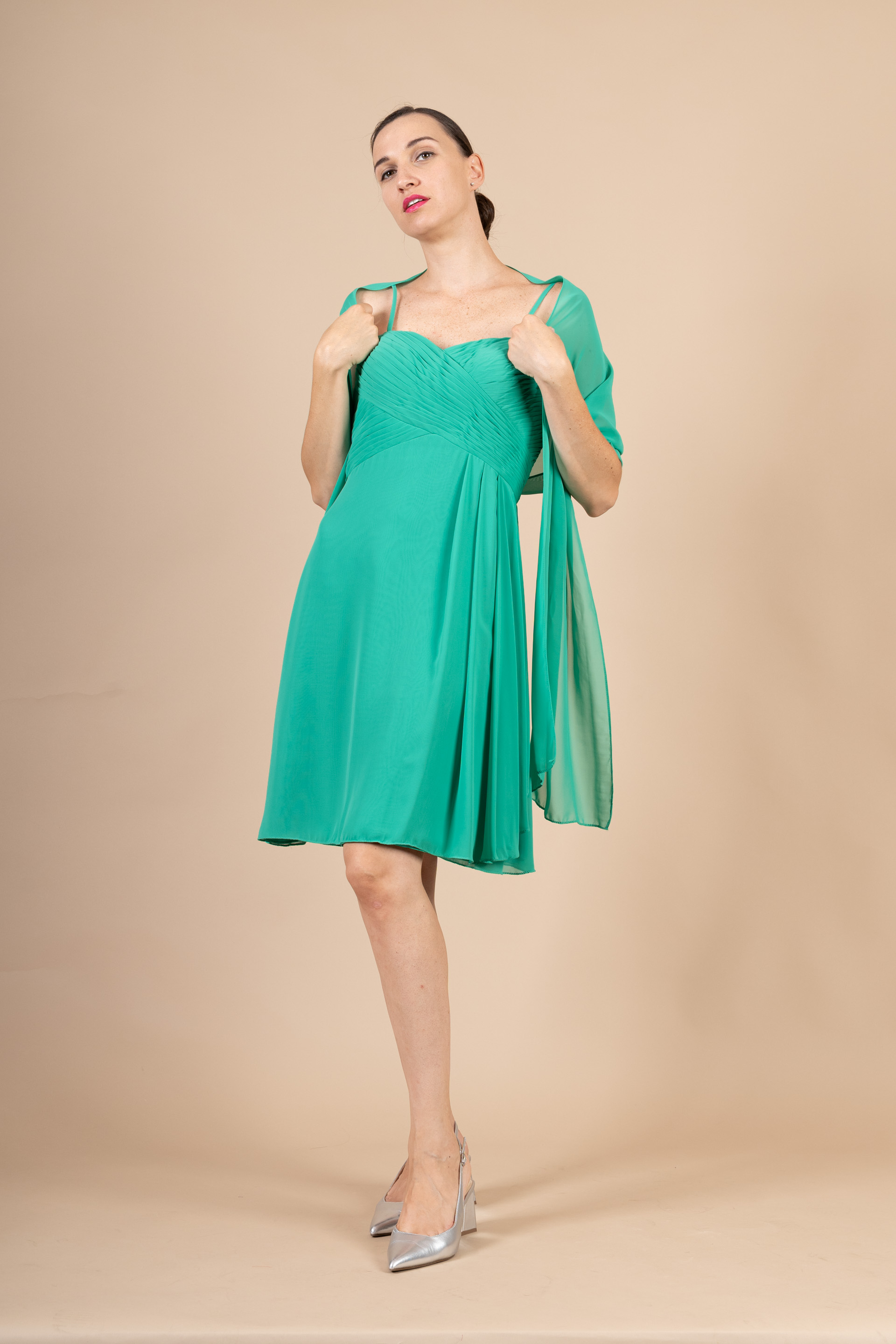 Abito cerimonia ragazza corto dalla linea scivolata realizzato in tessuto di chiffon verde con corpetto drappeggiato e spalline sottili.