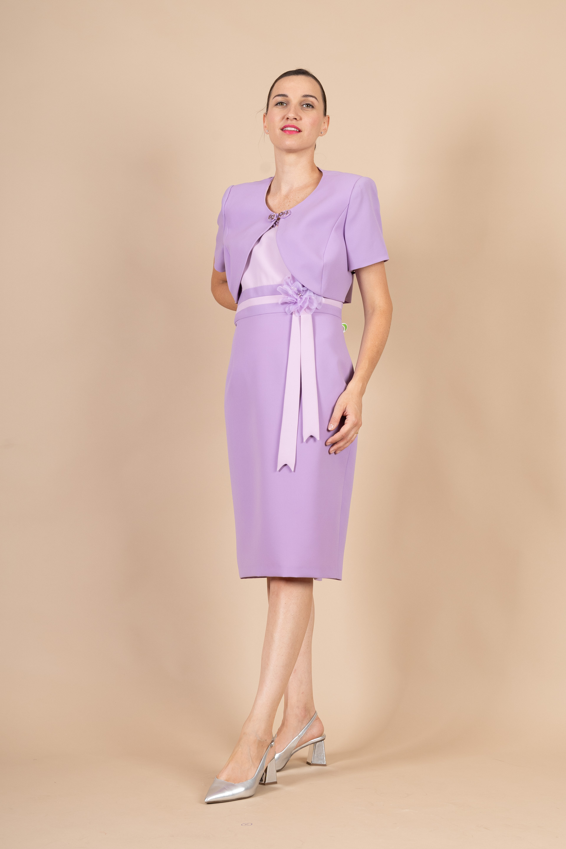 Tubino cerimonia donna con scollatura a dècolletè, spallina sottile e giacchina corta reazillato in tessuto di cady bicolre lilla/viola con ricami e applicazione floreale.
