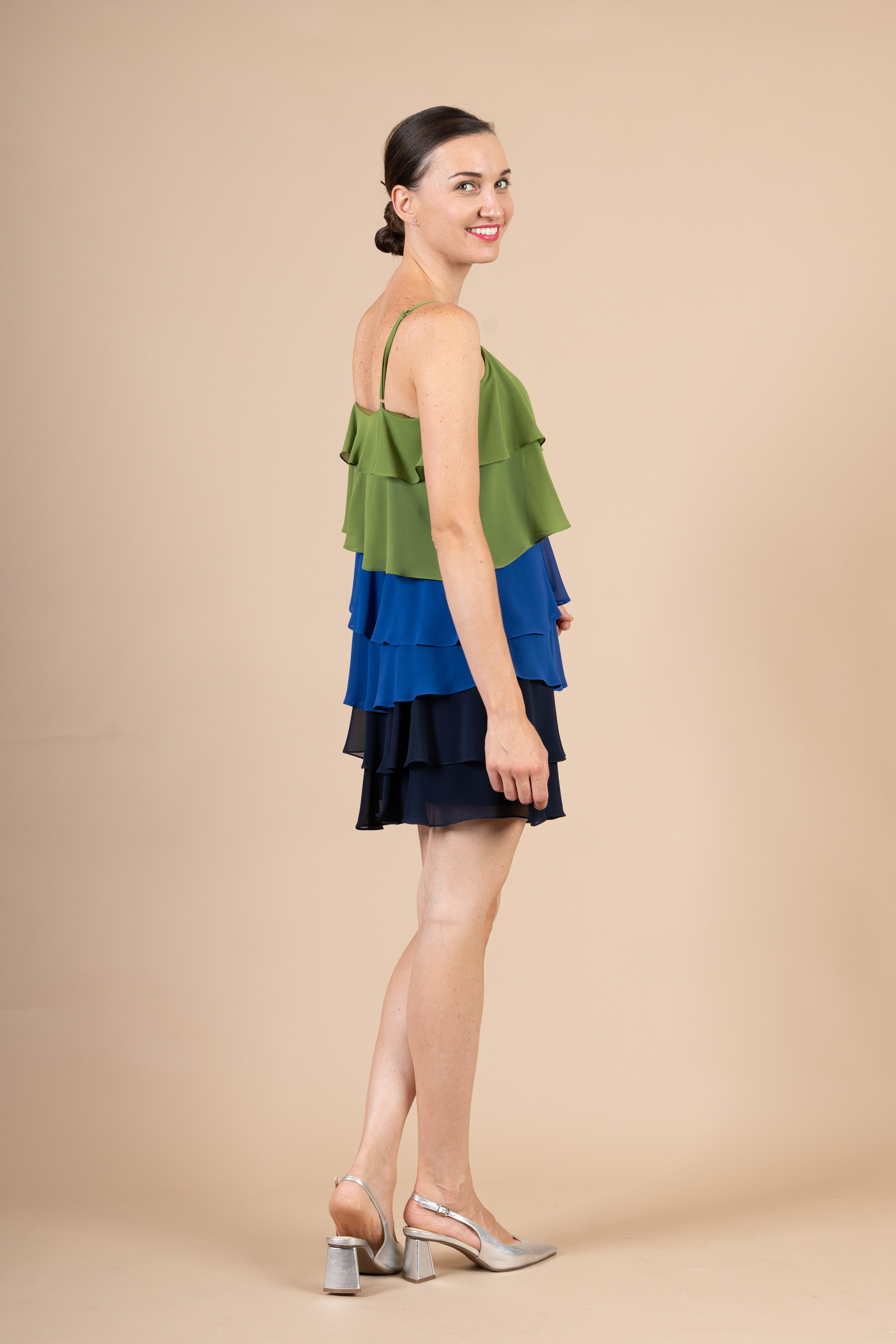 Particolare abito cerimonia corto ragazza a balze multicolor verde/bluette/blu con scollatura a dècolletè, spallina sottile e applicazione floreale removibile.