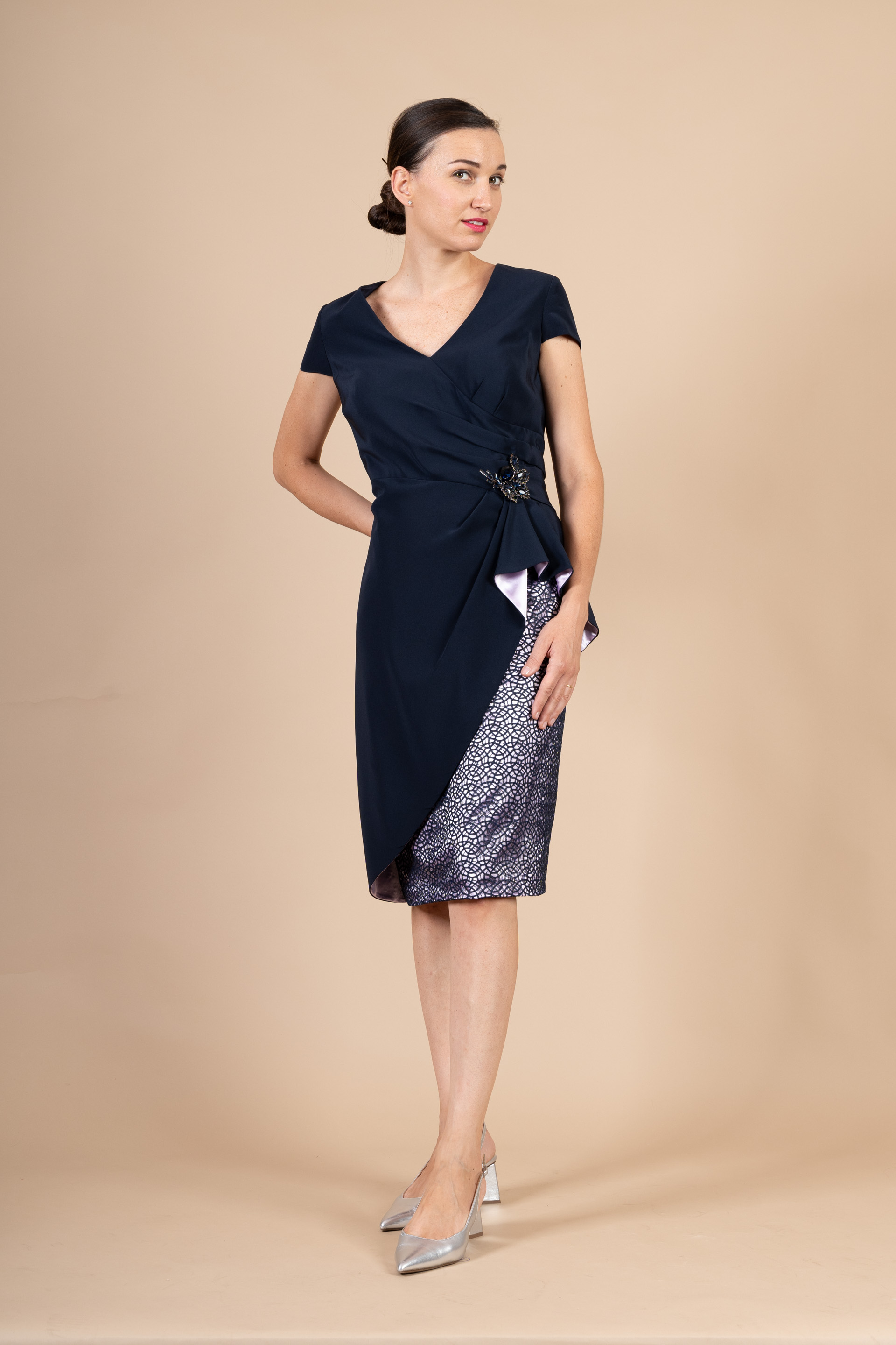 Abito cerimonia donna corto realizzato in tessuto cady con inserto in pizzo e applicazione di cristalli color blu/lilla.