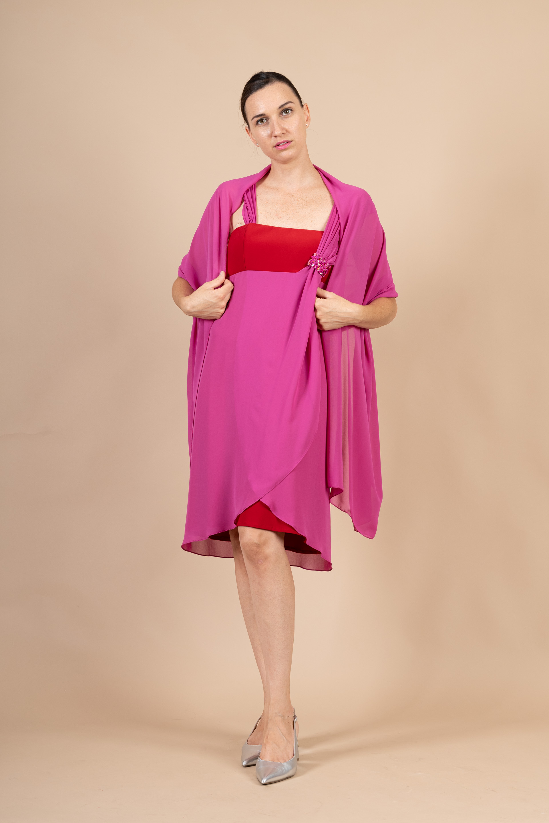 Abito cerimonia donna corto bicolore fuxia/rosso con corpetto cady e gonna chiffon impreziosito da spallina larga ricamata.