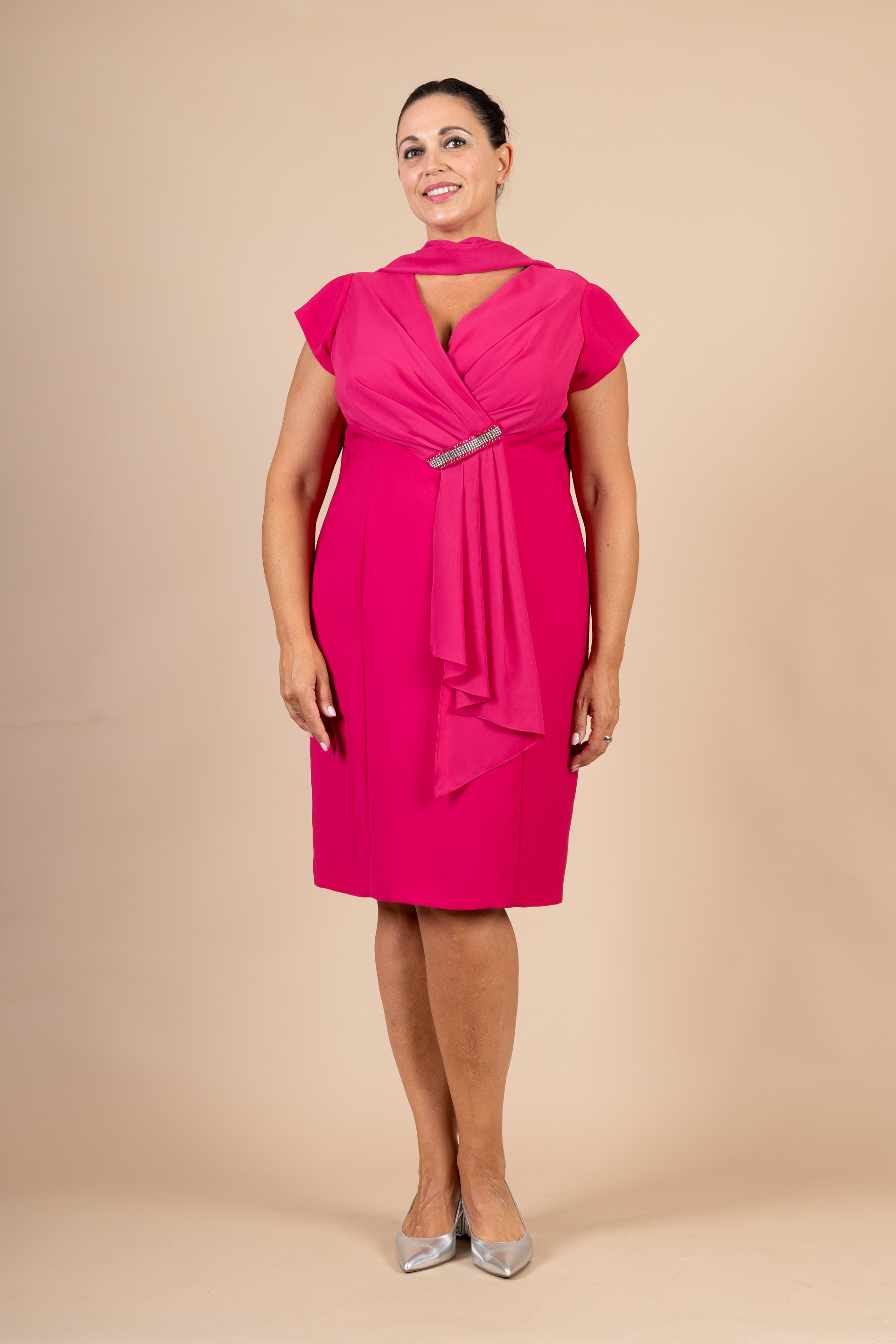 Tubino corto cerimonia donna curvy realizzato in tessuto cady con dettagli chiffon ed impreziosito da dettagli strass.