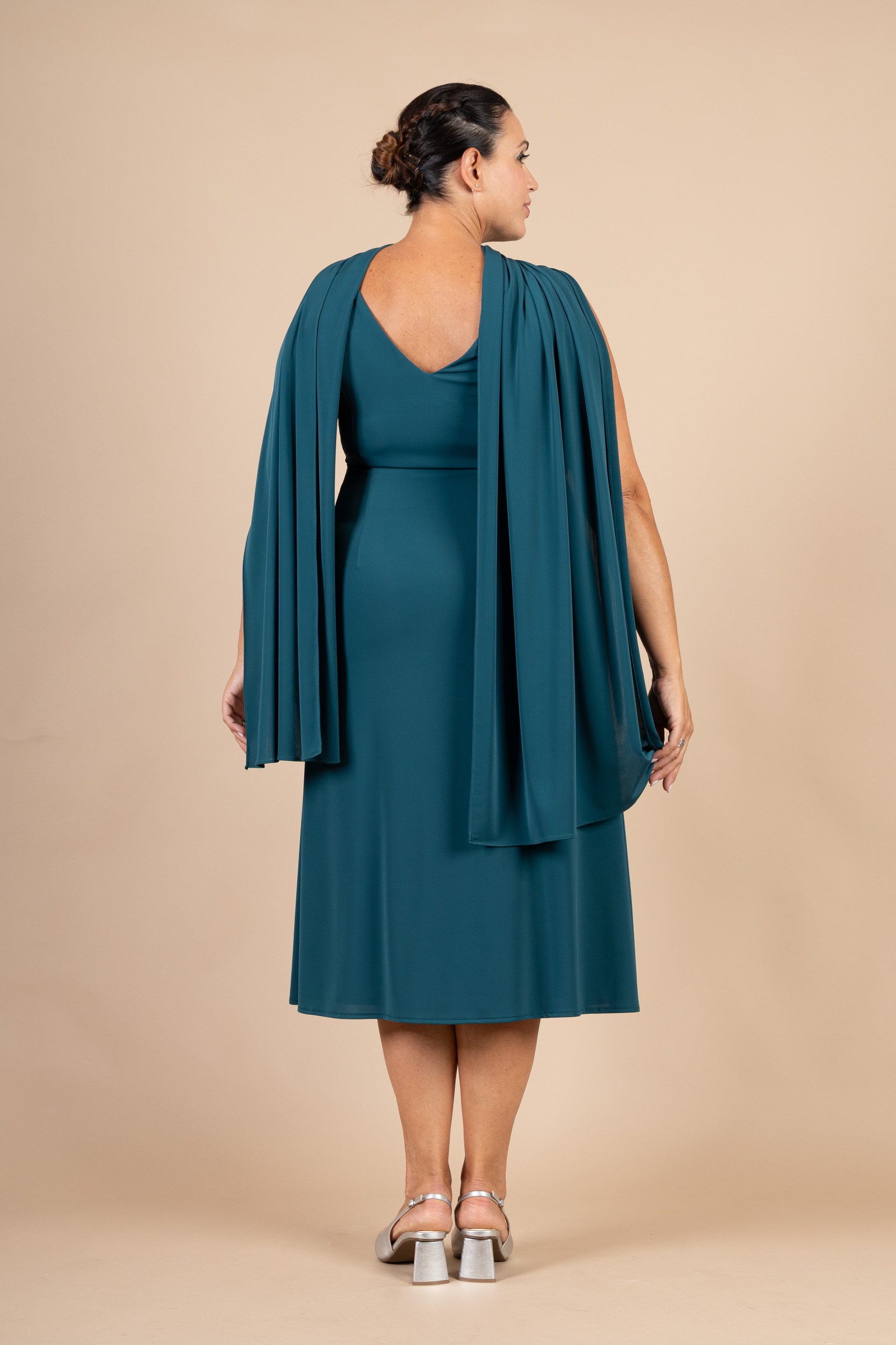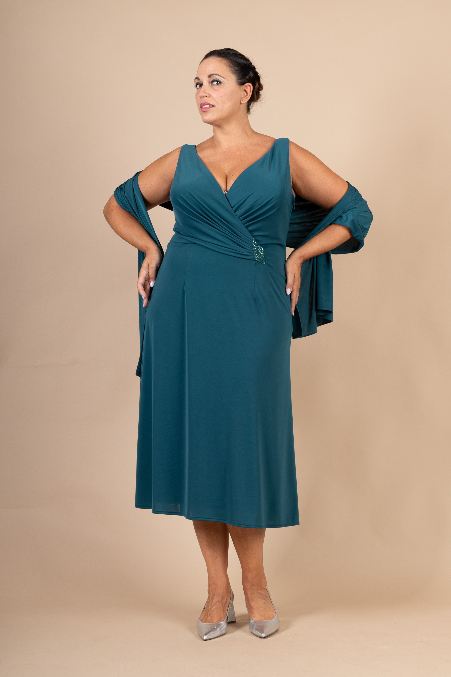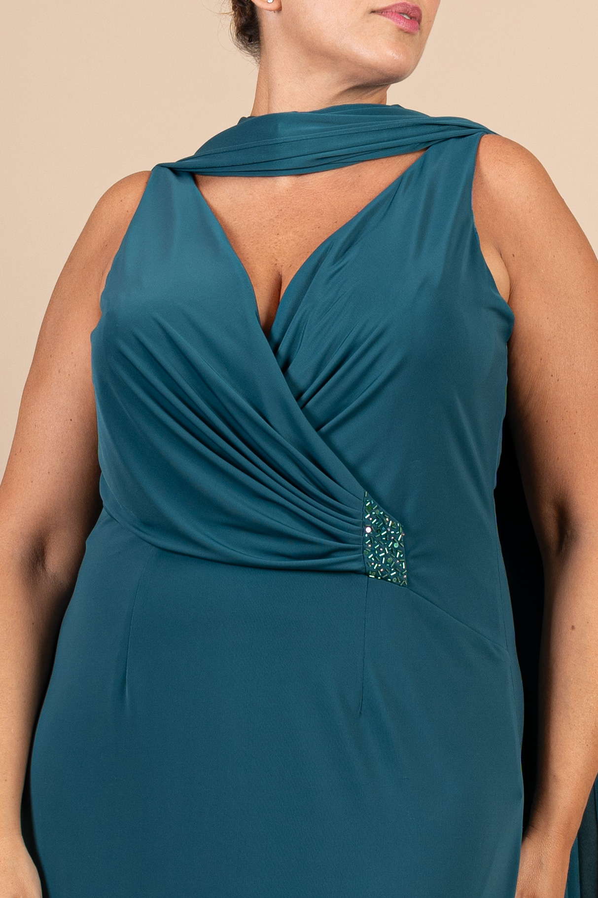 Abito cerimonia donna verde bottiglia, lunghezza midi interamente realizzato in tessuto maglina con scollo a V, drappeggio sul seno e applicazione ricamo con perline.