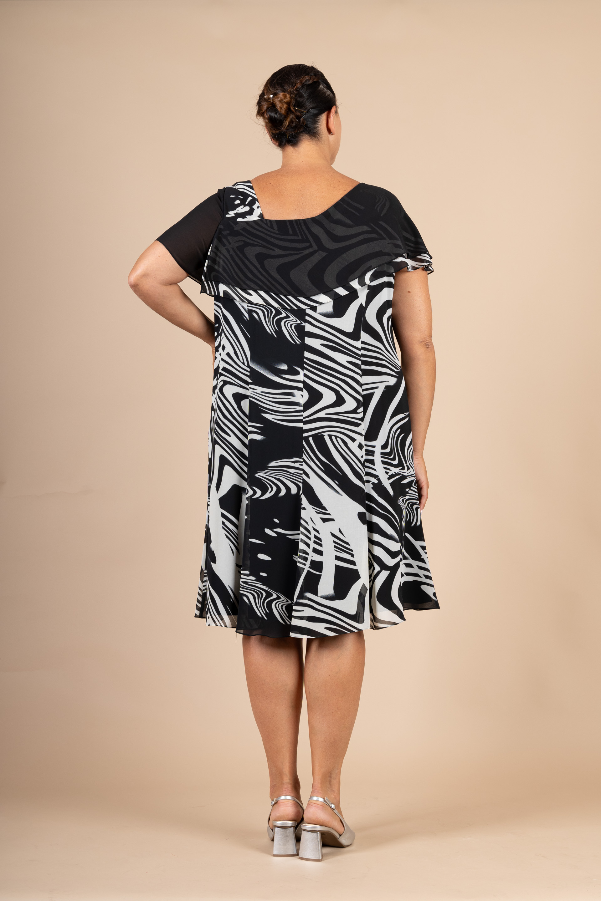 Abito cerimonia donna curvy corto con scollatura morbida e manichetta, dalla linea scivolata impreziosito con applicazione floreale. interamente realizzato in tessuto chiffon a fantasia nei toni nero/panna.