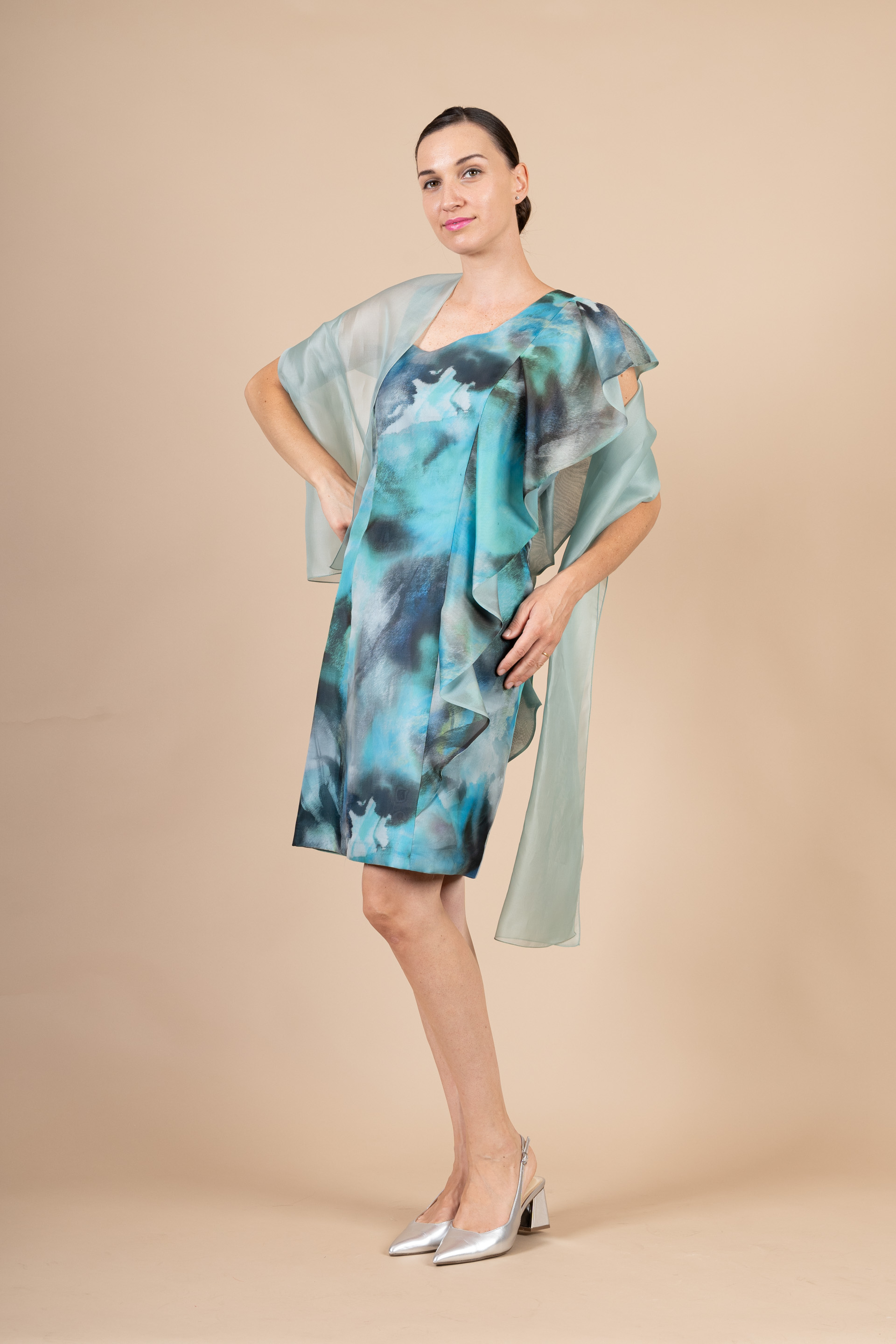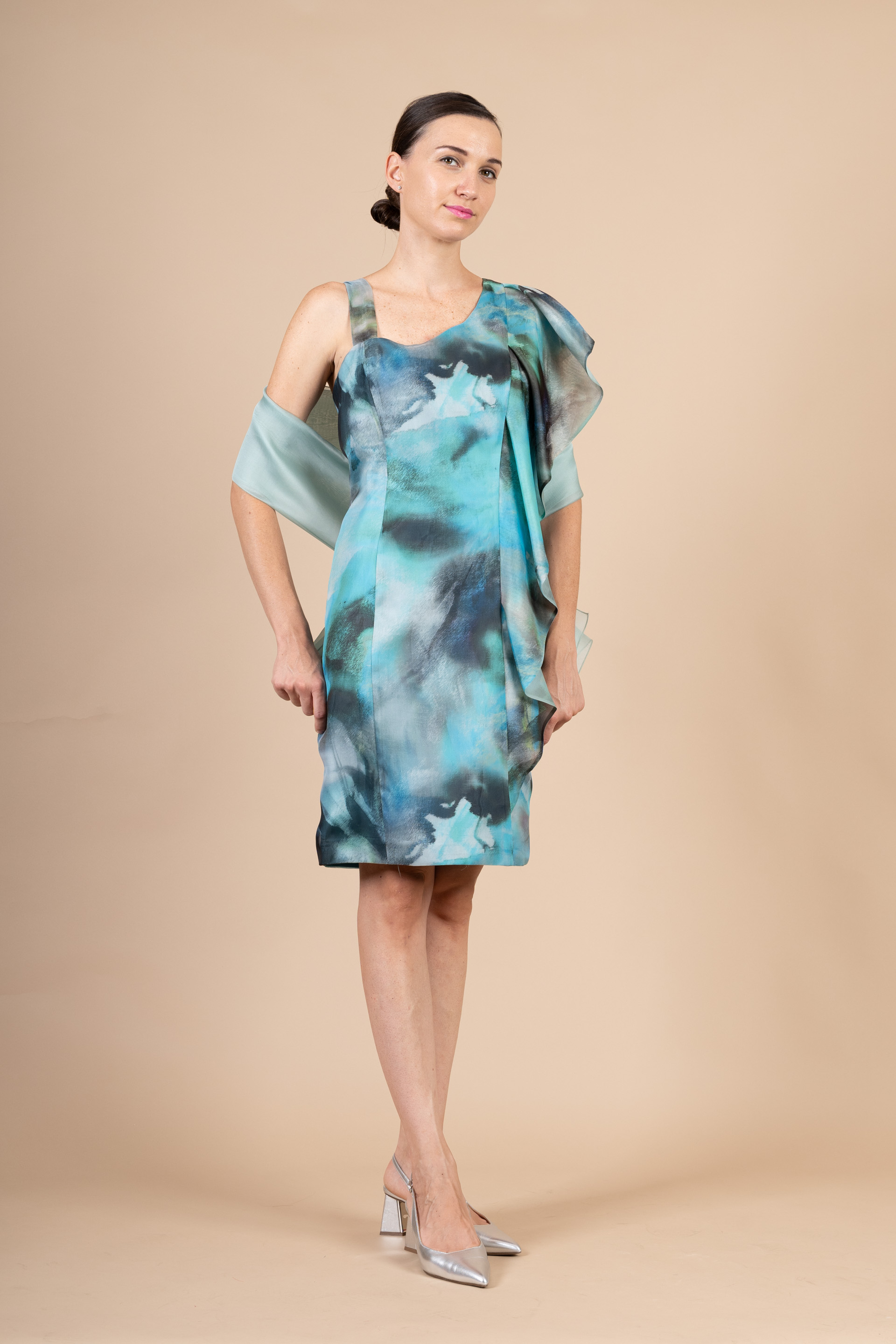 Tubino cerimonia donna con scollatura particolare con rouge, realizzato in tessuto a fantasia acquerello di organza di seta verde acqua.