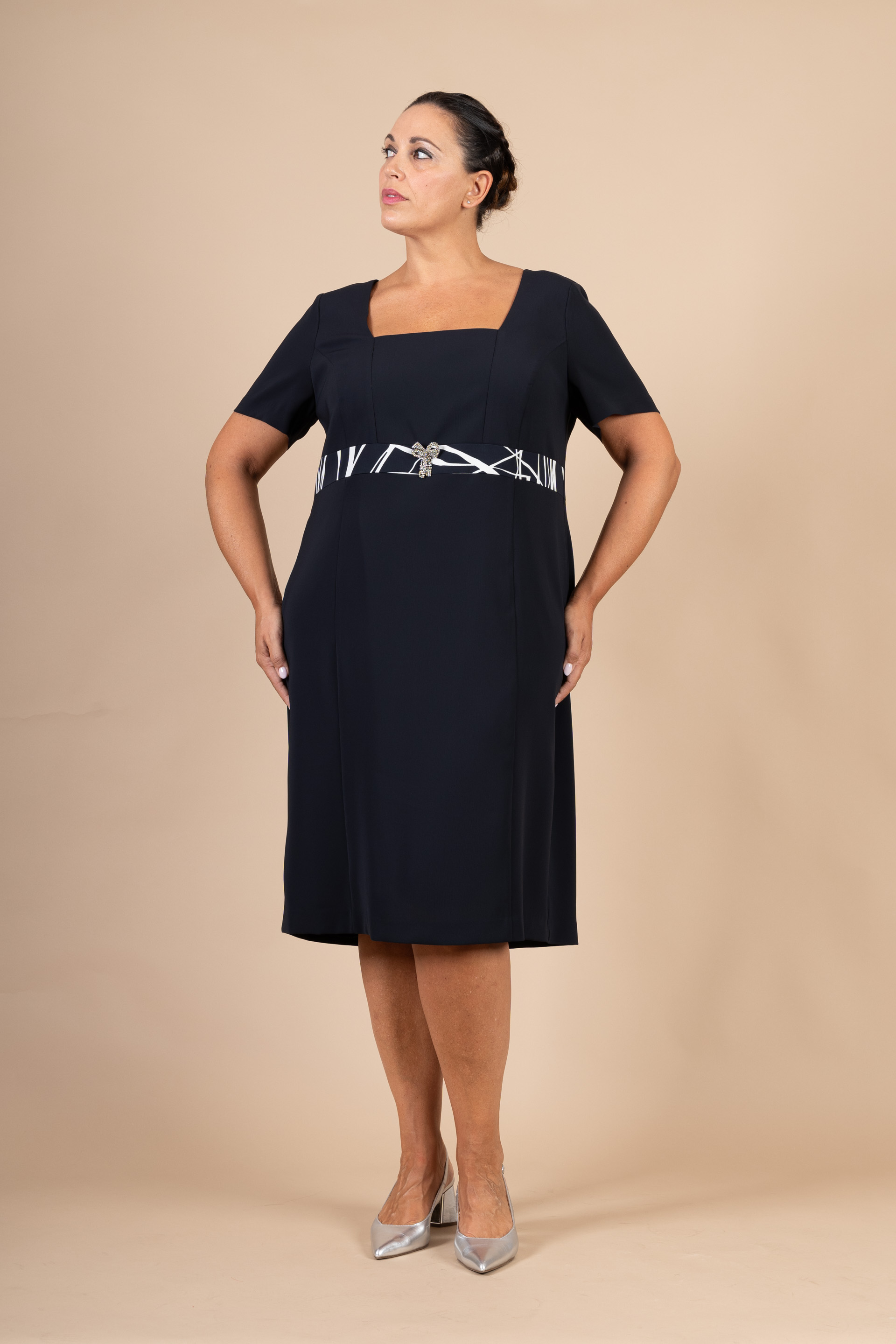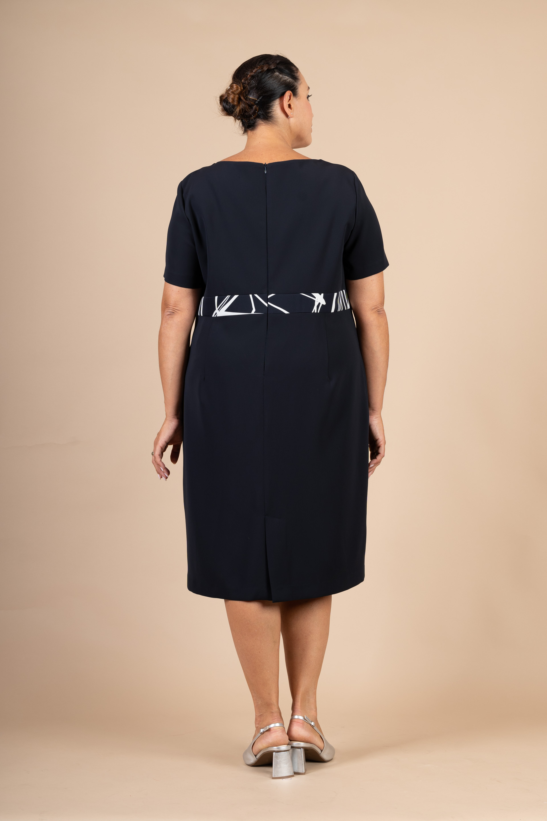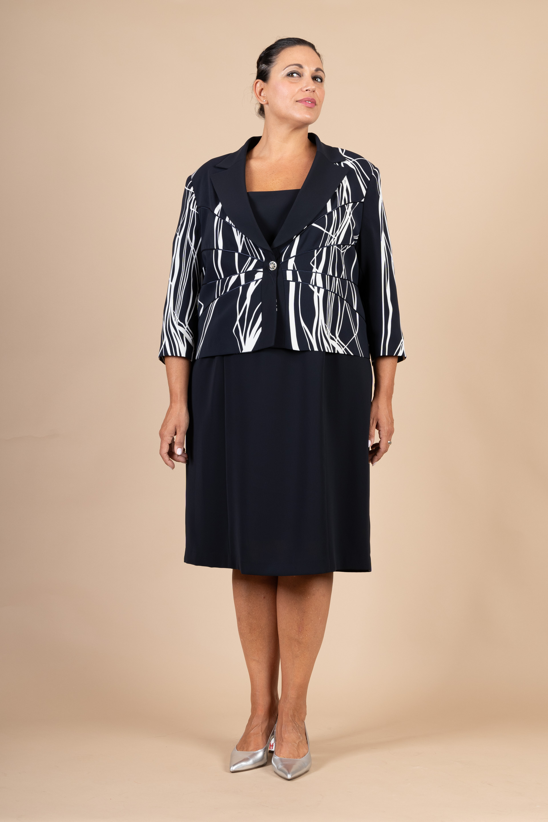 Completo cerimonia donna curvy blu, composto da abito corto con manichetta e giacca in tesssuto a fantasia geometrica realizzato in tessuto di jersey nei toni nero/panna.
