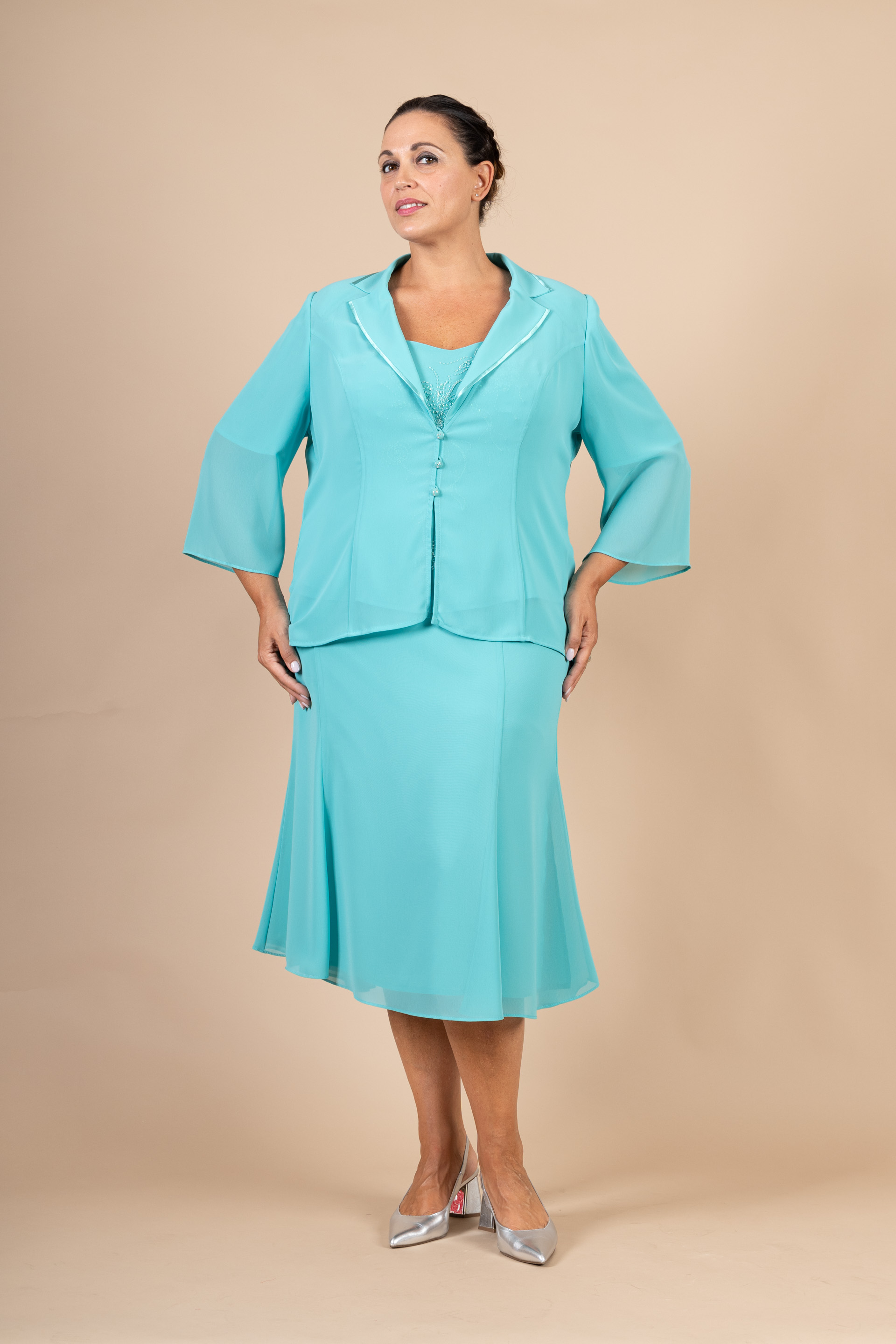 Completo 3 pz. cerimonia donna composto da giacca, top con manichetta e gonna morbida color verde Tiffany realizzato in tessuto chiffon, impreziosito da ricami tono su tono.