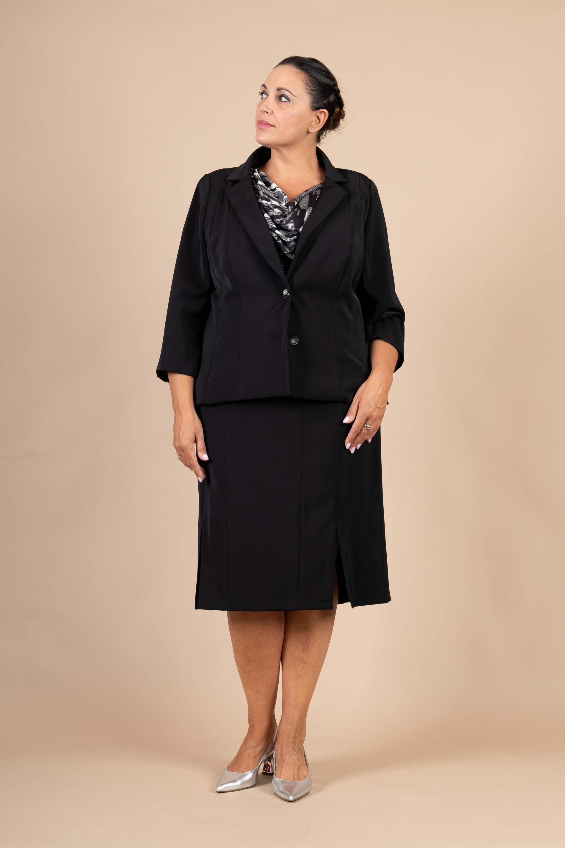 Completo 3 pz. cerimonia donna composto da giacca e gonna nere in tessuto cady e top in raso a fantasia nero/bianco impreziosito da ricami a peline con scollatura morbida.