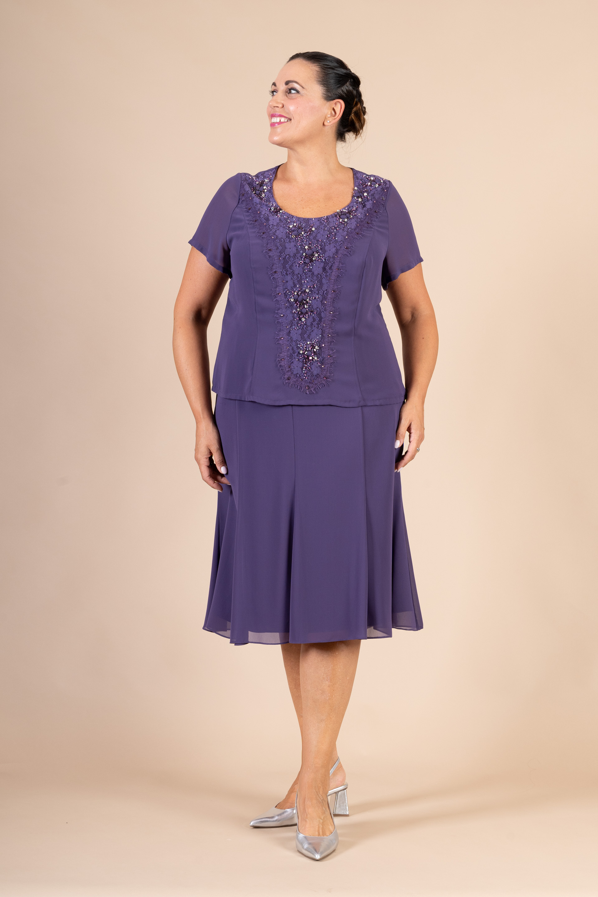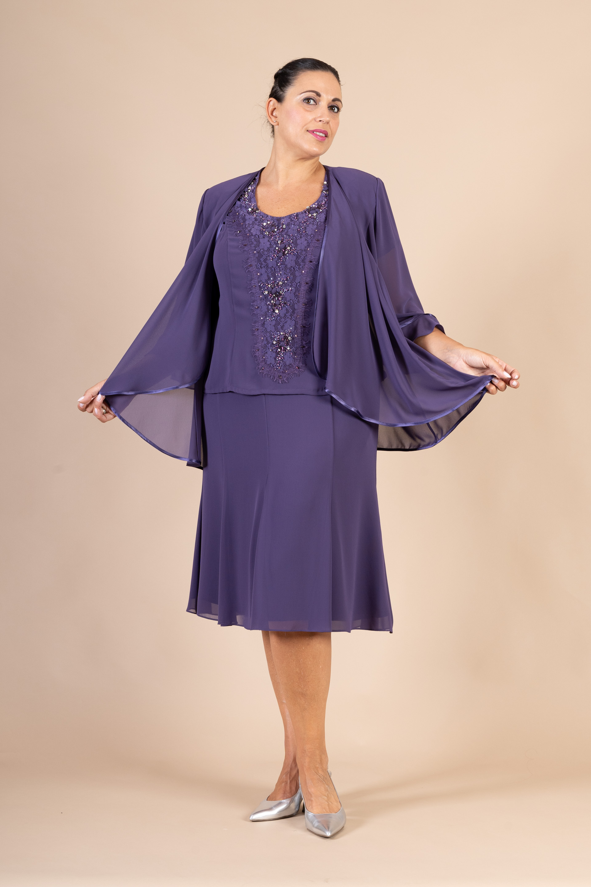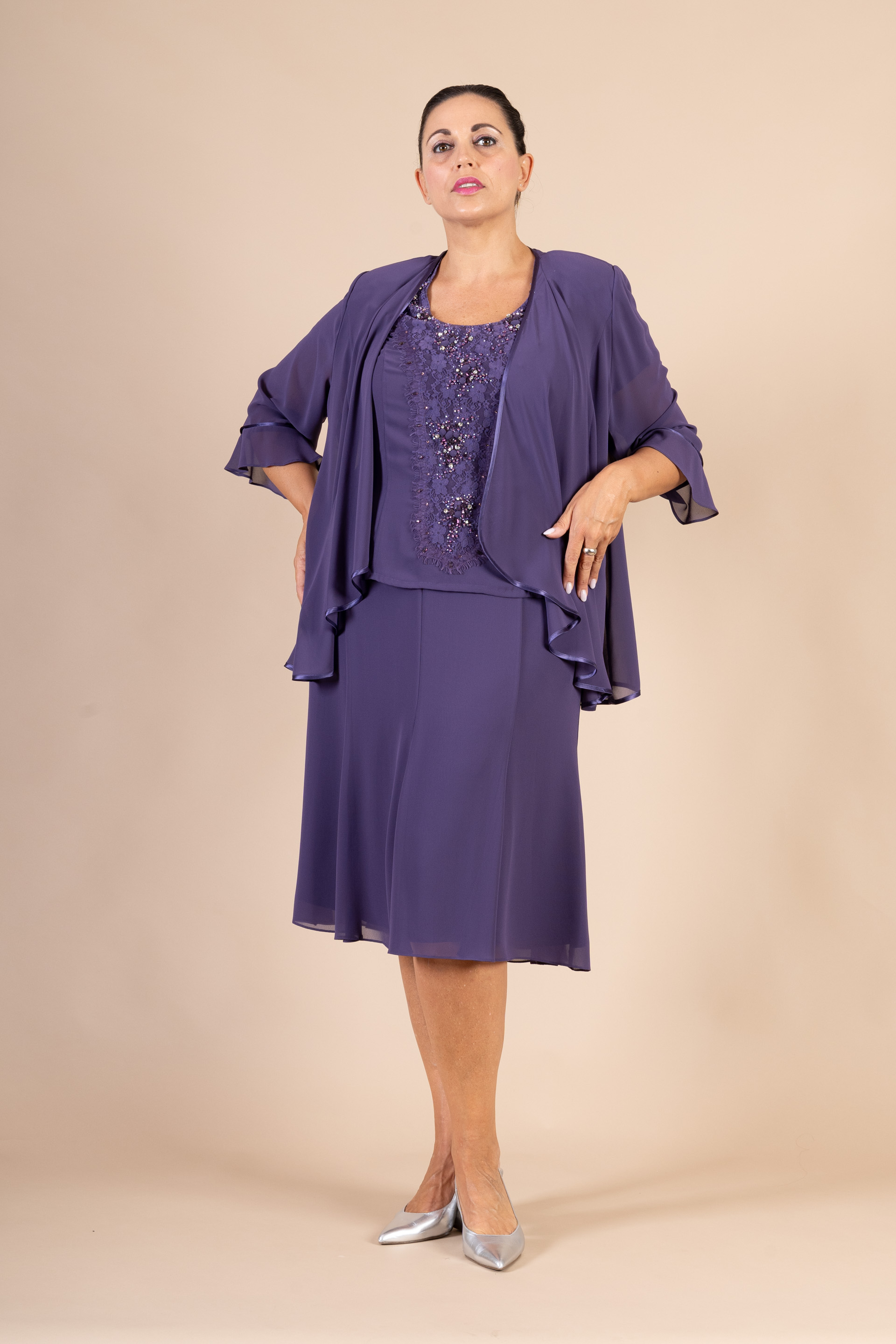 Completo 3 pz. cerimonia donna composto da giacca, top con manichetta e gonna morbida color prugna realizzato in tessuto chiffon, impreziosito da ricami tono su tono.