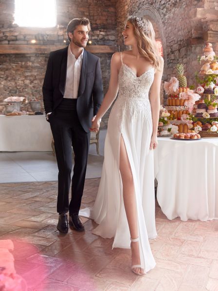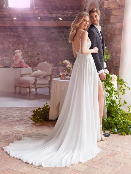 La gonna in chiffon leggero scivola dolcemente lungo il corpo, creando un effetto etereo e fluido ad ogni passo. Il dettaglio che cattura l'attenzione è senza dubbio lo spacco laterale, che dona movimento e un accento sensuale, perfetto per una sposa che vuole sentirsi moderna e sicura di sé. Questo abito, con la sua combinazione di tessuti leggeri e dettagli ricercati, è l’ideale per una cerimonia all'aperto o un matrimonio dal sapore contemporaneo.