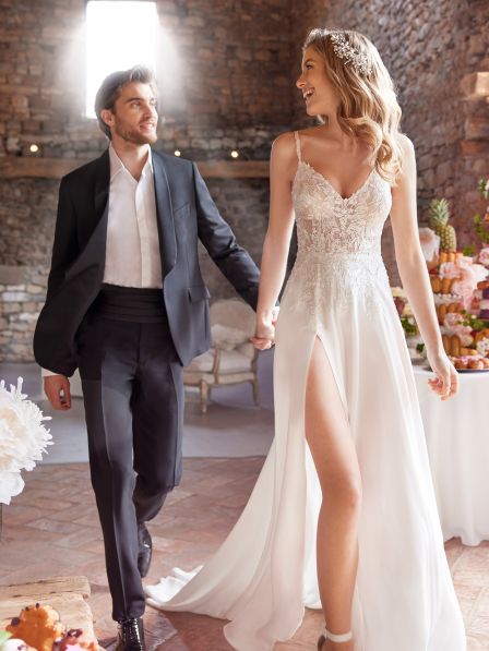 Perfetto per una sposa che cerca eleganza, modernità e un pizzico di audacia, questo abito regalerà un look mozzafiato e indimenticabile, garantendo il massimo comfort durante tutta la giornata.