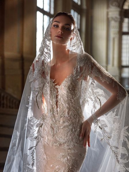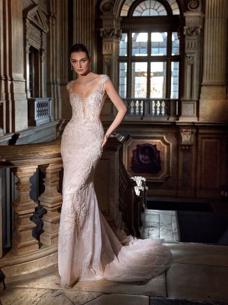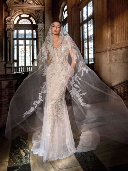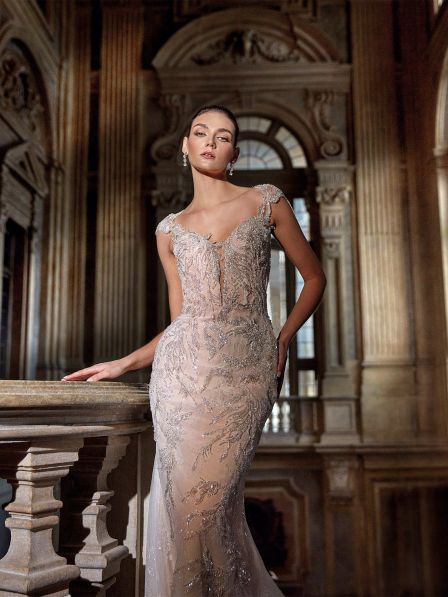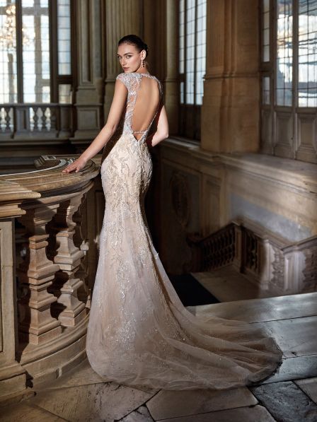 Splendido abito da sposa dalla linea moderna in stile sirena con ricami argentati e scintillanti per un effetto elegante e lucente. La schiena con scollatura profonda e un giocoso cinturino sulla parte inferiore attira gli sguardi in modo seducente.