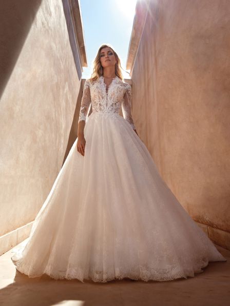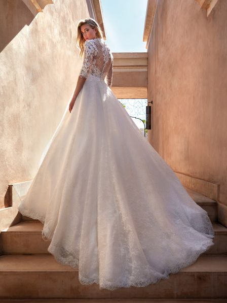 Questo abito classico A line, realizzato in pregiato pizzo Chantilly, è sinonimo di equilibrio. Presenta un corpetto classico ed elegante con maniche a tre quarti e una schiena semitrasparente accentuata da una scultorea cucitura a bottoncini.