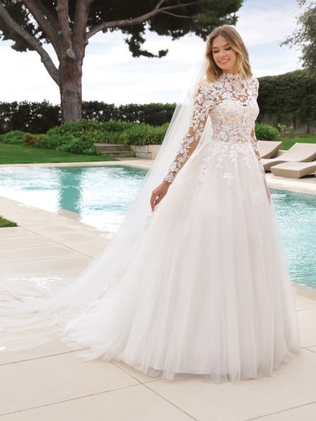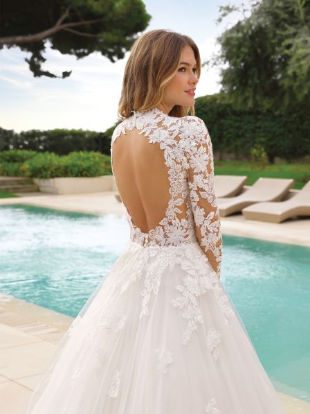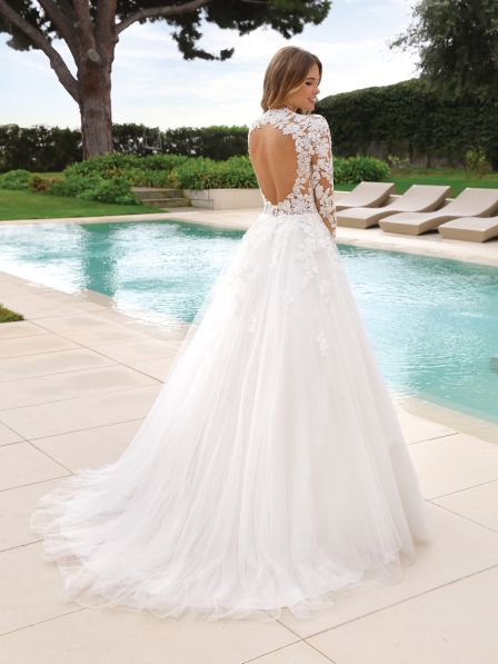 Il corpetto, interamente decorato con ricami floreali in pizzo, si trasforma in un’opera d’arte sartoriale che abbraccia con delicatezza la silhouette della sposa. Le maniche lunghe in pizzo trasparente creano un gioco di eleganza e sensualità, perfetto per chi cerca un look sofisticato. Ma il vero protagonista è il seducente scollo sulla schiena che esalta la femminilità in modo impeccabile, dando un tocco di audacia a un abito dal fascino classico.