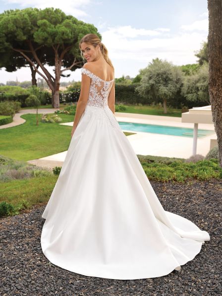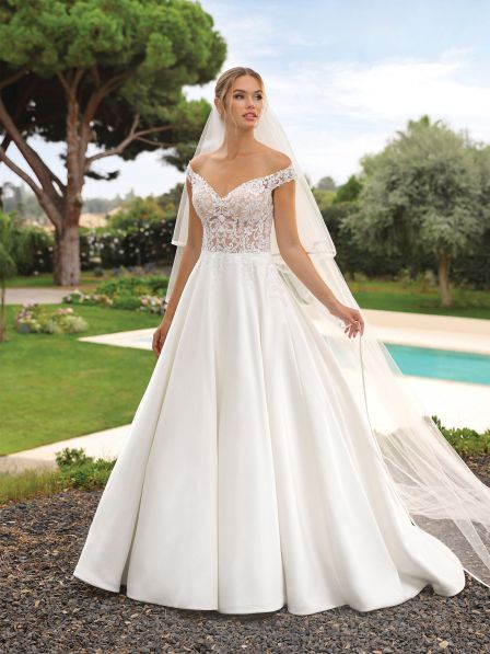 Abito sposa gonna in mikado e corpetto in pizzo.
