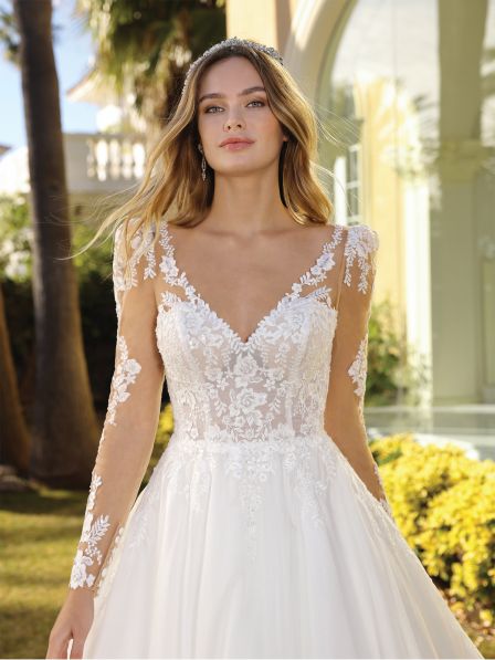 Abito sposa con gonna ampia di morbidissima organza con corpetto in pizzo ricamato con scollo a V e maniche lunghe.