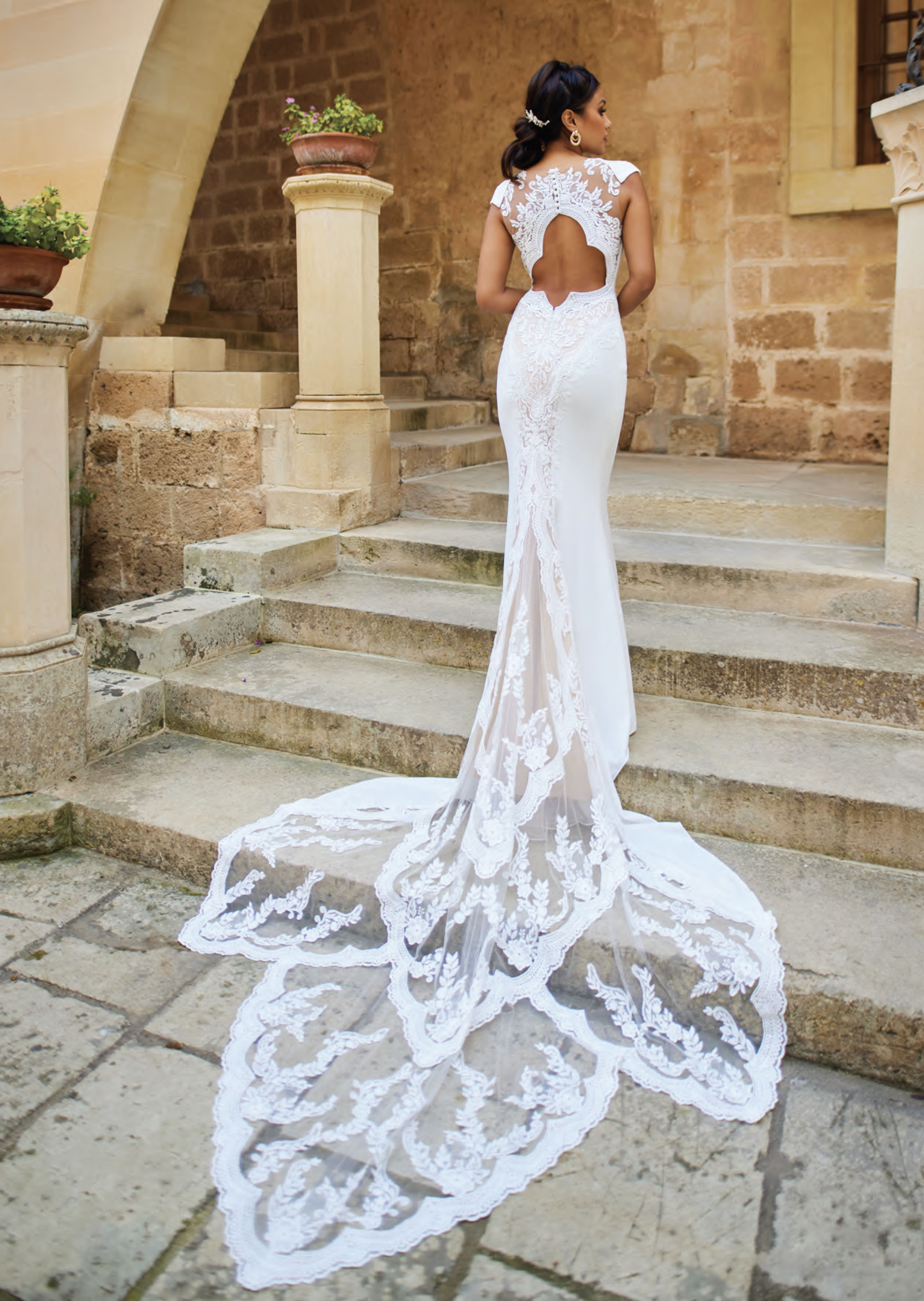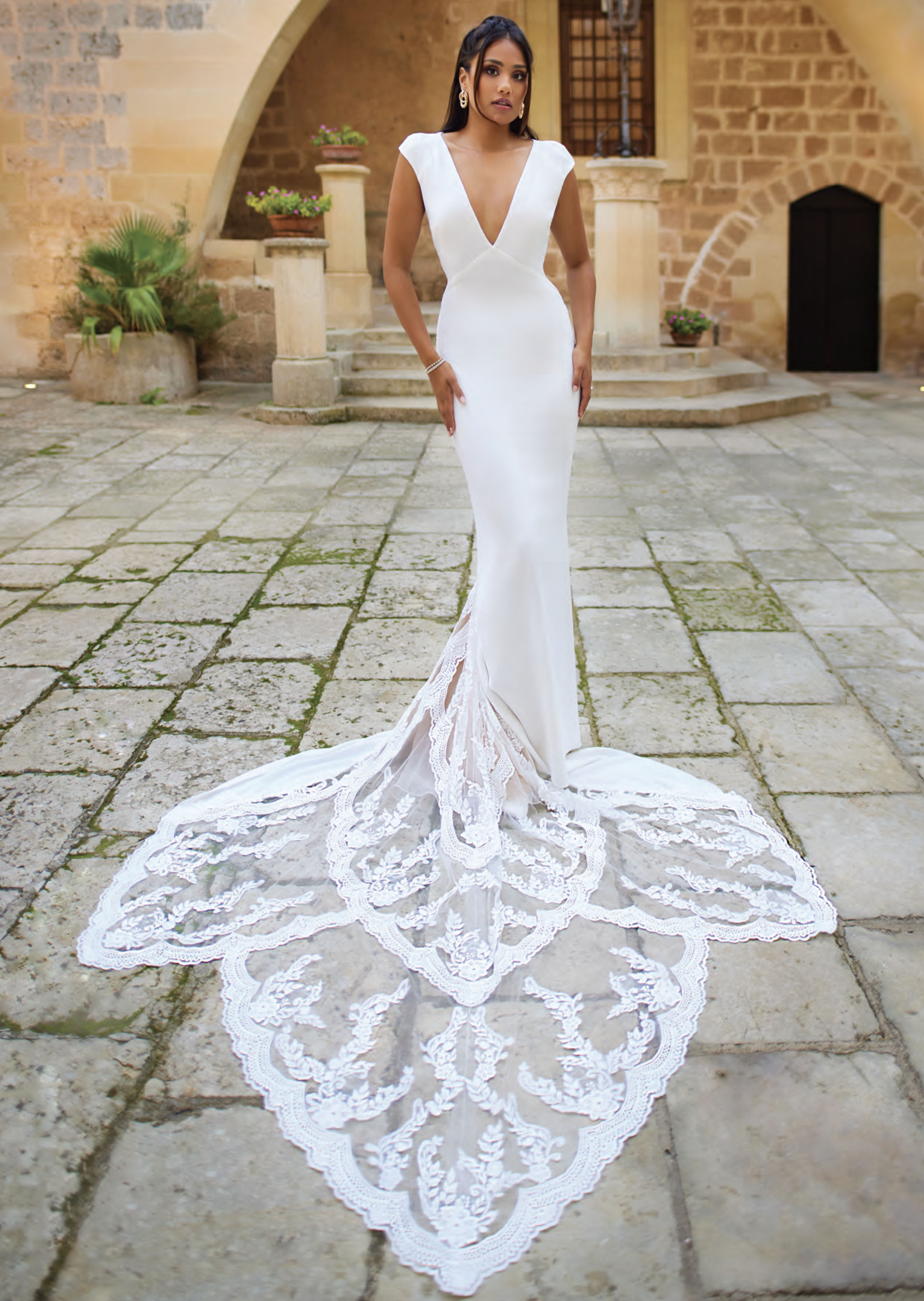 Per una sposa che non vuole passare inosservata questo è l'abito adatto, aderente, scollato e super sensuale, con un importante coda di pizzo capace di lasciare tutti senza fiato.