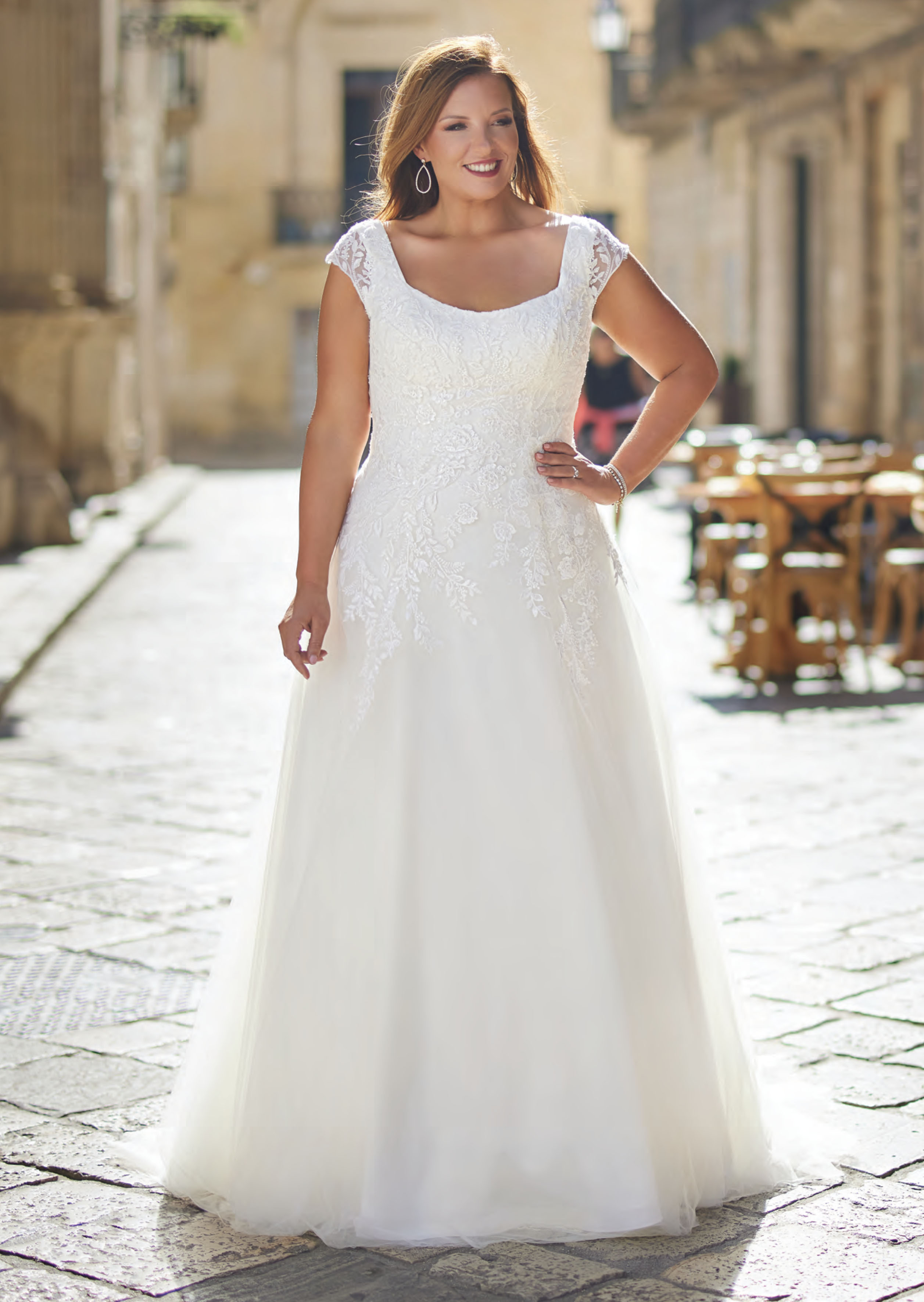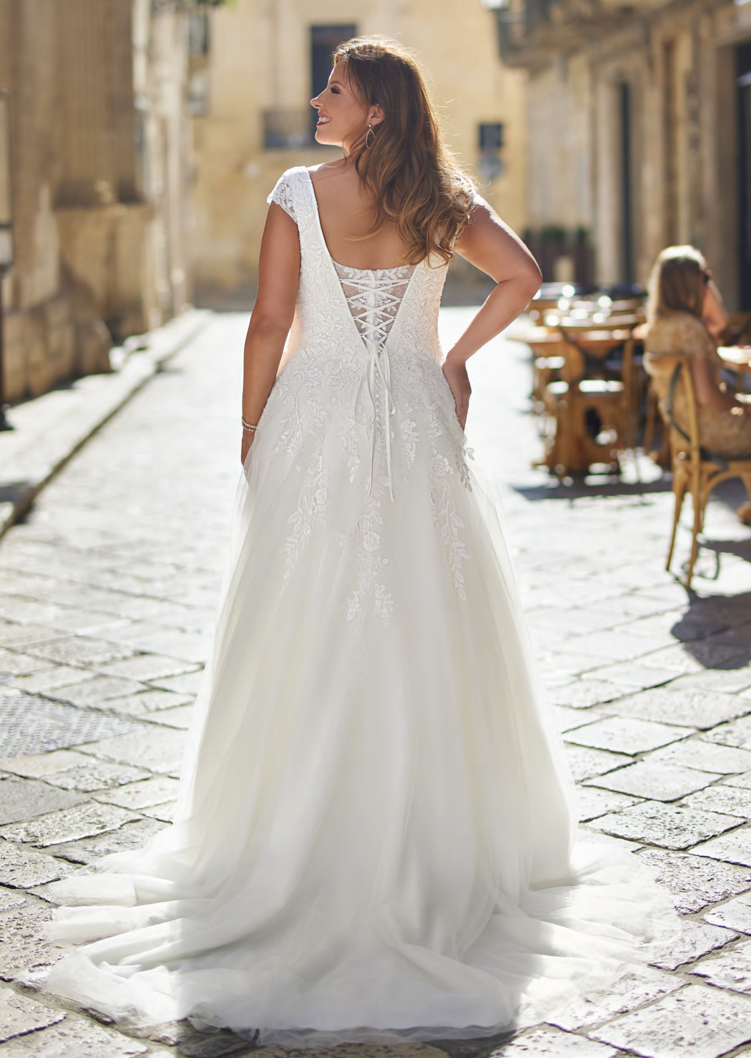 Abito sposa dalla linea morbida scivolata realizzato in tulle con corpetto in pizzo ricamato con scollo tondo e chiusura a corsetto.