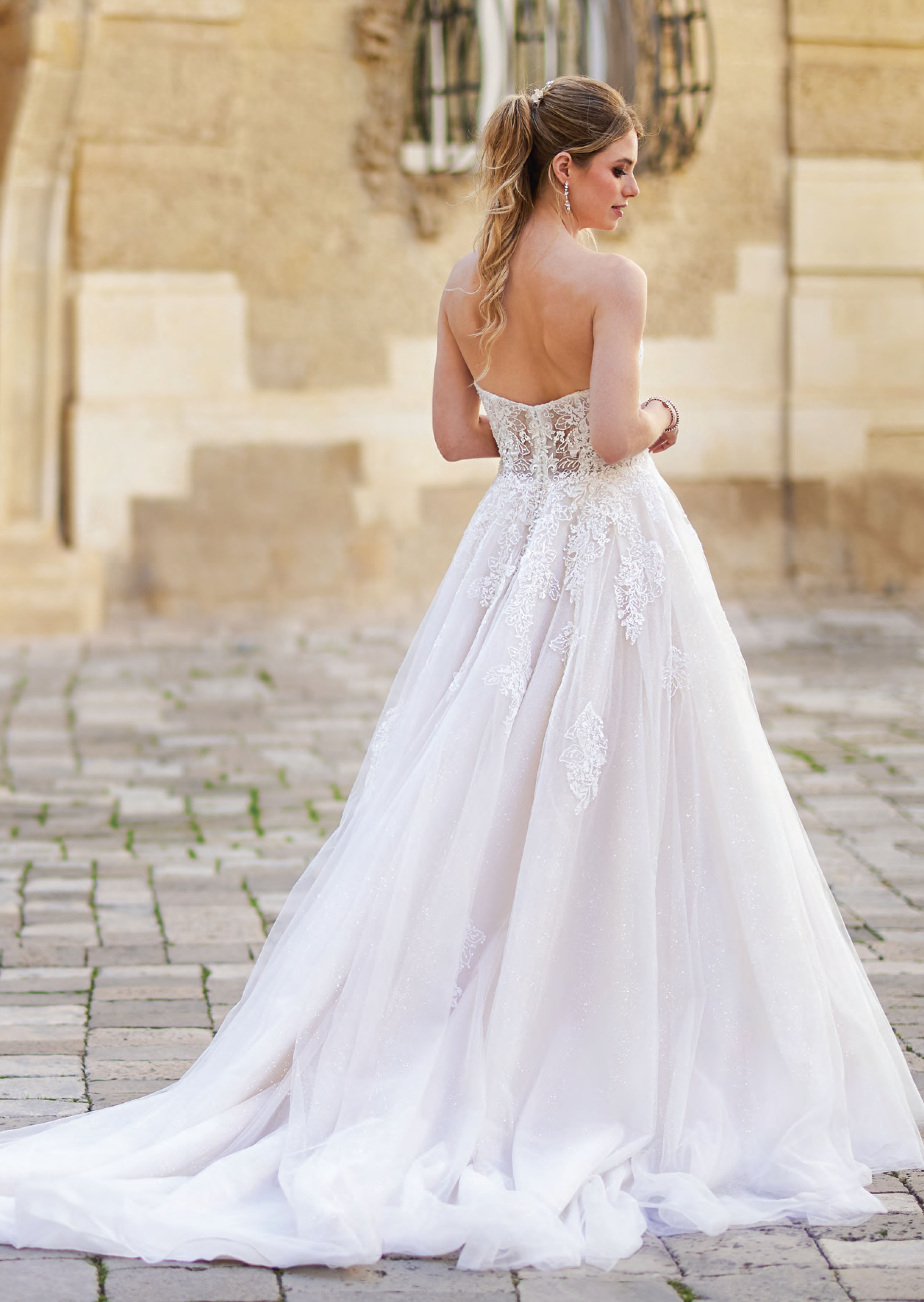 Abito sposa ampio ricamato con scollo a cuore.