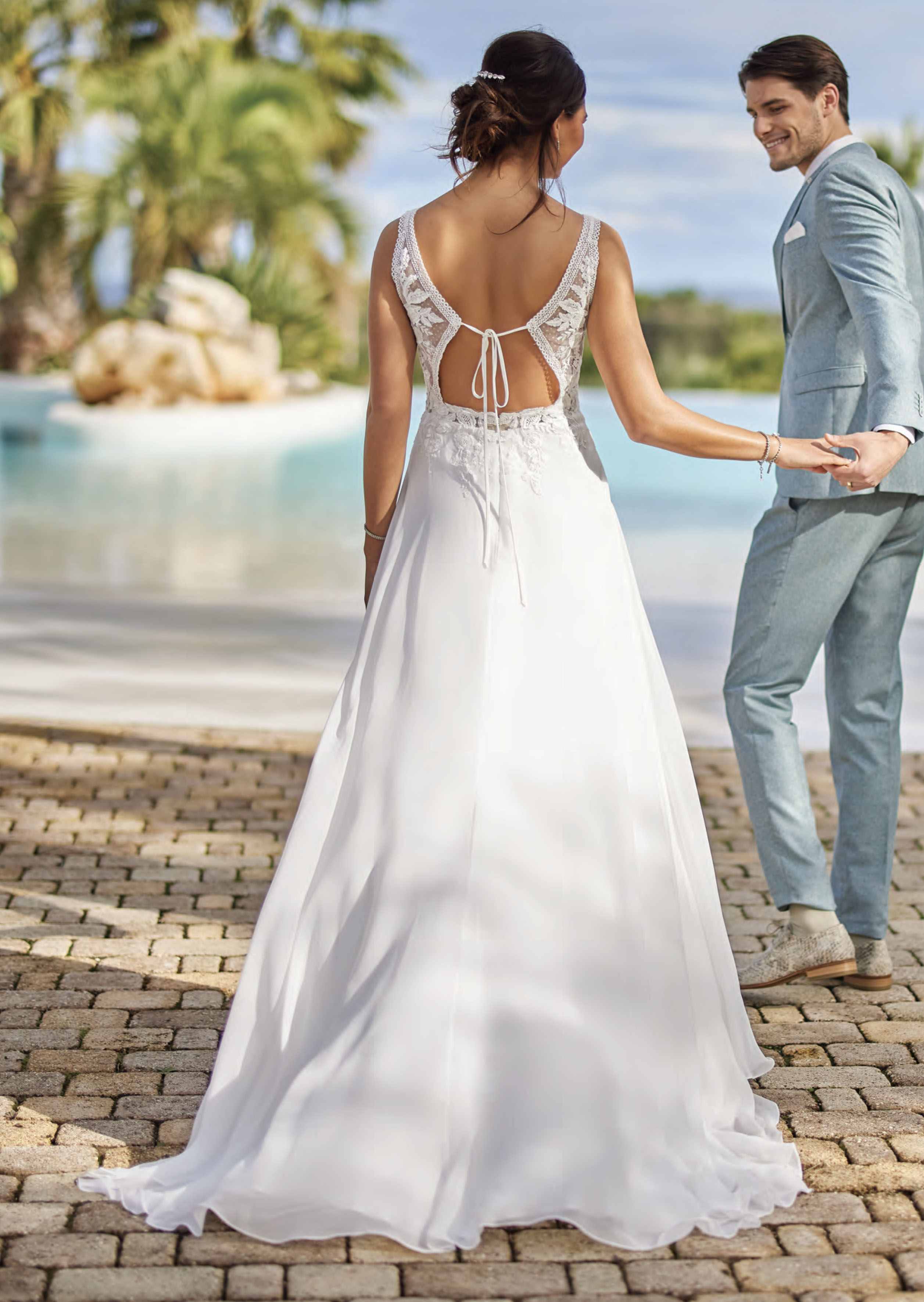 Abito sposa scivolato con gonna morbida di tulle con corpetto di pizzo con scollo a V.