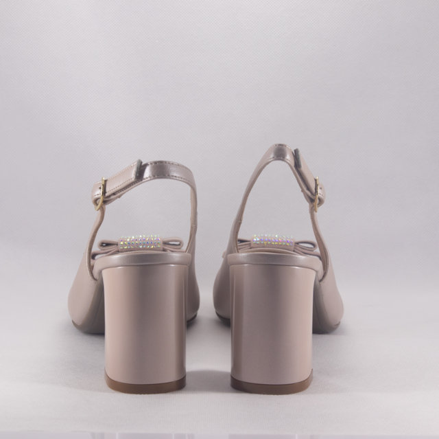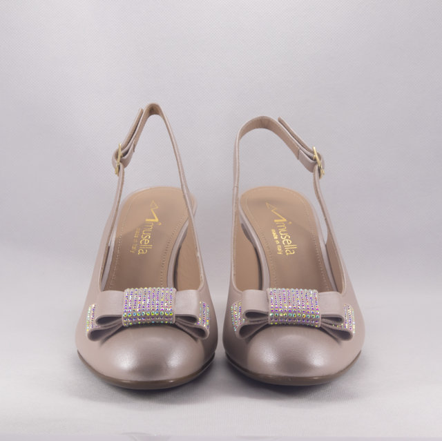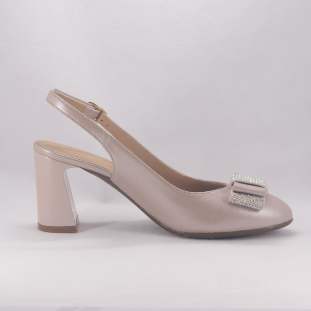 Scarpa cerimonia donna elegante comoda con tacco largo realizzata in morbidissima pelle, color rosa cipria impreziosita da fiocco con cristalli color aurora boreale.
