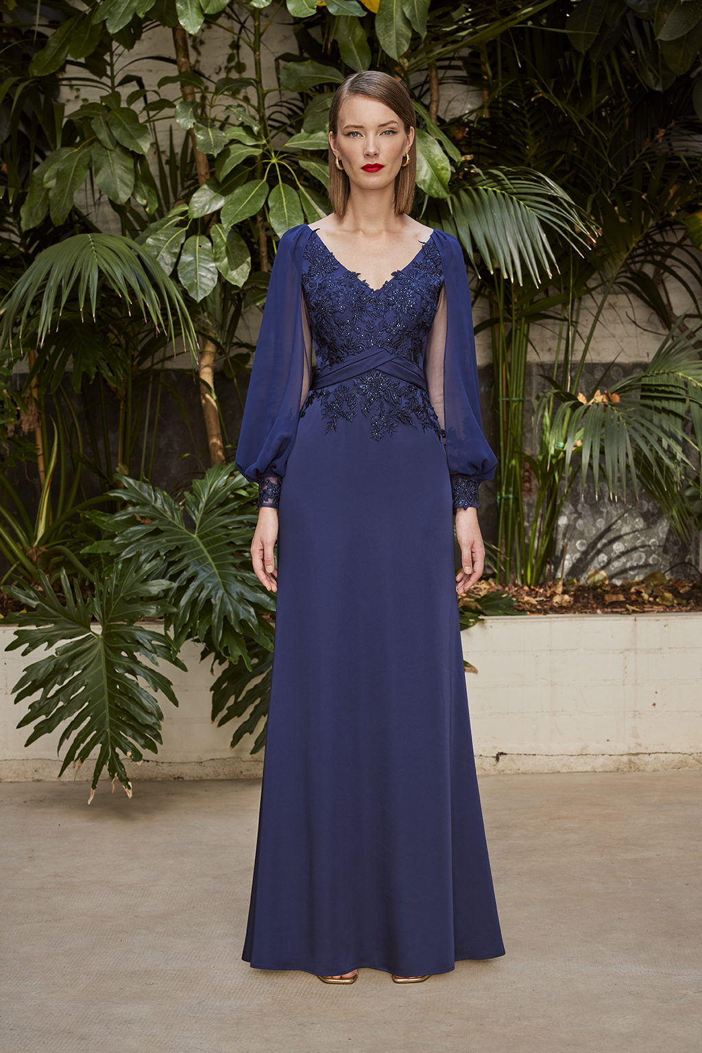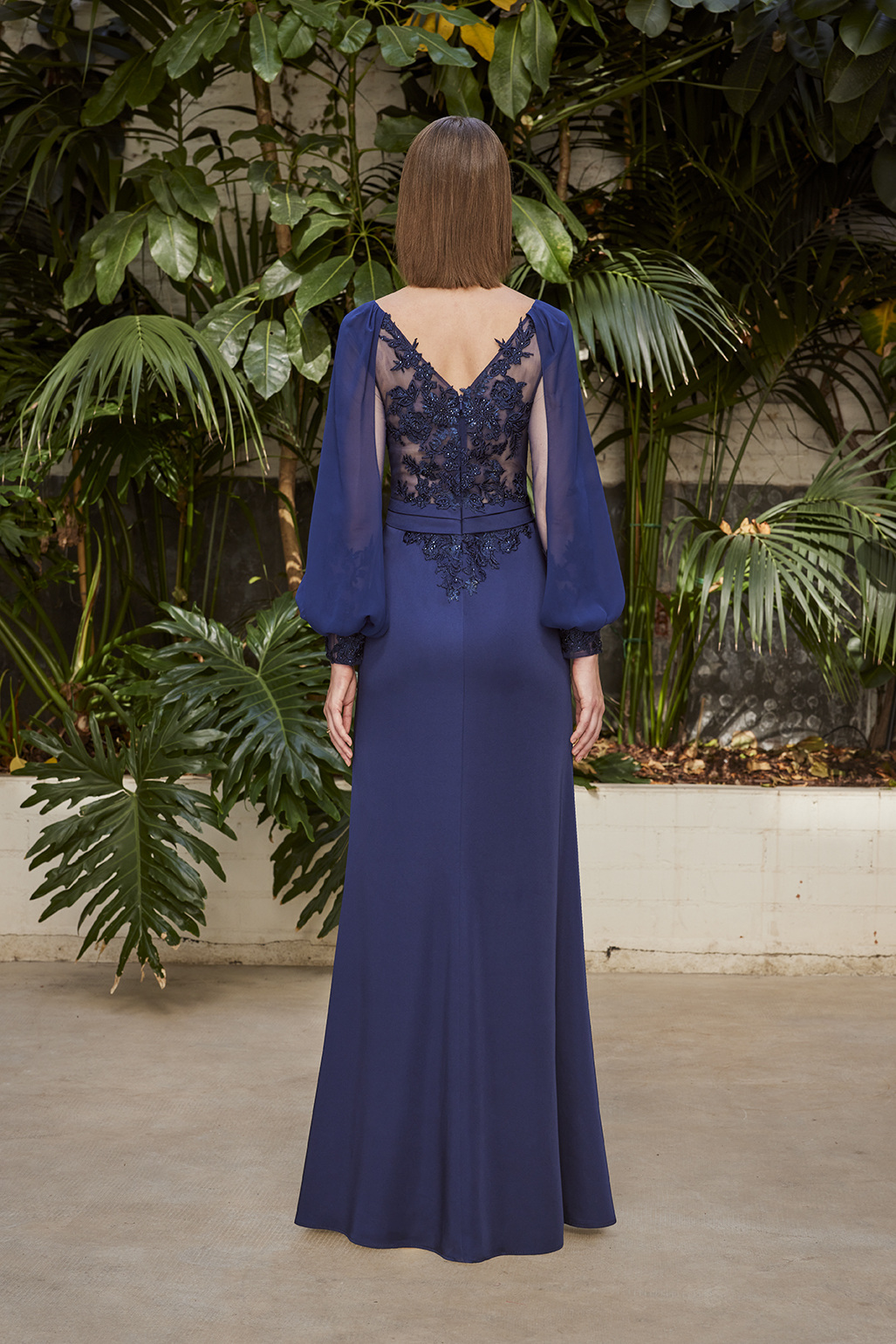 Abito cerimonia donna lungo color blu navy realizzato in tessuto di raso elasticizzato con maniche a sbuffo in morbido tessuto chiffon con polso ricamato, impreziosito da ricami tono su tono in pizzo sul corpetto.