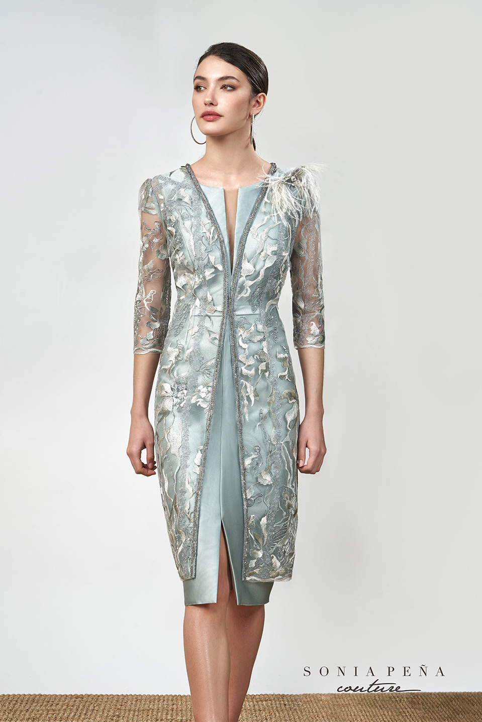 Completo cerimonia donna 2 pz.color verde salvia composto da tubino realizzato in tessuto di mikado con dettaglio manichetta pizzo e particolare soprabito interamente realizzato in pizzo con rifiniture di perline ricamate e applicazione con piume removibile.