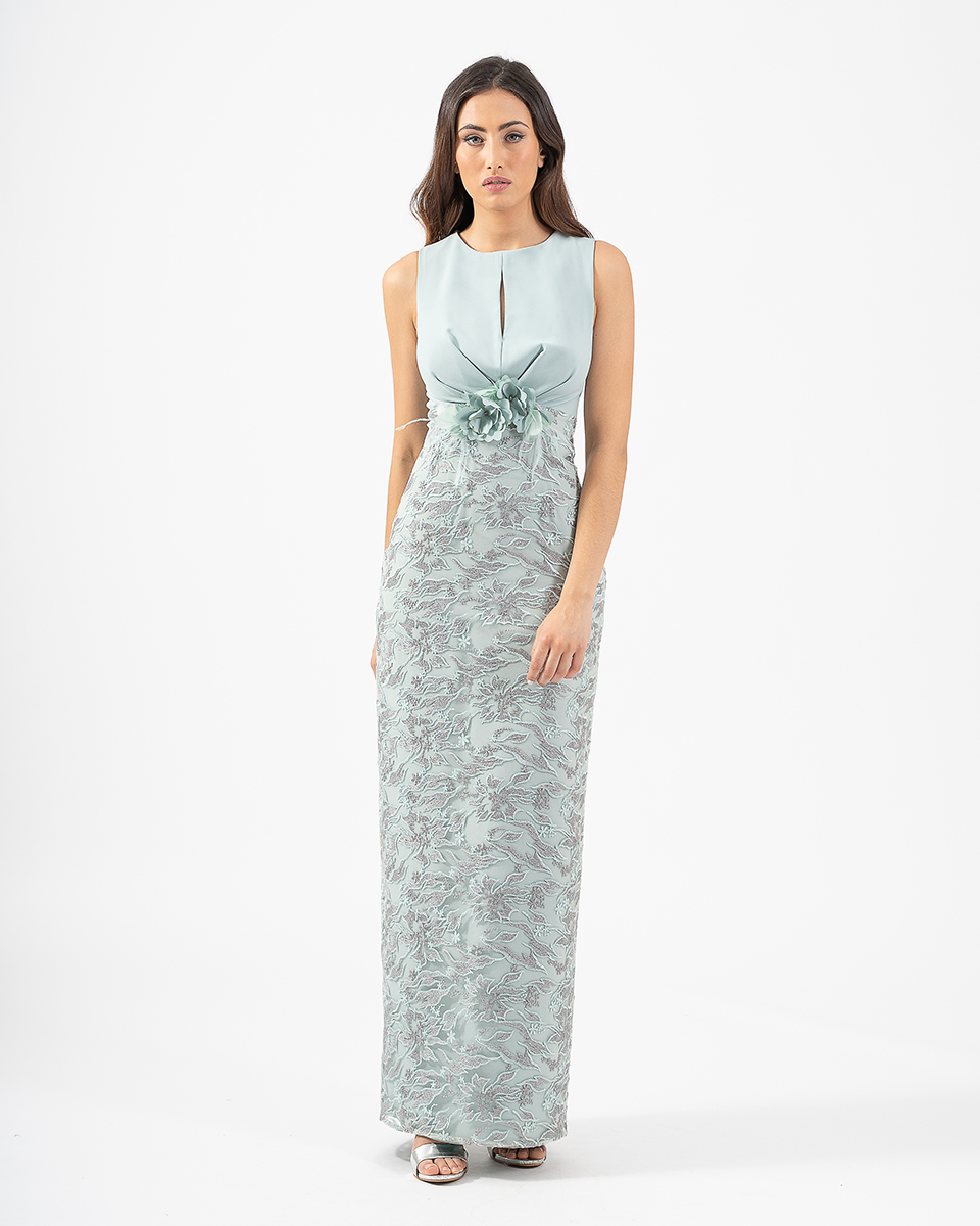 Particolare abito cerimonia donna composto da tubino lungo smanicato realizzato in tessuto chiffon e pizzo ricamato impreziosito da applicazione floreale removibile, coordinato a leggera mantellina di tessuto chiffon tutto realizzato in un delicatissimo tono color salvia chiaro e argento.