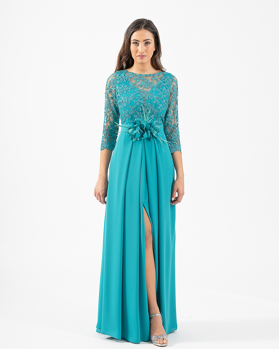 Abito cerimonia donna di colore verde smeraldo, lungo con corpetto in pizzo ricamato con maniche e scollatura in trasparenza a V, gonna morbida in fluido chiffon con spacco, impreziosito da applicazione floreale removibile.