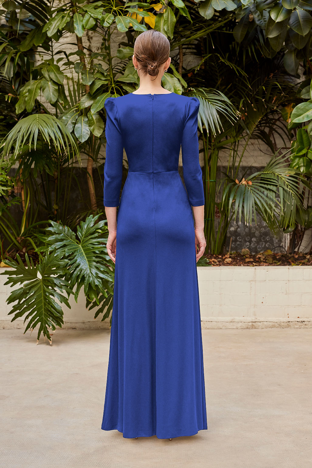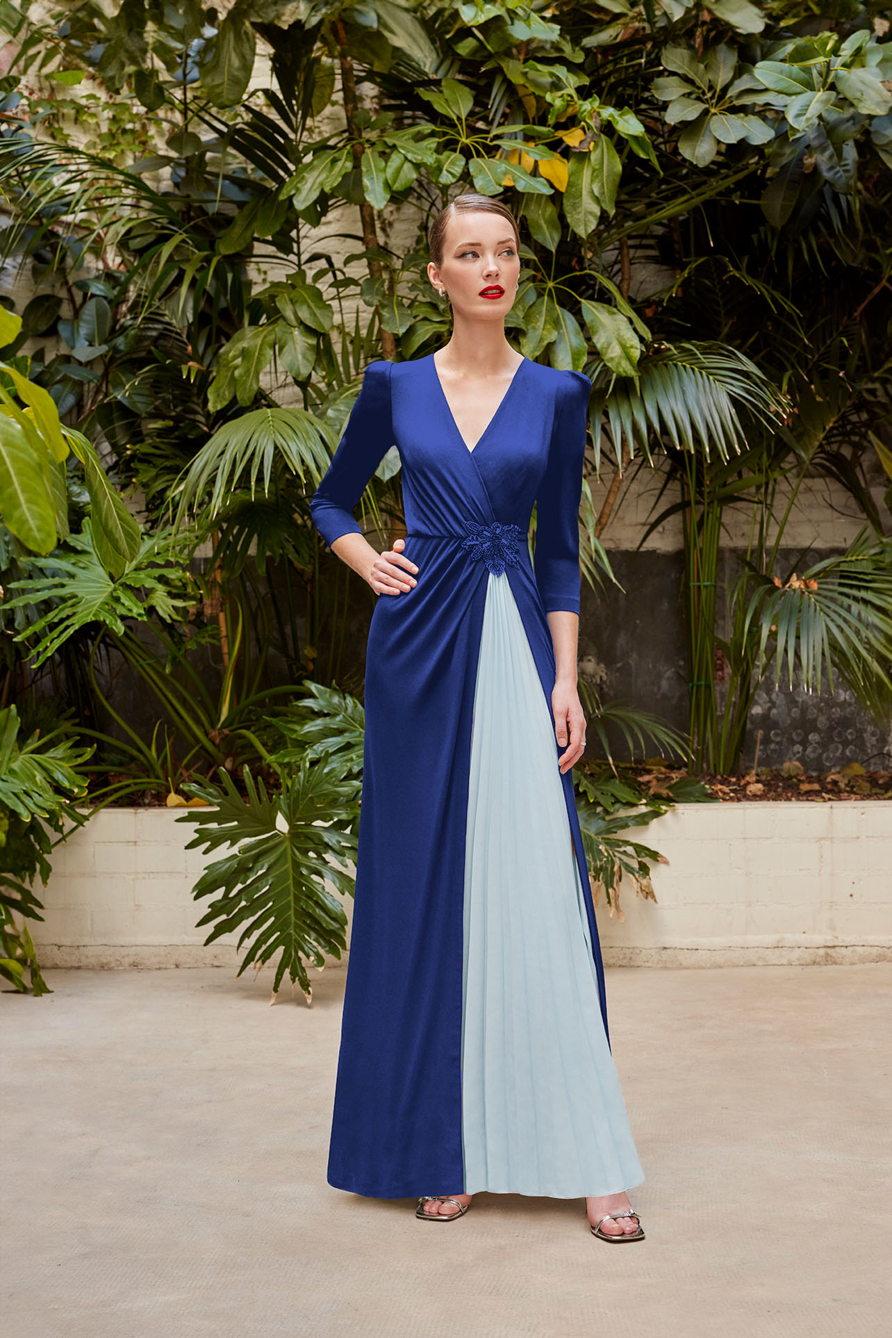 Abito cerimonia donna lungo bicolore blu/verdino con maniche, scollato a V impreziosito da applicazioni in pizzo ricamato, realizzato in tessuto di Jersey e voile plissè.