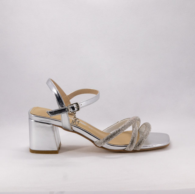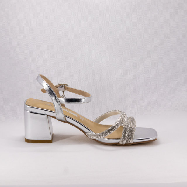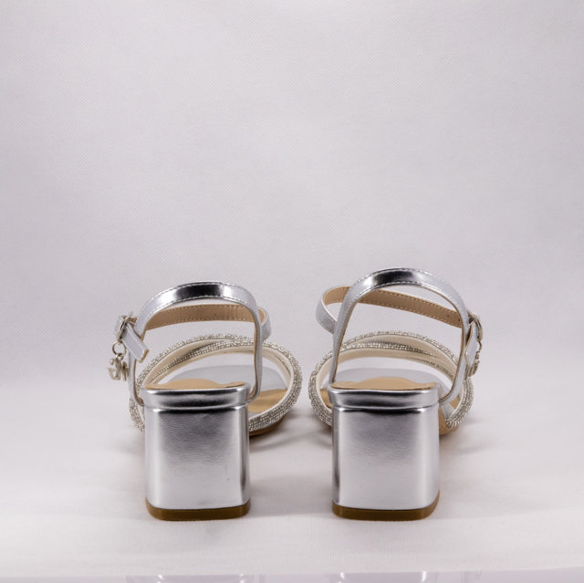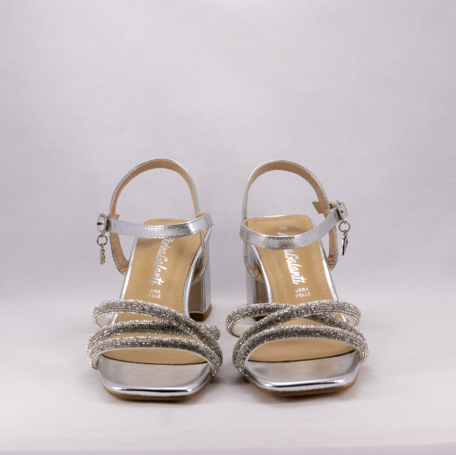 Sandalo cerimonia donna e sposa in color argento luminoso impreziosito da inserti in strass argento tono su tono, con tacco grosso, cinghietta regolabile alla caviglia e morbidissima soletta interna imbottita.