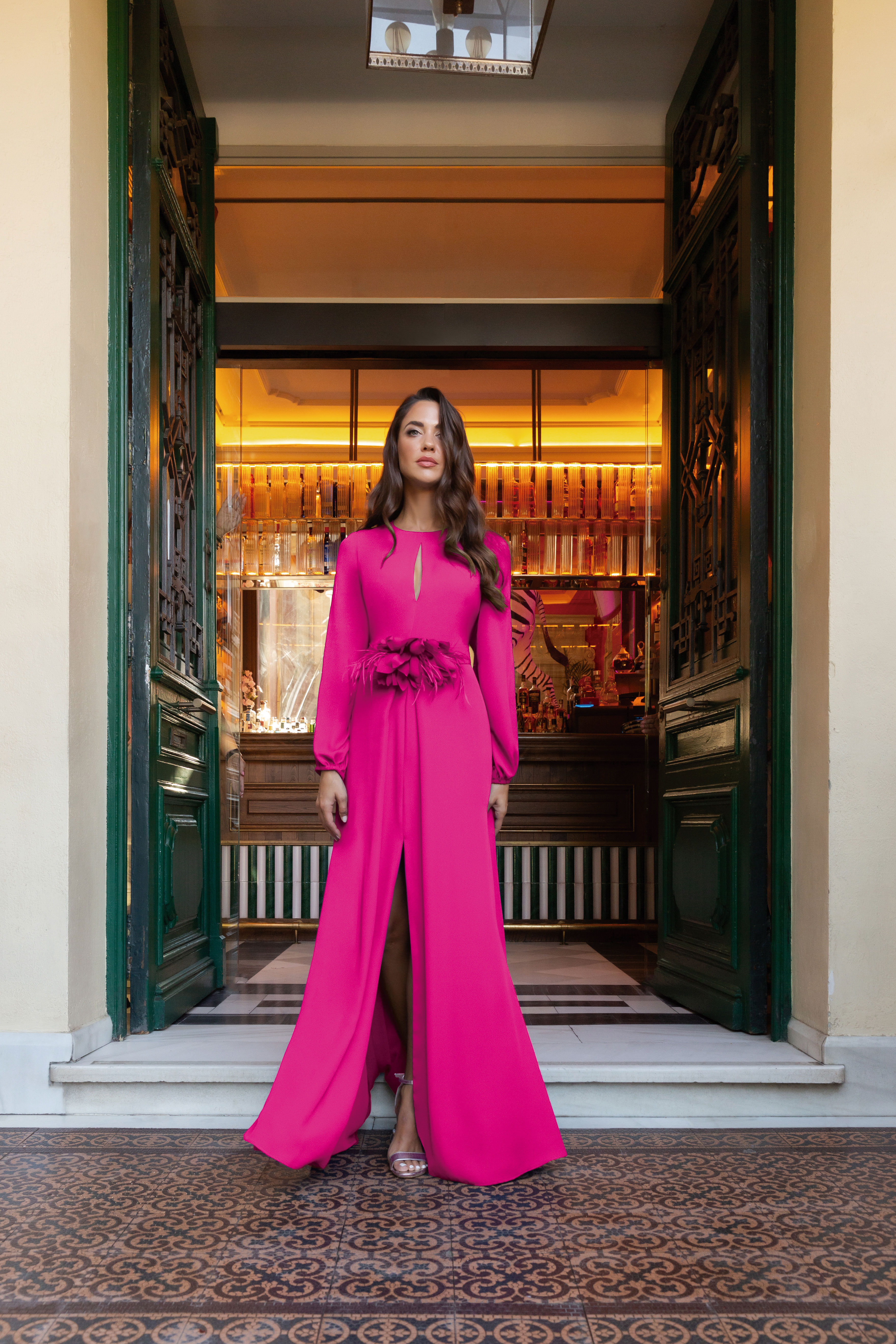 Abito cerimonia donna fuxia, lungo con scollatura particolare e maniche a sbuffo, impreziosito da applicazione floreale removibile; interamente realizzato in tessuto chiffon.