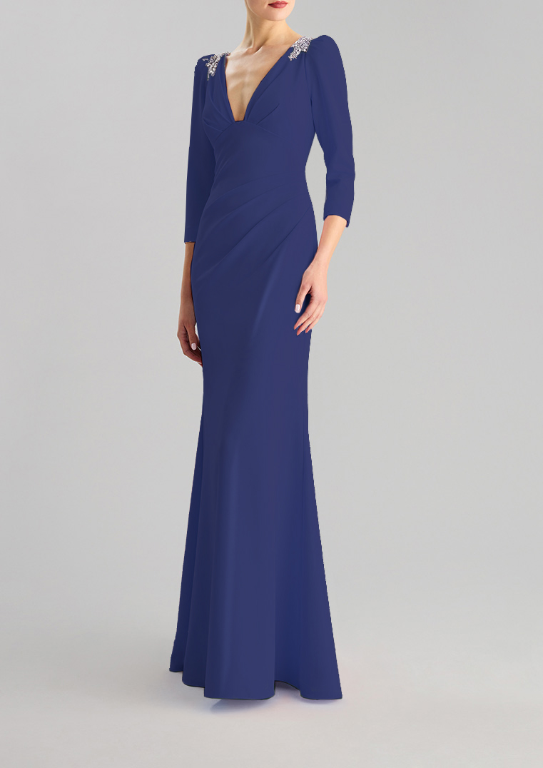 Abito cerimonia donna lungo blu navy con maniche lunghe e scollo a V, impreziosito da drappeggio in vita con applicazione cristalli argento sulle spalle. Realizzato in morbido tessuto georgette.