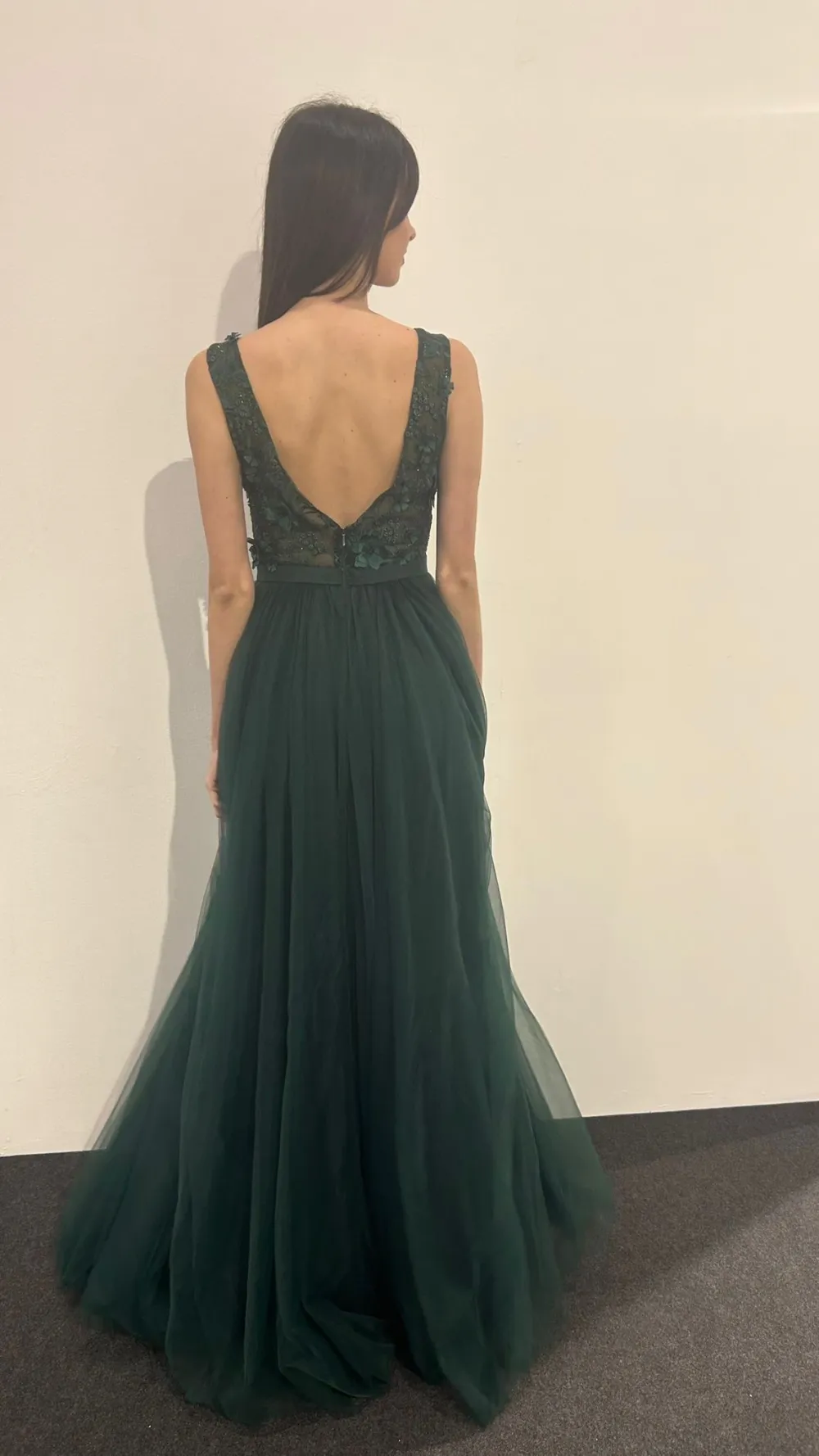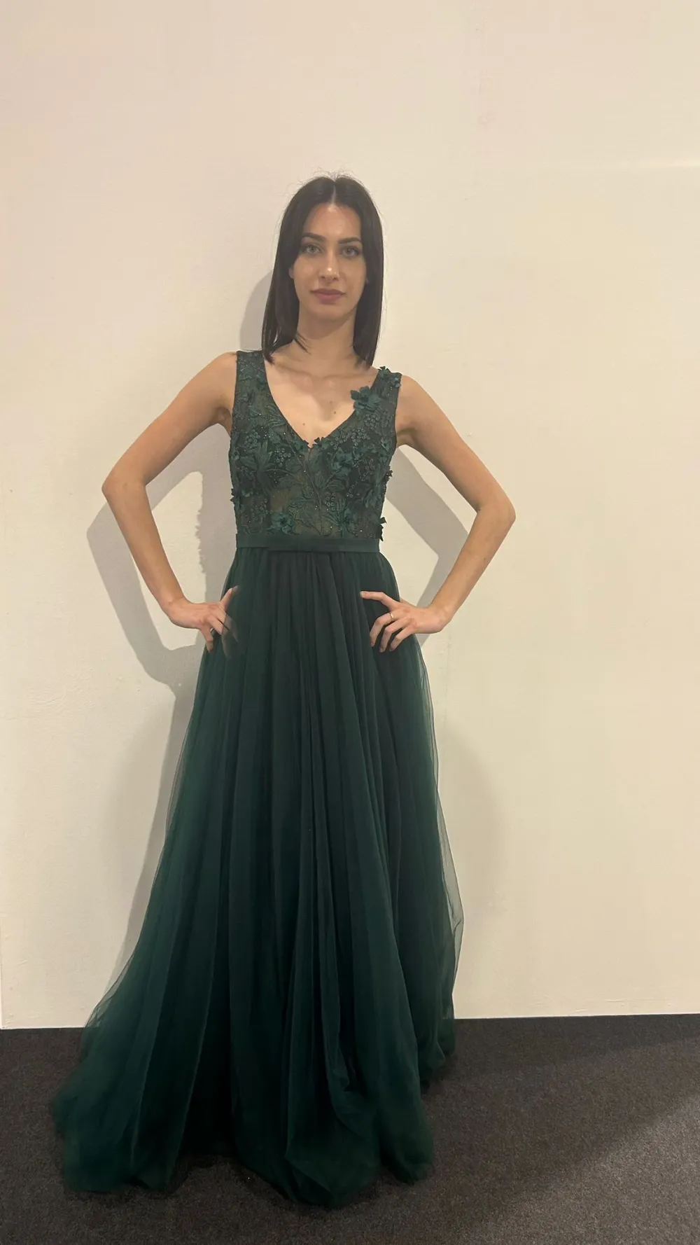 Abito cerimonia donna lungo verde bottiglia smanicato con scollo a V e spallina larga, corpetto in pizzo ricamato con trasparenza e morbida gonna lunga in tulle, decorato con fascia in vita con fiocco.