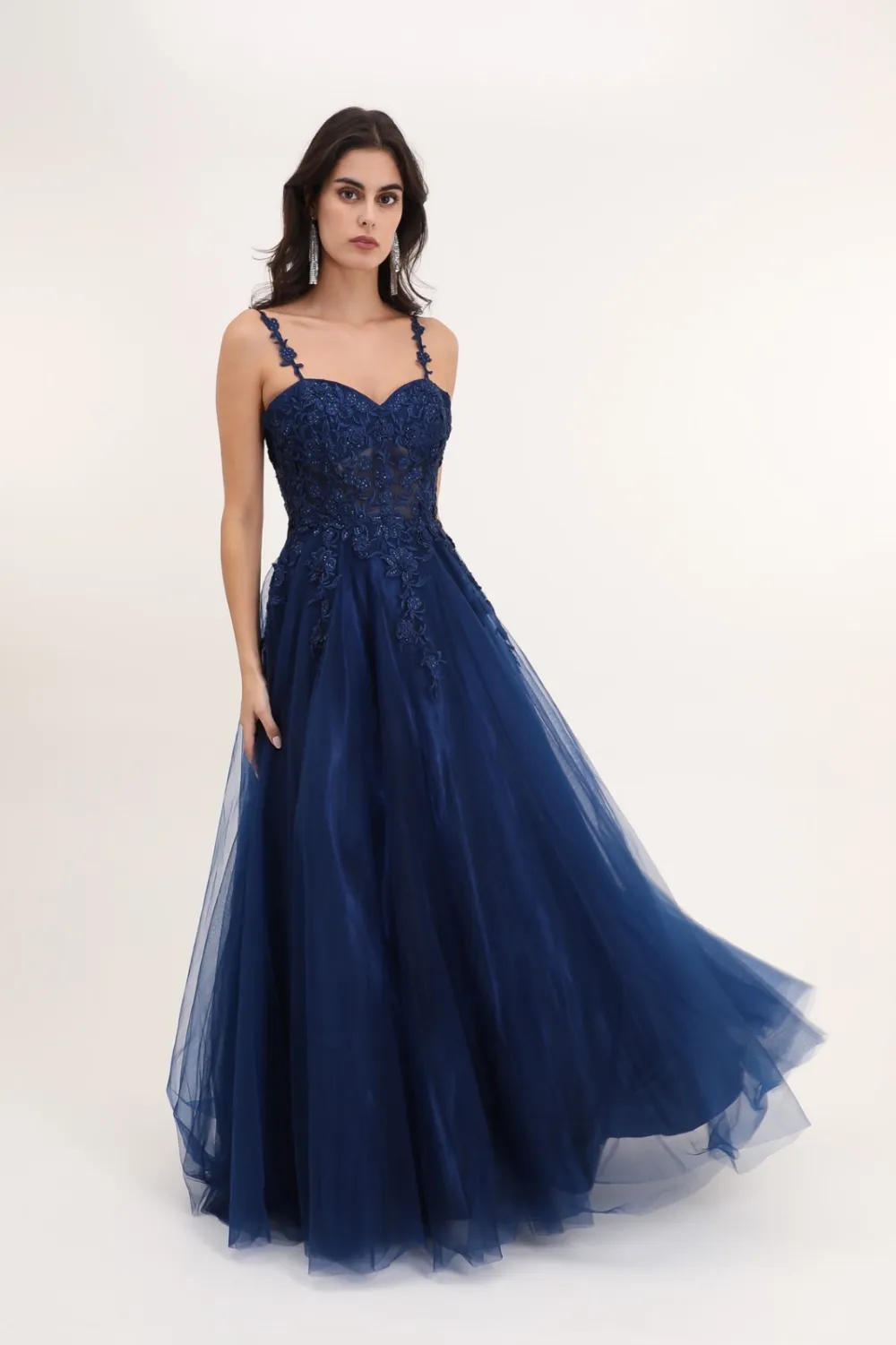 Abito cerimonia donna lungo blu con spallina sottile corpetto in pizzo ricamato con cristalli tono su tono e morbida gonna lunga in tulle.