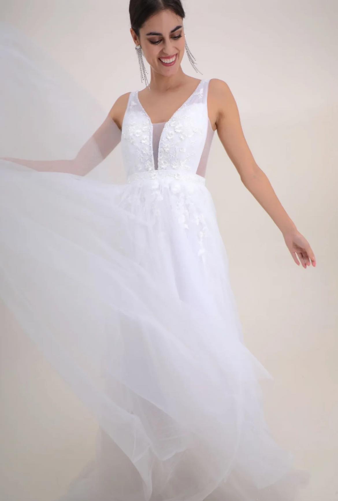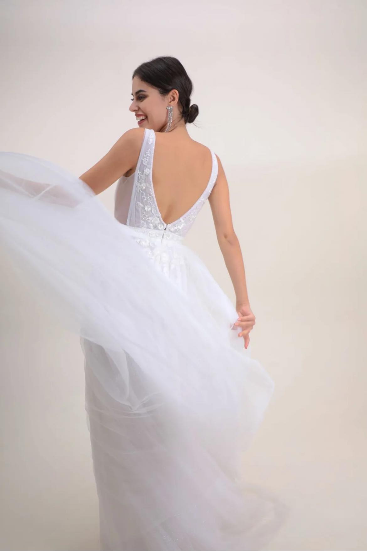 Abito sposa con scollo a V e corpetto in tulle ricamato.