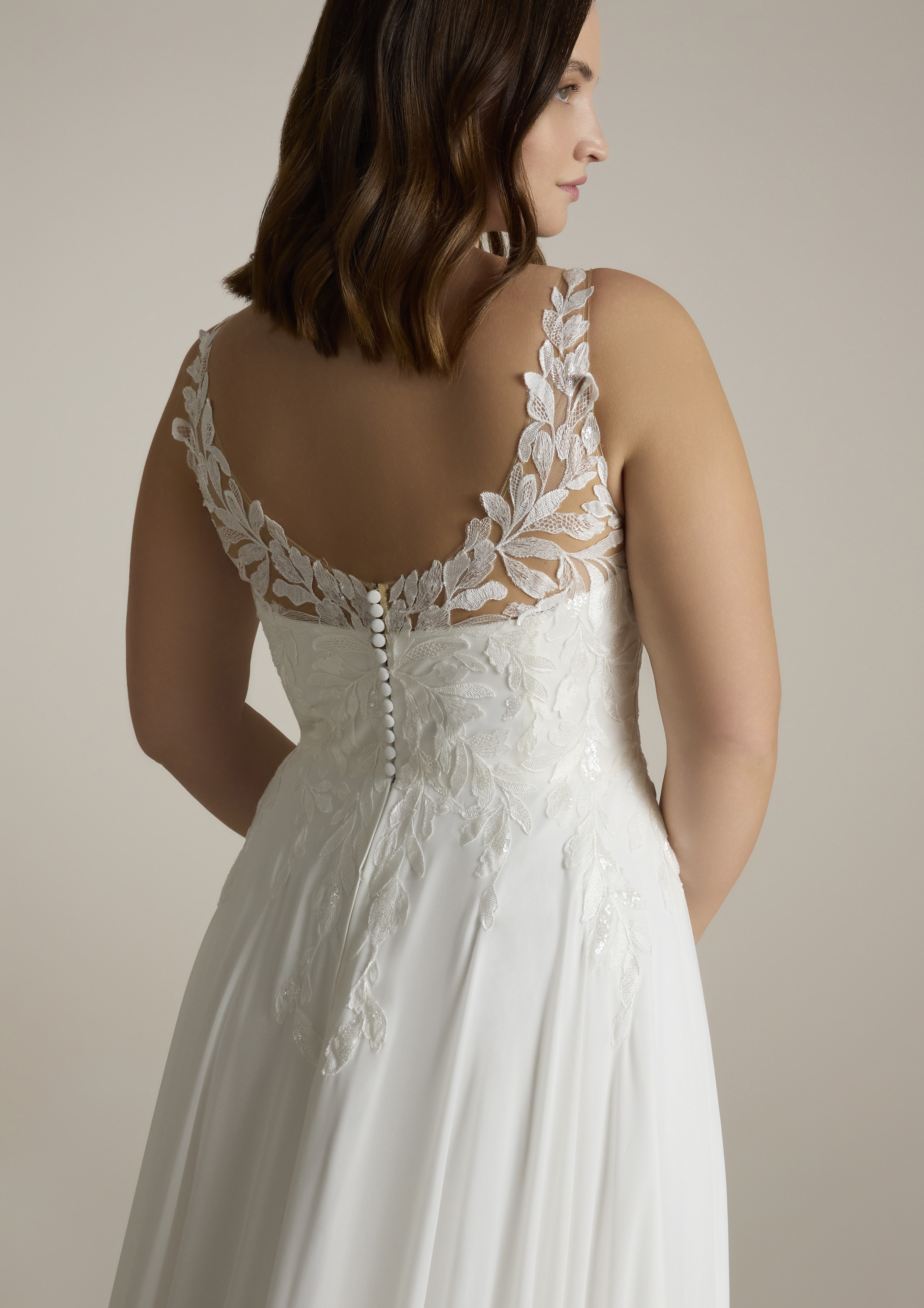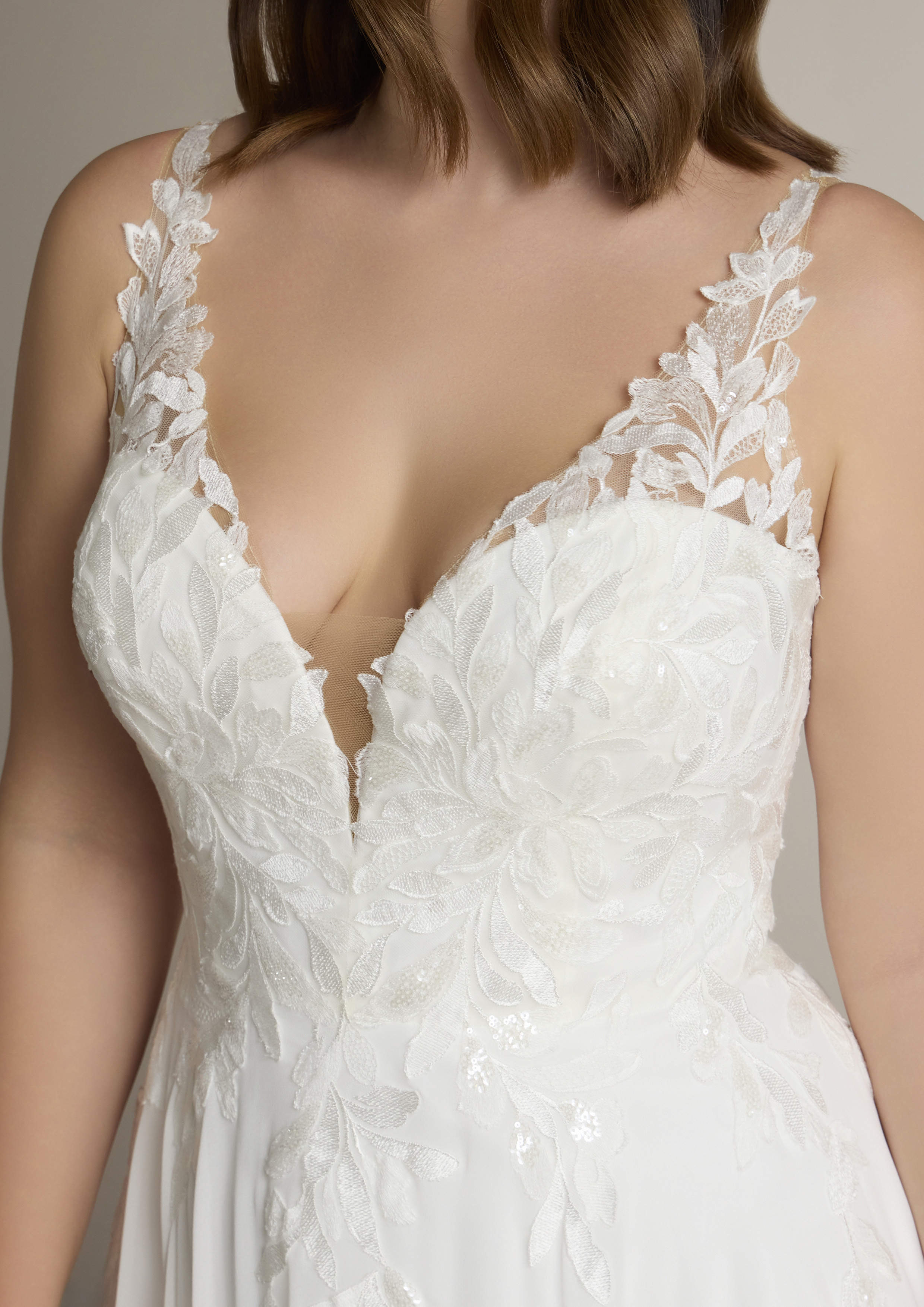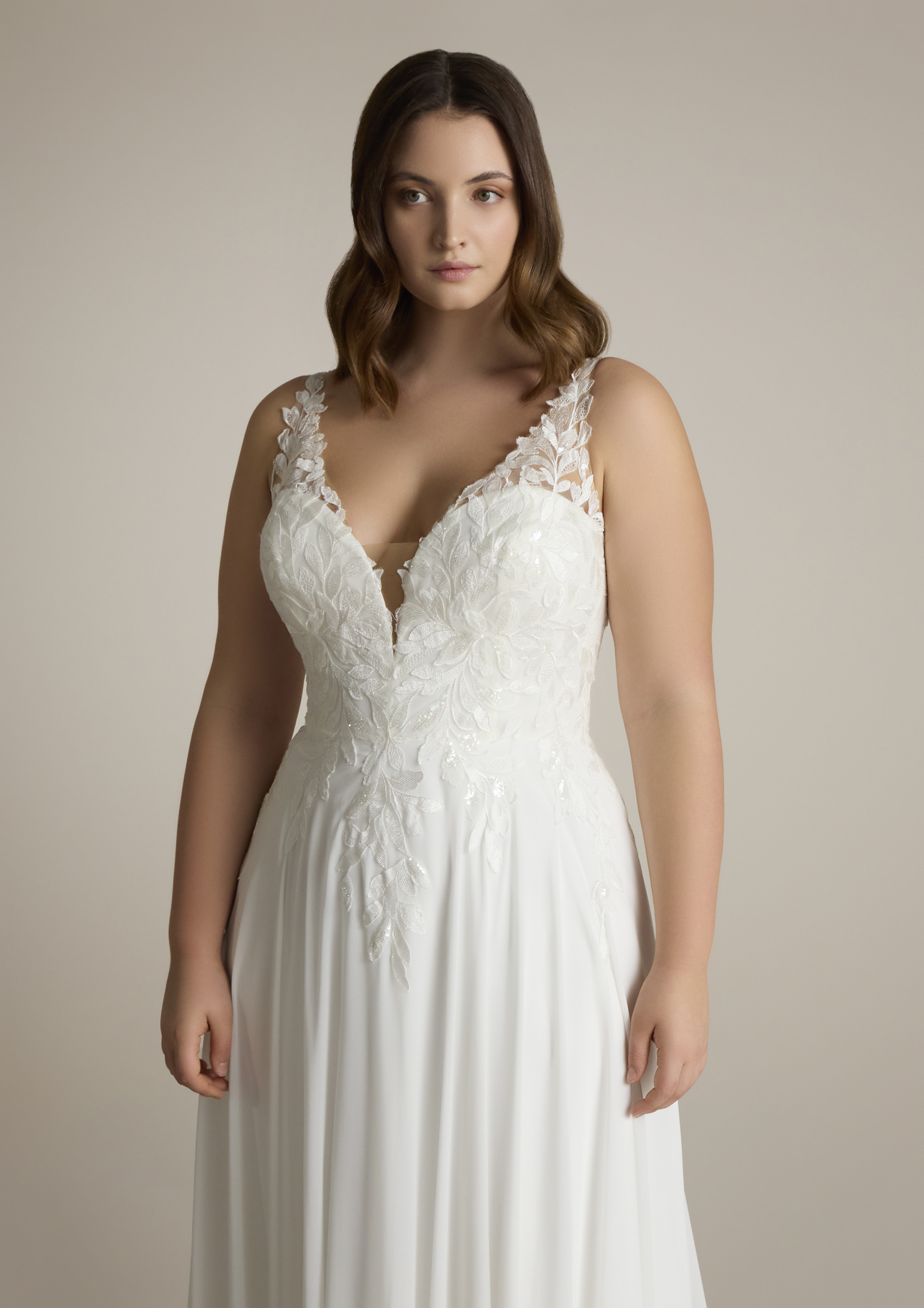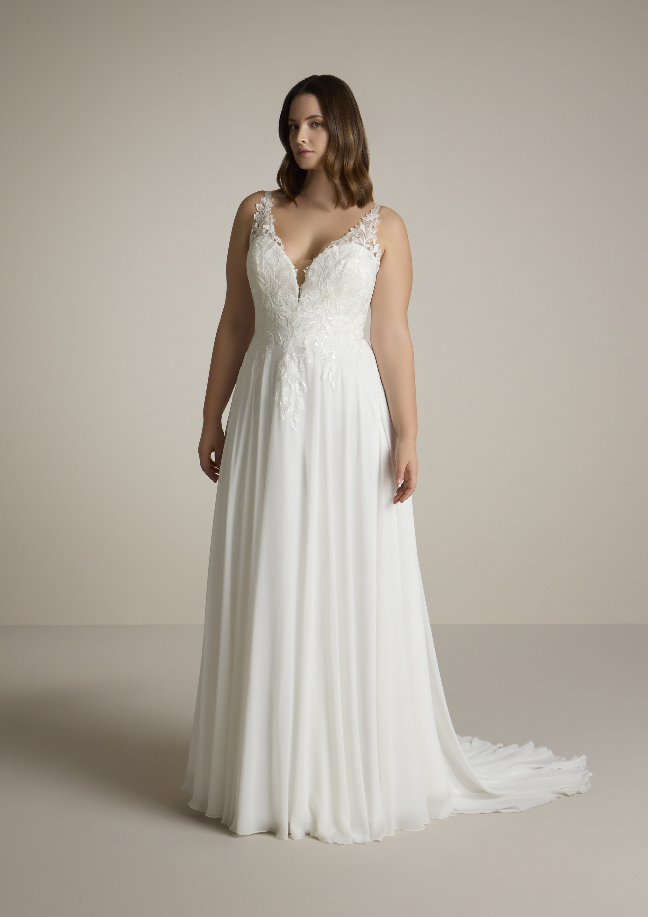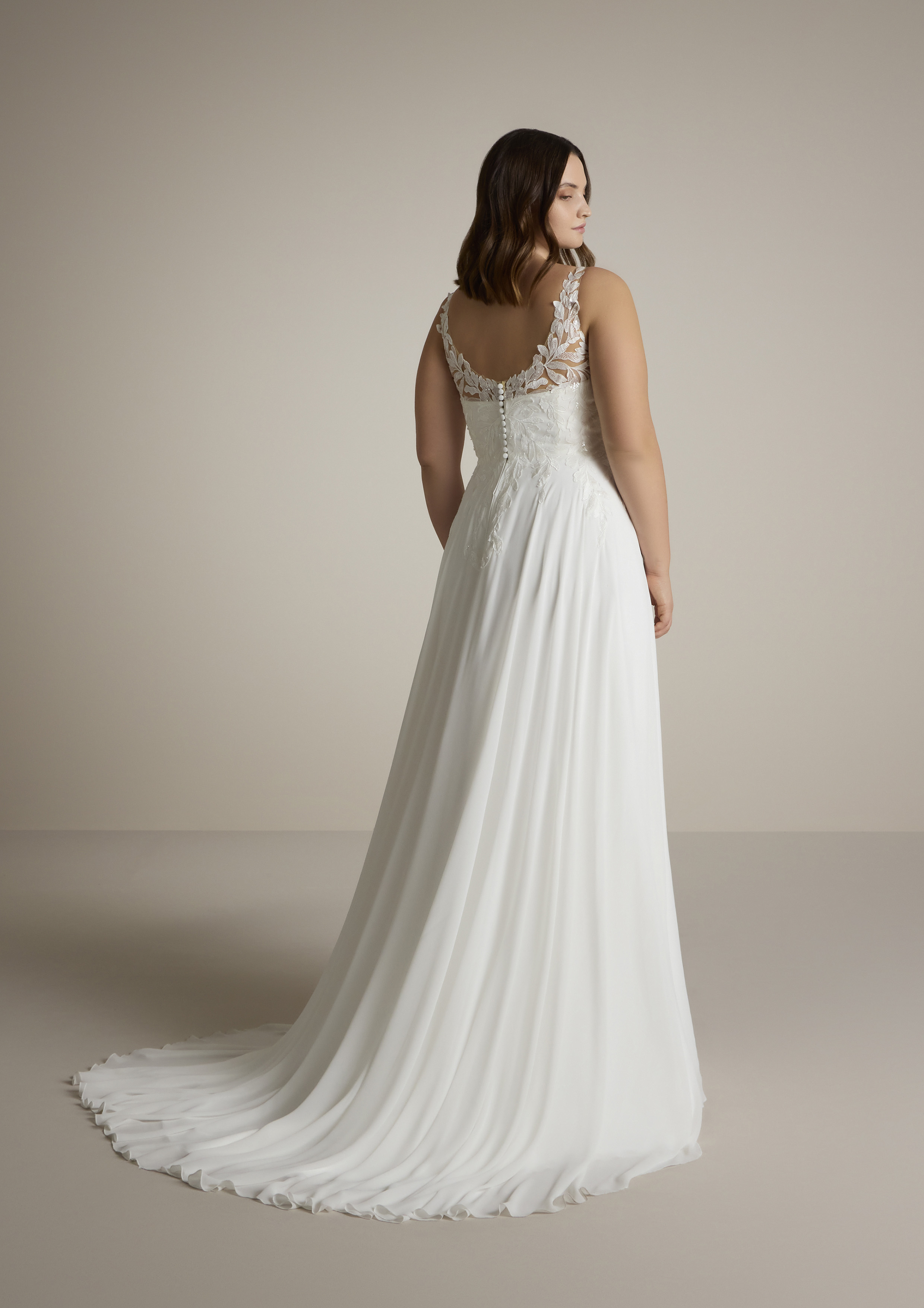 Abito sposa curvy dalla linea scivolata realizzato in morbidissimo tessuto di chiffon con corpetto di pizzo lievemente decorato con pailette e spalline in trasparenza.