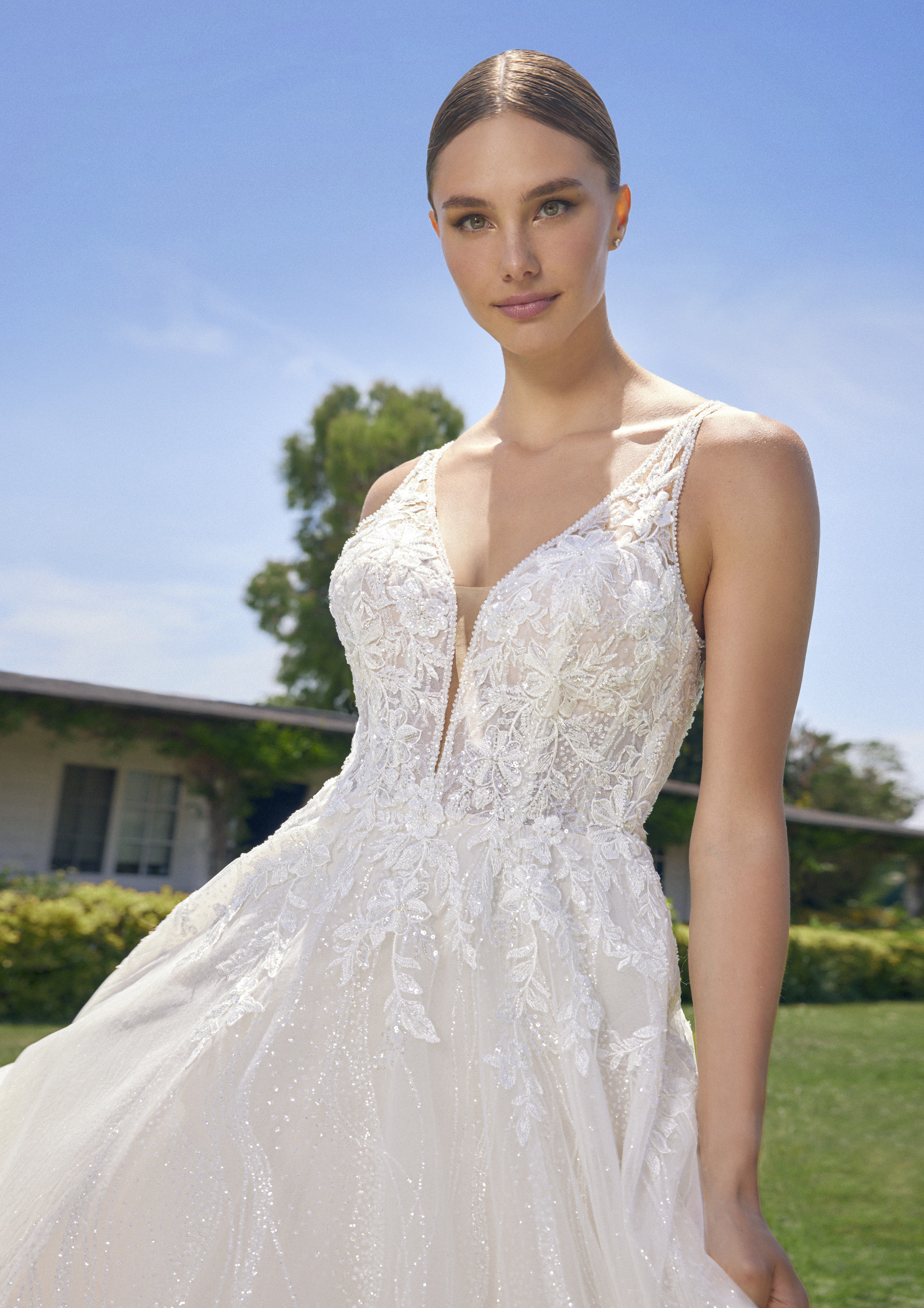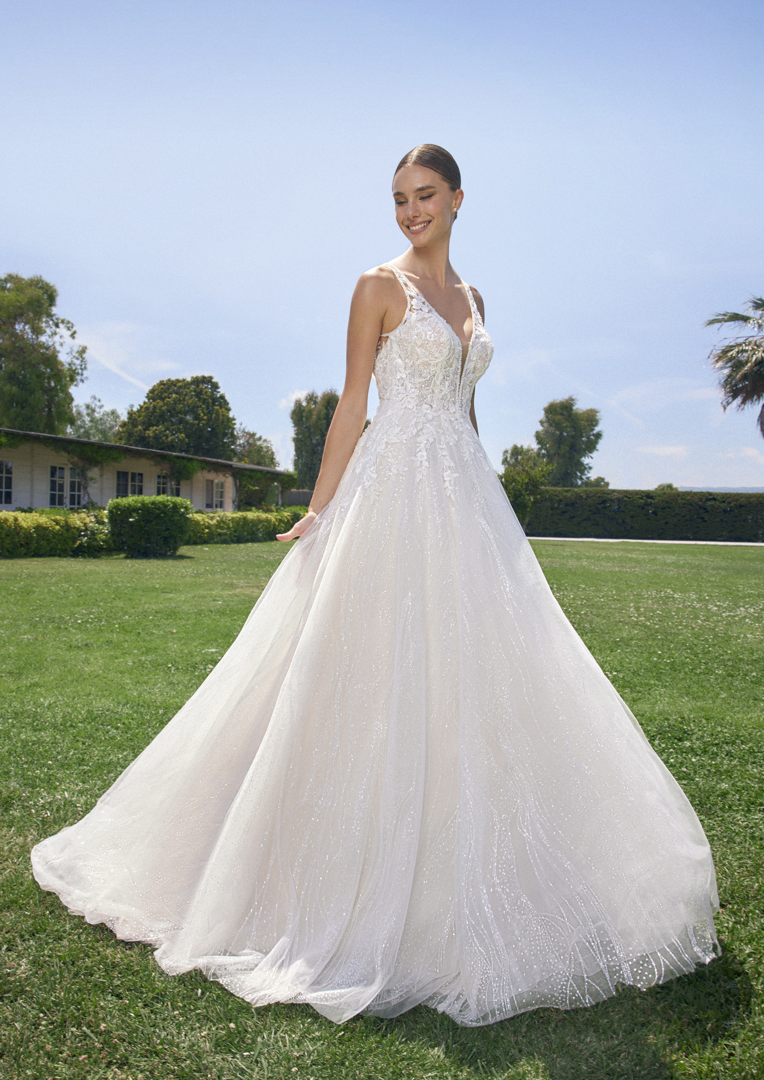 Incanta con questo abito da sposa che unisce eleganza e raffinatezza in un design mozzafiato. Realizzato con un tessuto di alta qualità, questo abito presenta una gonna ampia che fluisce con grazia, perfetta per creare un effetto principesco. Il corpetto di pizzo è finemente lavorato con ricami, impreziosito da delicati dettagli che conferiscono un tocco di lusso e romanticismo. Le spalline sottili aggiungono un tocco di delicatezza, mentre la scollatura profonda valorizza la figura, mantenendo un'eleganza senza tempo. Ideale per la sposa che desidera un look sofisticato e indimenticabile nel giorno più importante della sua vita.