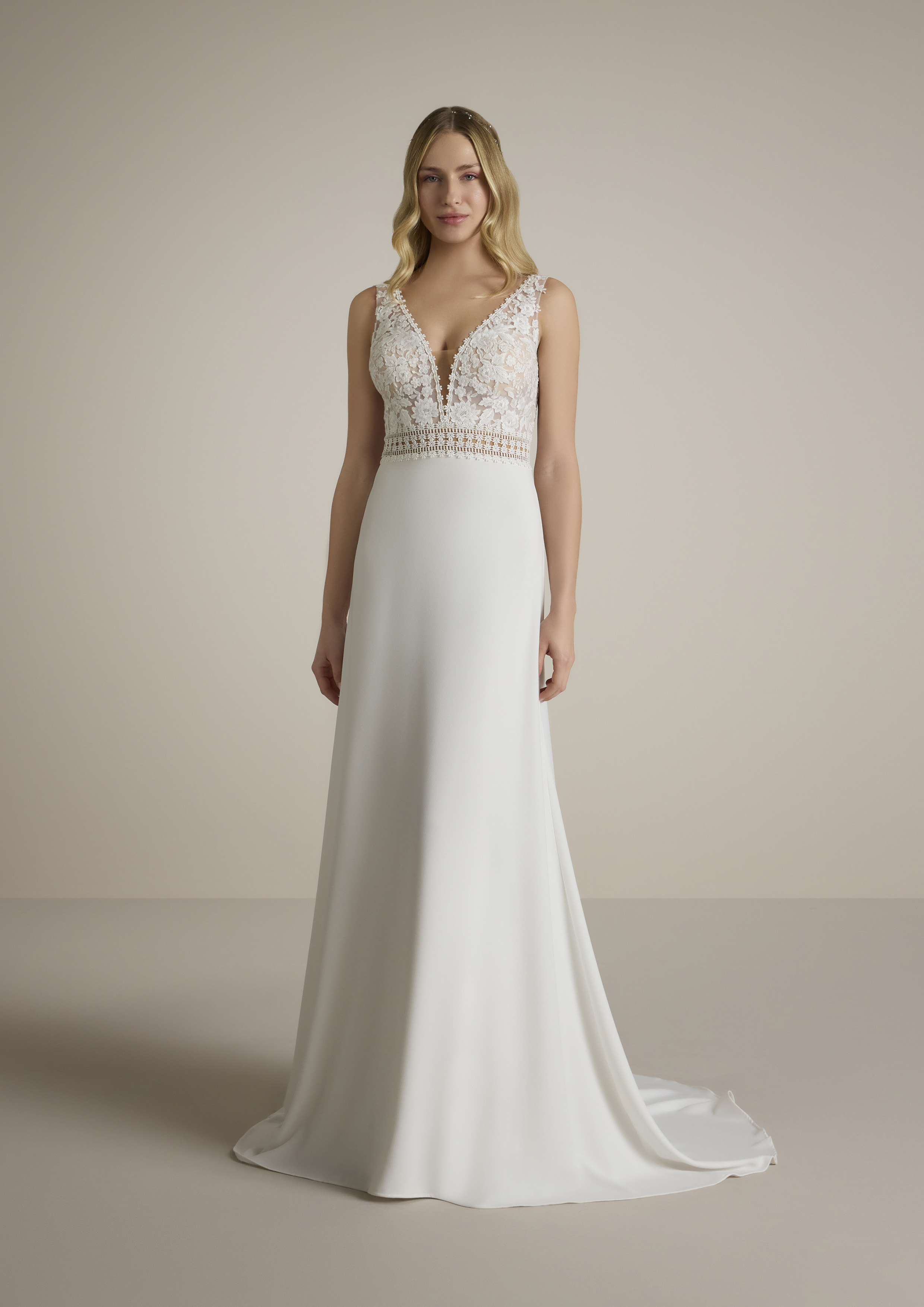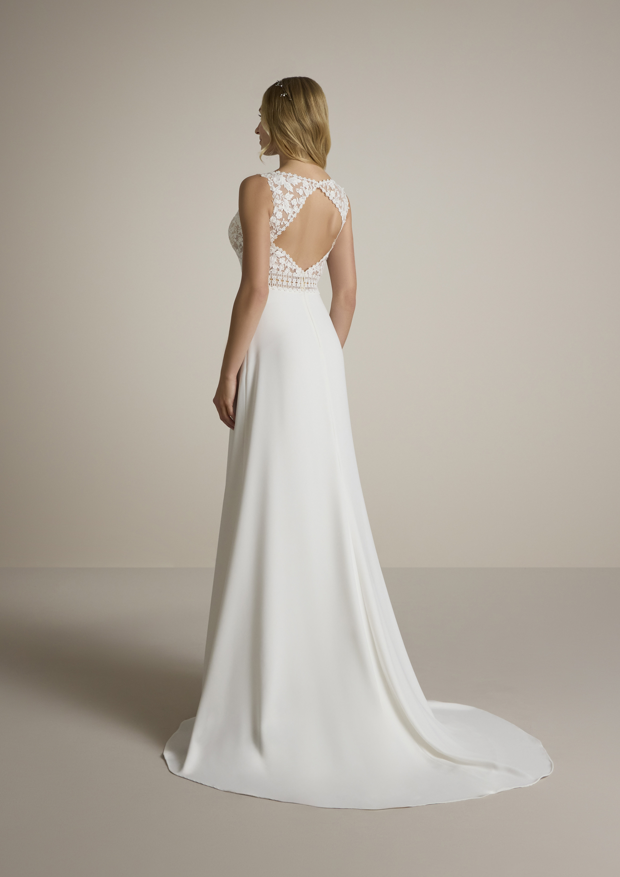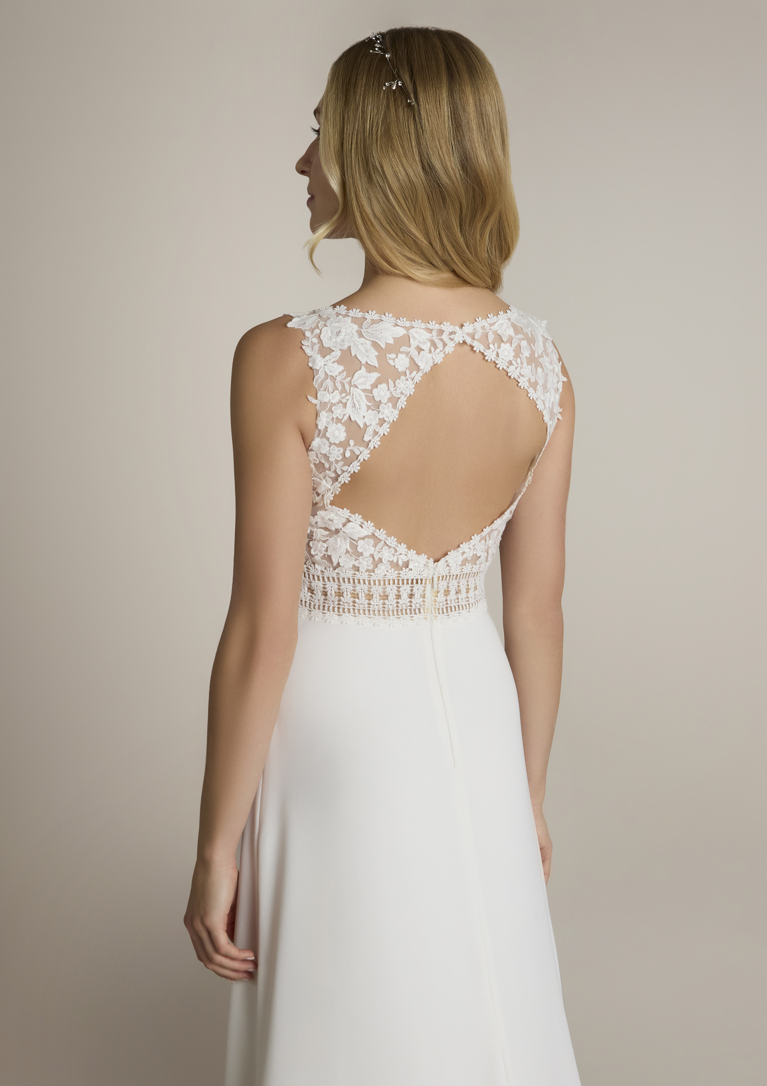 Eleganza e raffinatezza si fondono perfettamente in questo splendido abito da sposa. Il corpetto in pizzo, finemente ricamato, esalta la silhouette con dettagli delicati, mentre la scollatura a oblò sulla schiena aggiunge un tocco di sensualità e modernità al design. La gonna, realizzata in leggero tessuto chiffon, cade morbida e fluente, creando un movimento armonioso ad ogni passo. Questo abito è ideale per la sposa che desidera un look sofisticato e femminile, caratterizzato da una combinazione di tradizione e stile contemporaneo. Perfetto per chi cerca un outfit che catturi l'attenzione con classe e delicatezza nel giorno più speciale.