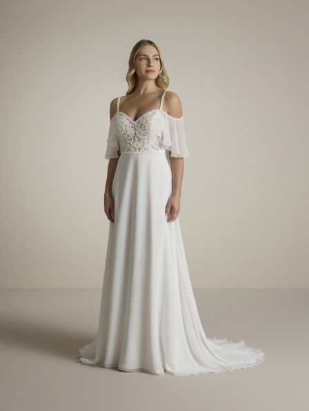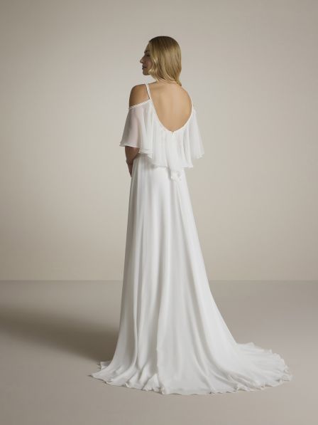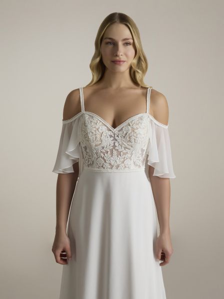 Un morbido effetto in chiffon scivola dolcemente dalle spalle, creando un movimento leggero e romantico che avvolge la figura in un'aura eterea. La gonna scivolata, anch'essa in chiffon, segue con grazia le forme del corpo, garantendo un effetto fluido e leggero. Questo abito è pensato per la sposa che desidera un look sofisticato, ma al contempo romantico e moderno, perfetto per un matrimonio da sogno.