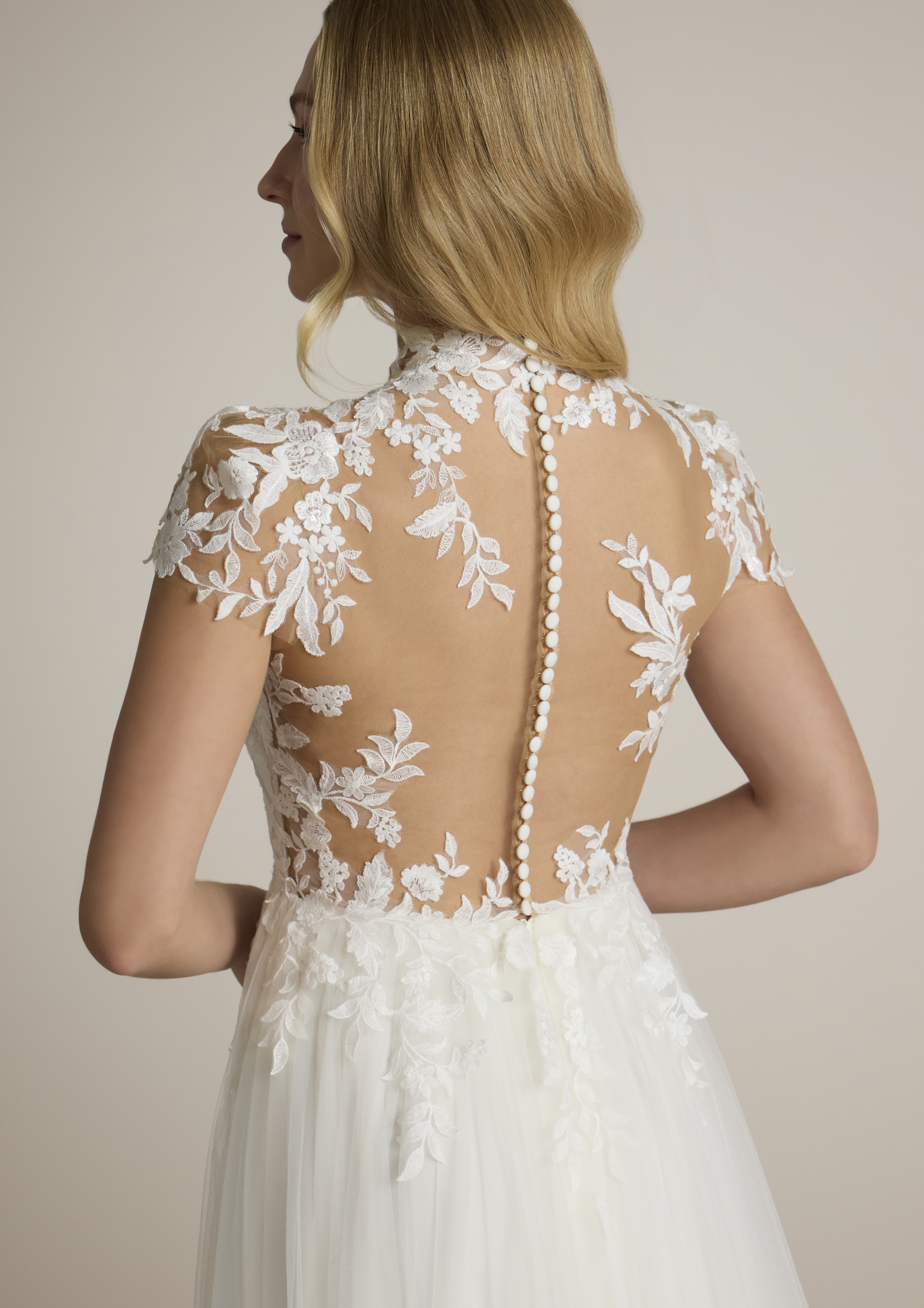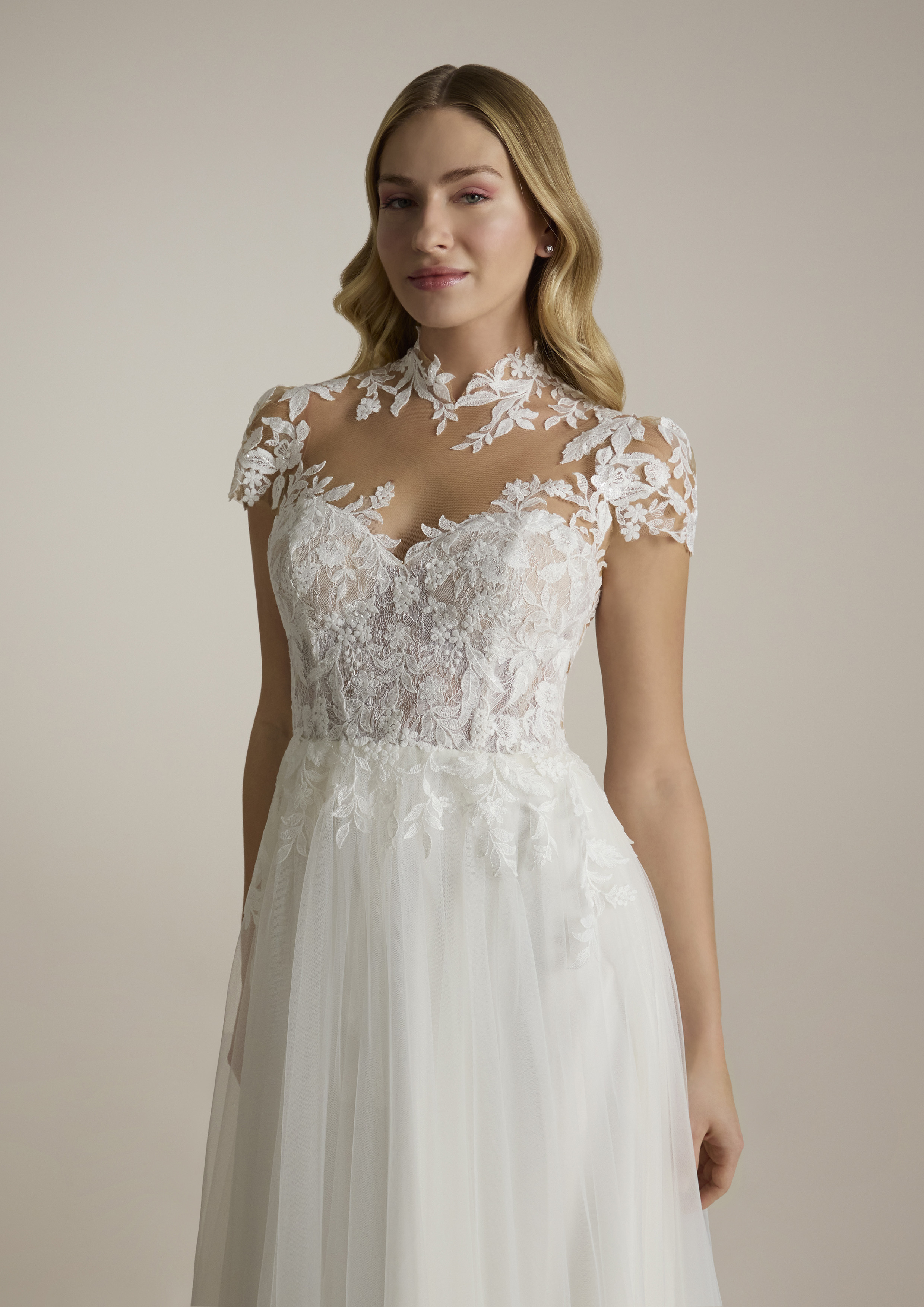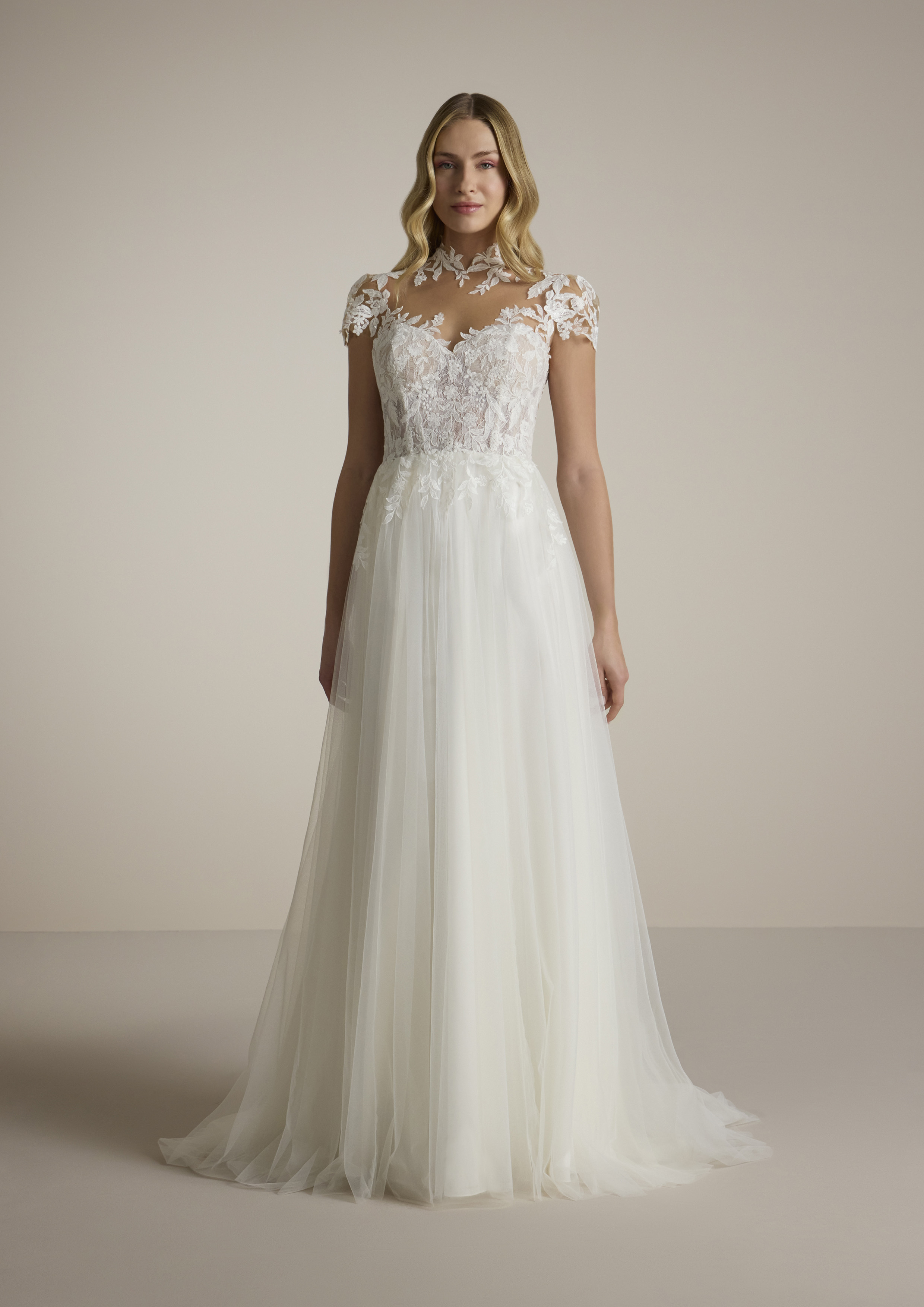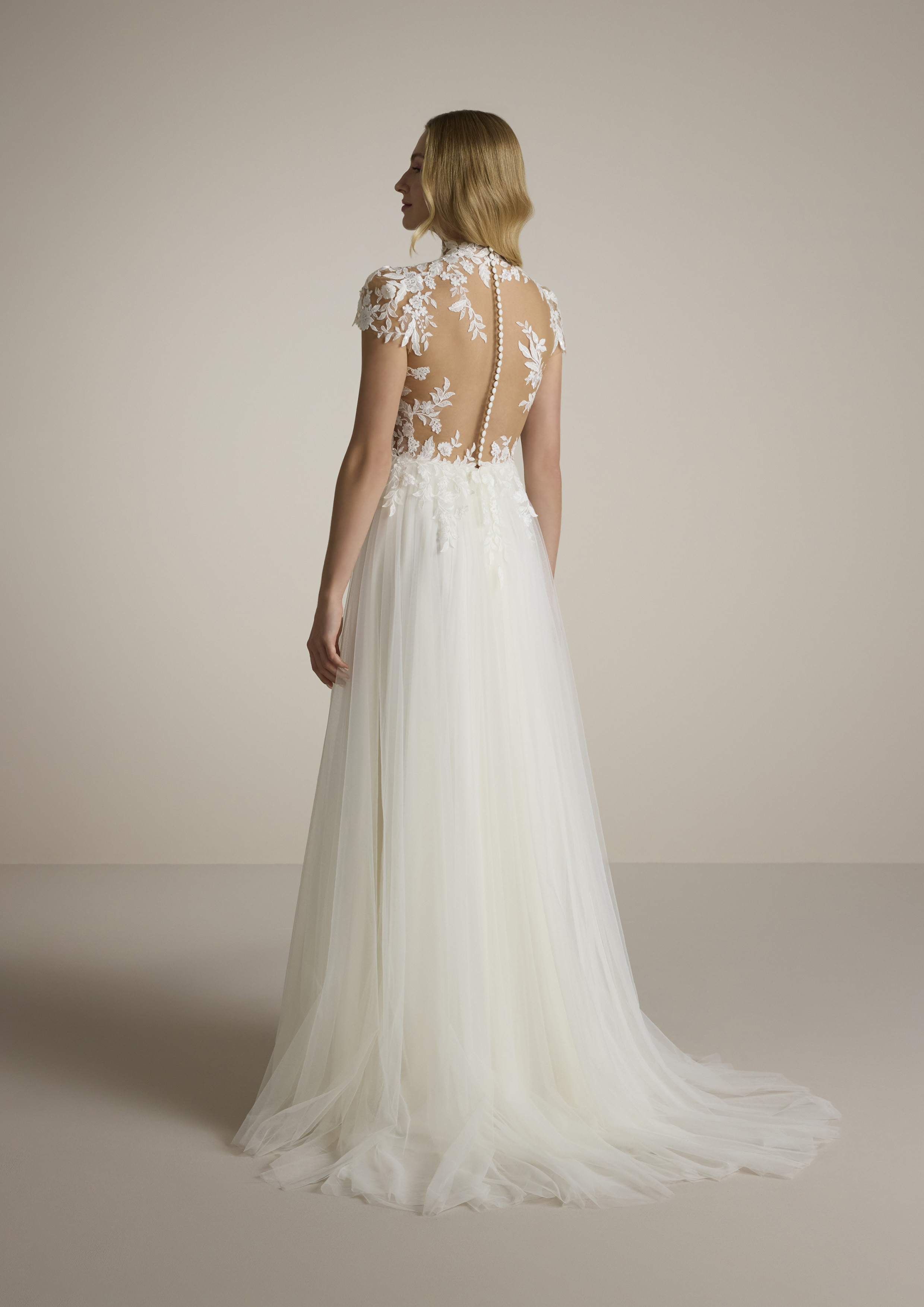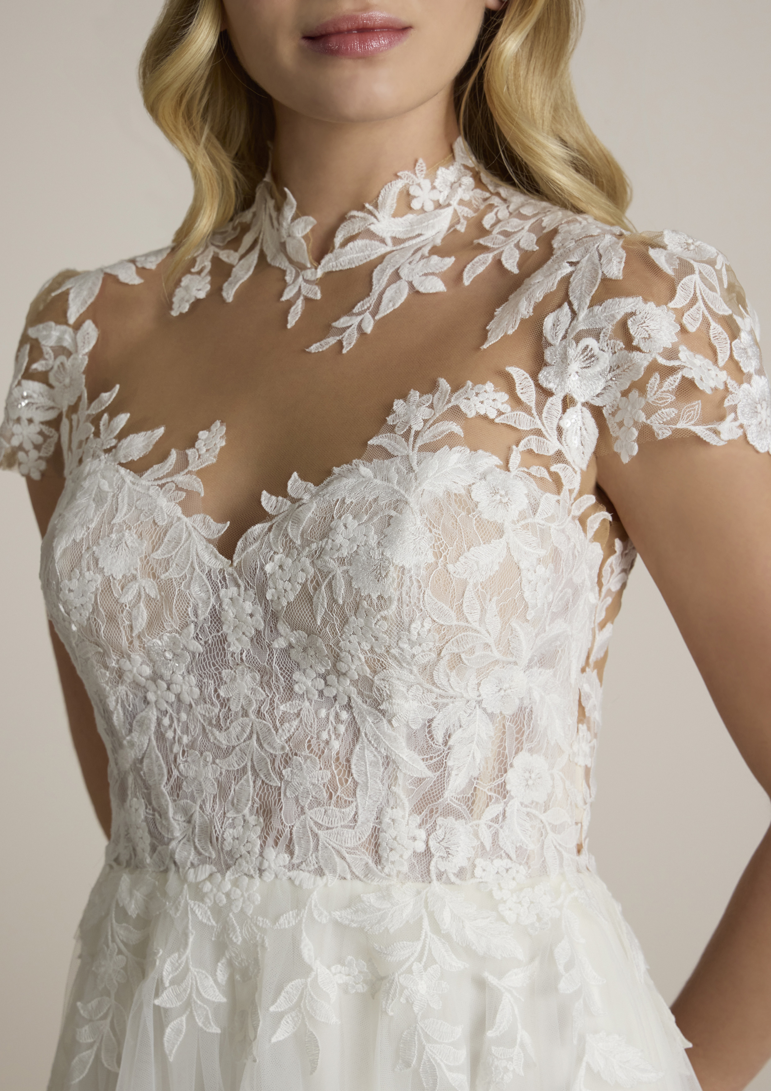 Ammalia con un abito da sposa che combina eleganza e raffinatezza in ogni dettaglio. Realizzato in tulle leggero e delicato, questo abito incarna il sogno romantico di ogni sposa. Il corpetto è impreziosito da un collo alto che dona un tocco di regalità e classe, mentre le maniche corte in tulle creano un equilibrio perfetto tra tradizione e modernità.