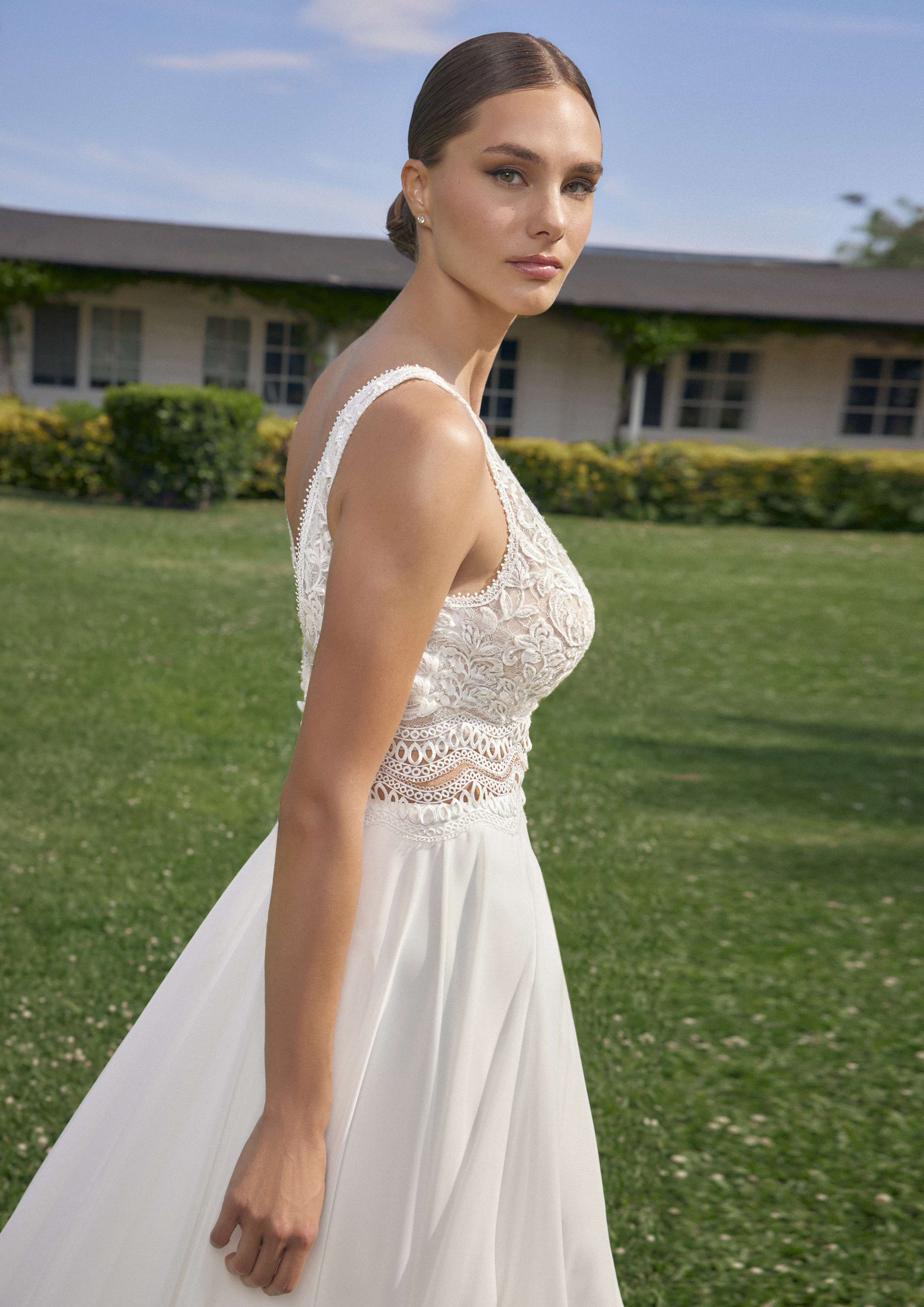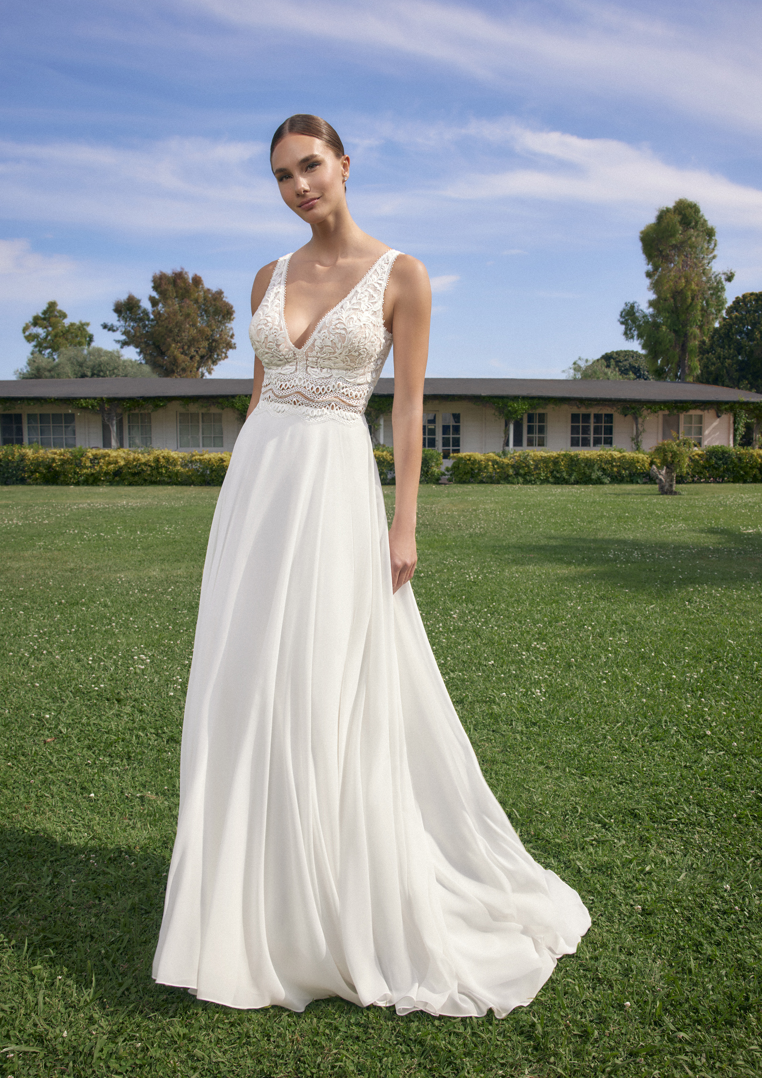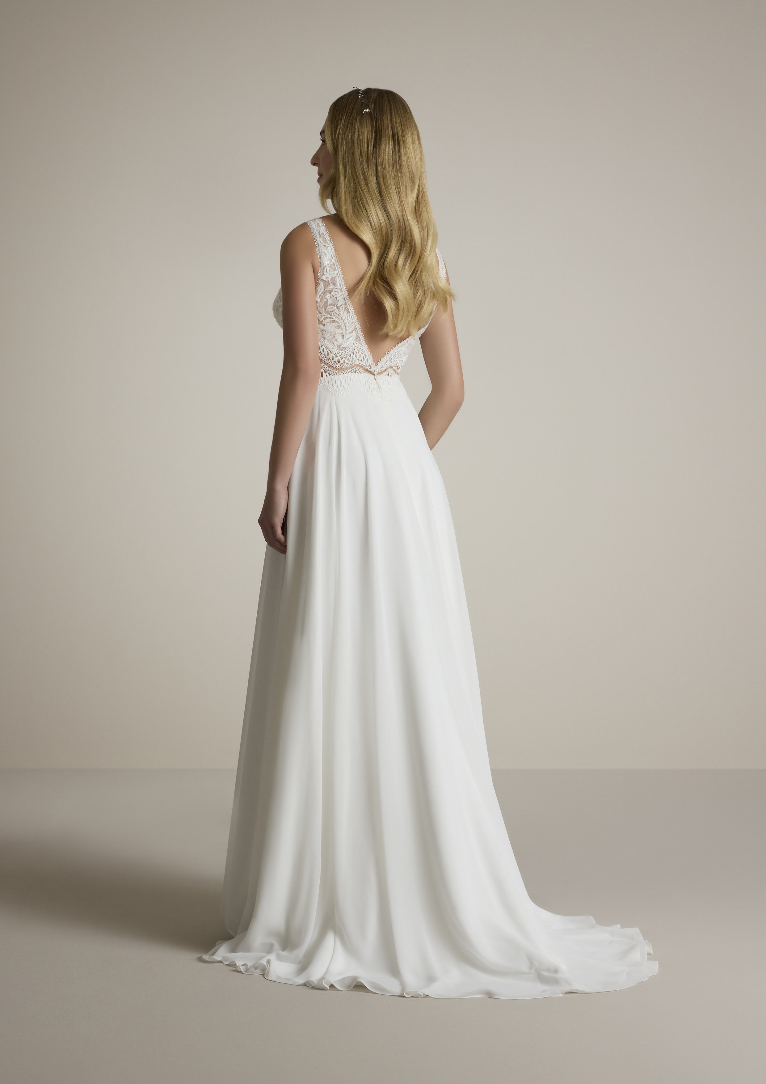 La gonna in chiffon leggero cade fluida e morbida, regalando un movimento armonioso e un effetto etereo ad ogni passo. Questo abito è pensato per esaltare ogni tipo di fisicità, garantendo alla sposa comfort e leggerezza durante tutta la giornata del suo matrimonio.