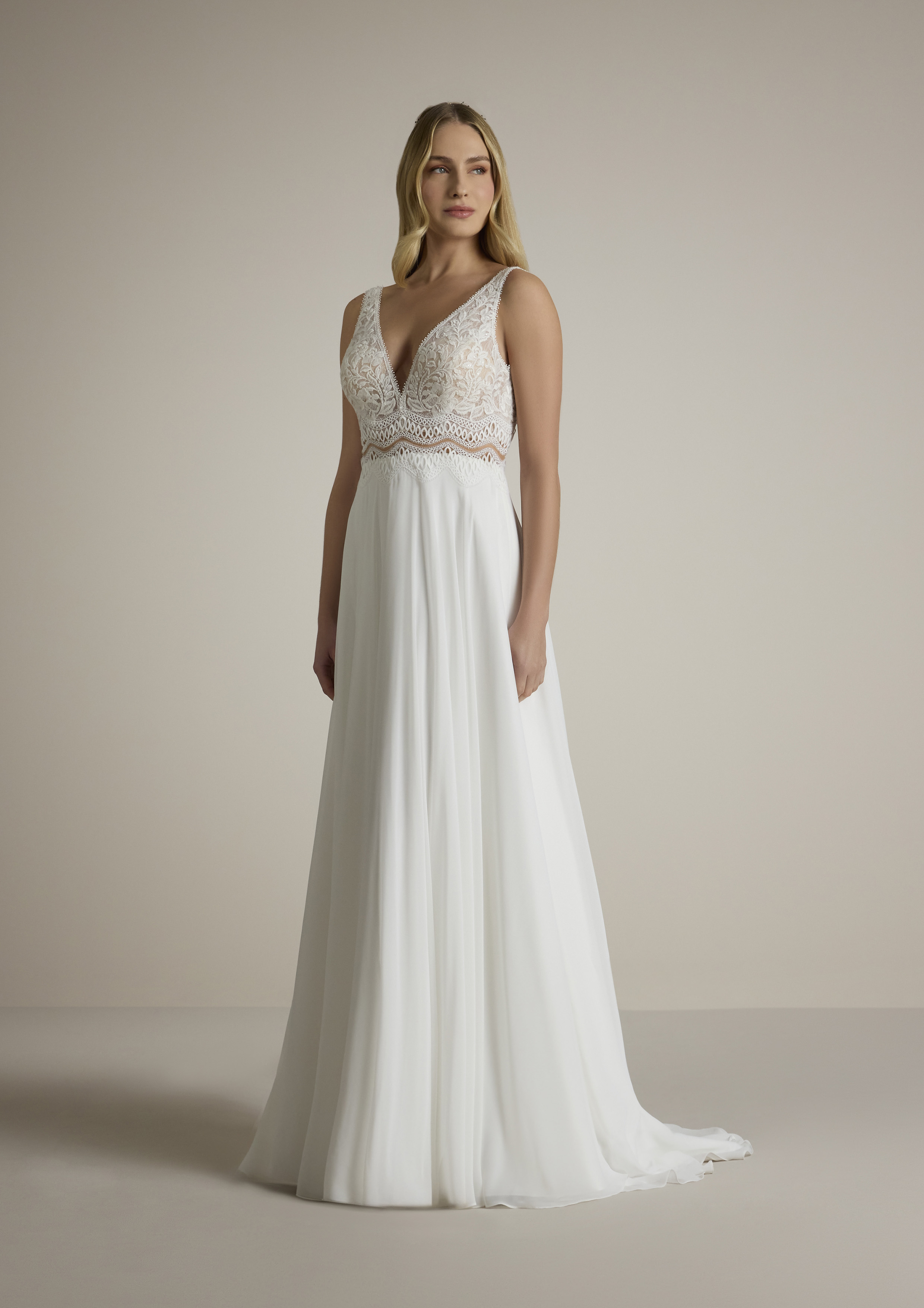 Lasciati avvolgere dall'eleganza delicata e raffinata del nostro abito da sposa in pizzo e chiffon, ideale per la sposa moderna che desidera un look etereo ma sofisticato. Il corpino in pizzo lavorato a mano con dettagli floreali esalta con grazia la silhouette, mentre la scollatura a V profonda aggiunge un tocco di sensualità senza rinunciare alla classe. La fascia sottoseno presenta un ricamo a intaglio che dona al design un tocco di originalità e femminilità, perfetto per evidenziare la vita.