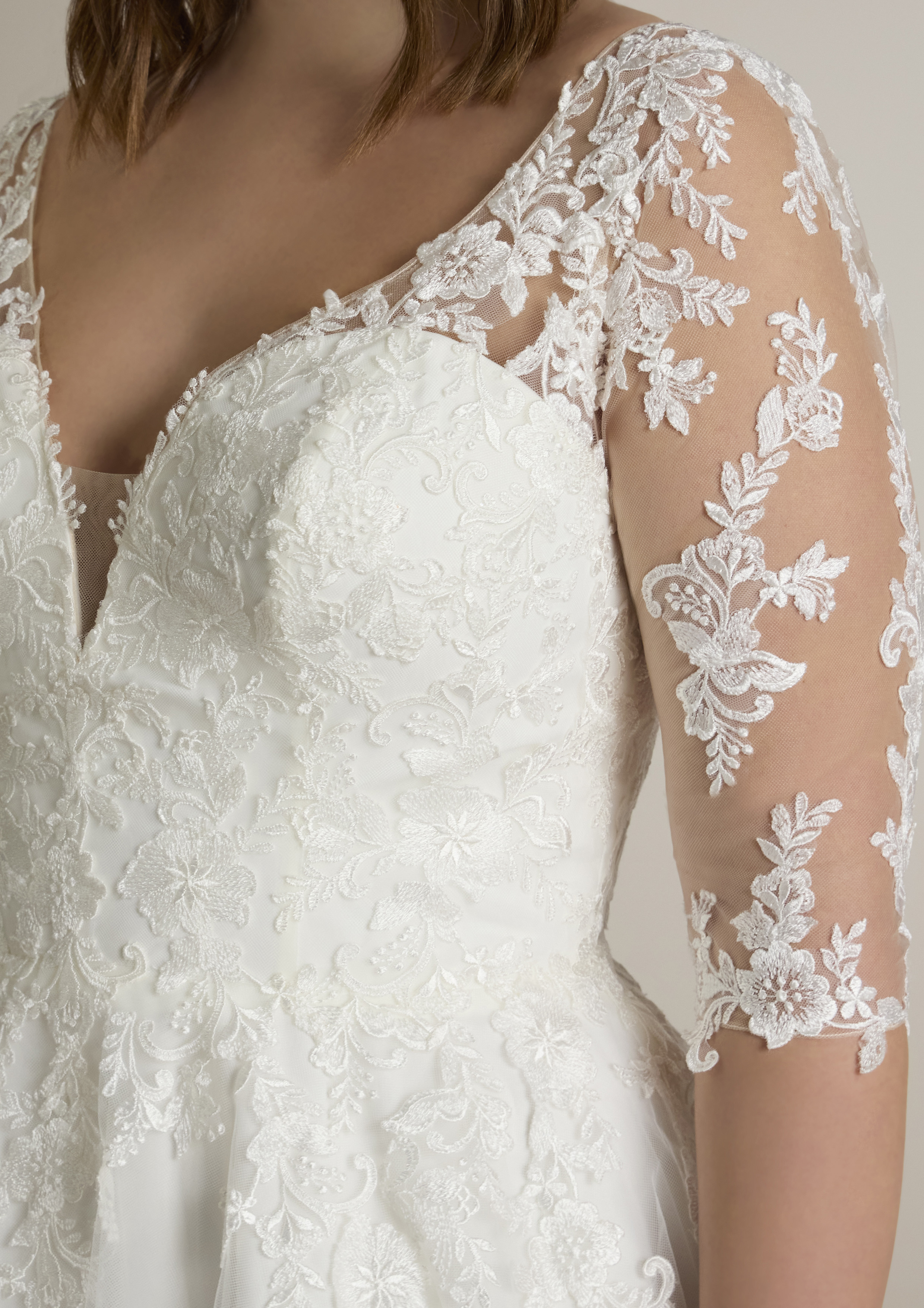 Scopri l’eleganza senza tempo con questo incantevole abito da sposa caratterizzato da una combinazione di tessuti ricercati e dettagli raffinati. Il corpetto in pizzo, arricchito da un delicato motivo floreale, si sposa perfettamente con la scollatura a cuore e le maniche trasparenti a tre quarti, che aggiungono un tocco di romanticismo e femminilità. La scollatura profonda a V, sia sul davanti che sul retro, slancia la figura e valorizza il décolleté con sofisticata discrezione.