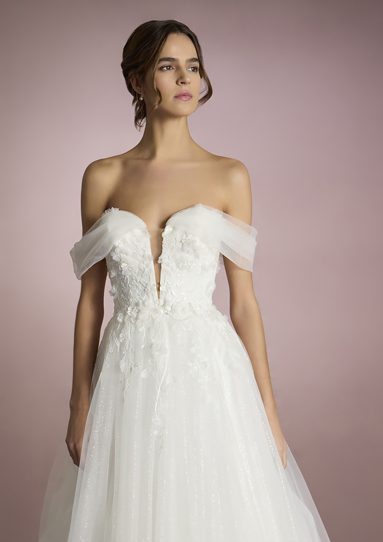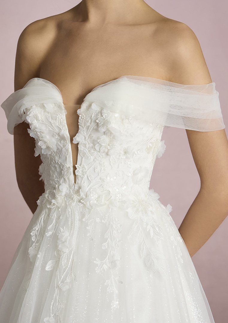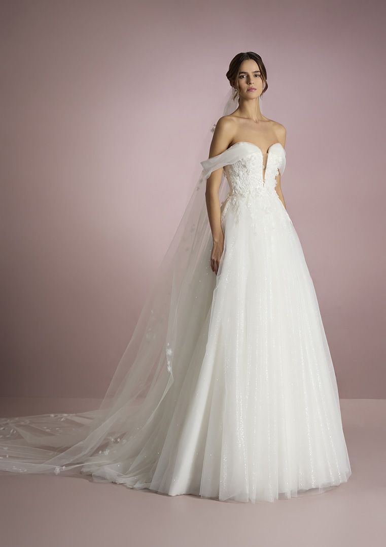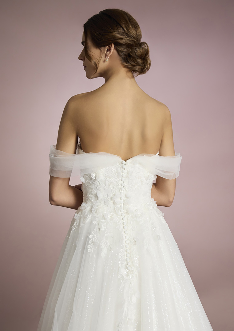 Perfetto per la sposa che desidera un look da favola, questo abito da sposa incarna la bellezza romantica con dettagli mozzafiato. Il corpetto, con scollo a cuore e una delicata apertura centrale, è ricamato con preziose applicazioni floreali, aggiungendo un tocco di eleganza senza tempo. Le maniche drappeggiate scivolano delicatamente sulle spalle, offrendo un effetto etereo e leggero che enfatizza la bellezza del décolleté.