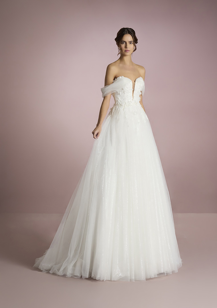 La gonna, realizzata in morbido tulle leggermente scintillante, crea un effetto voluminoso ma leggero, regalando alla sposa un aspetto principesco e da sogno. Ideale per cerimonie classiche e romantiche, questo abito è pensato per chi desidera un look sofisticato con un tocco di modernità e sensualità.
