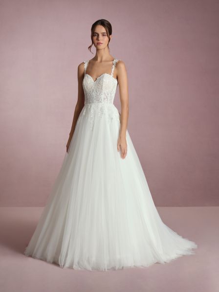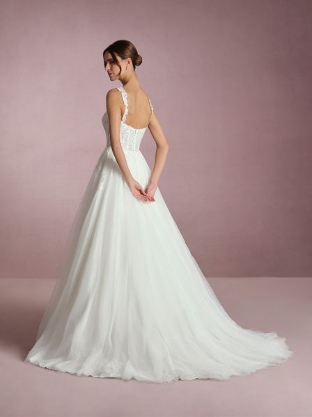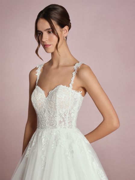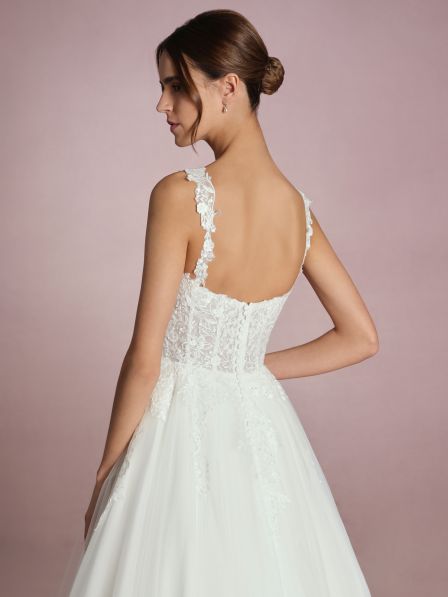Un abito da sposa che incarna la delicatezza e il romanticismo con ogni dettaglio. Il corpetto, finemente ricamato con motivi floreali, presenta una scollatura a cuore che valorizza con grazia il décolleté. Le spalline, decorate con eleganti applicazioni, aggiungono un tocco di sofisticatezza, offrendo un supporto discreto e valorizzando le spalle con un dettaglio raffinato.